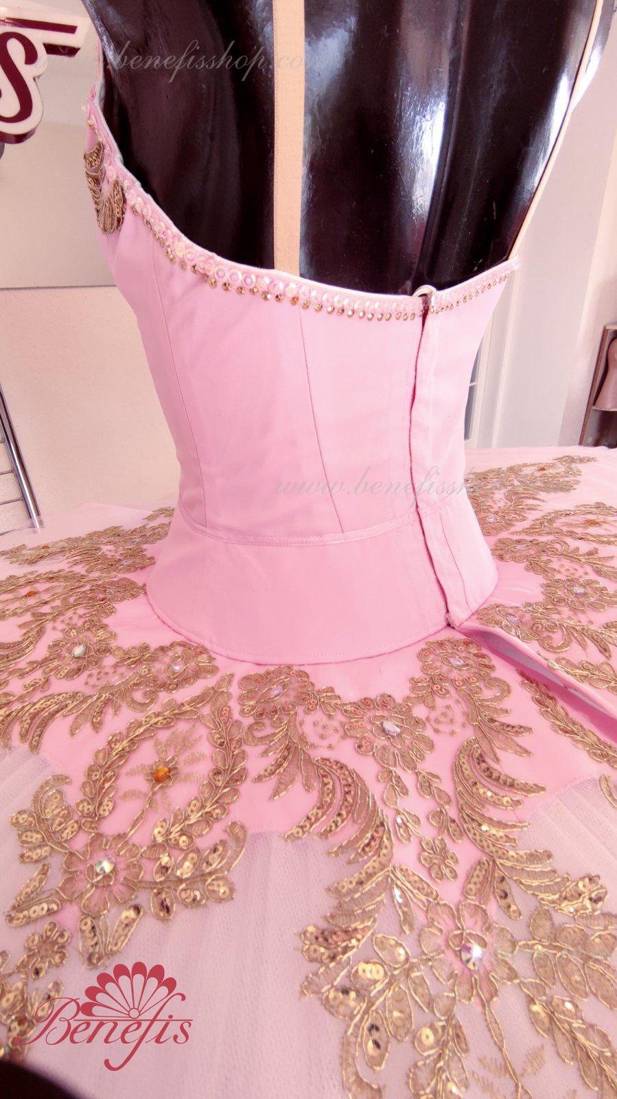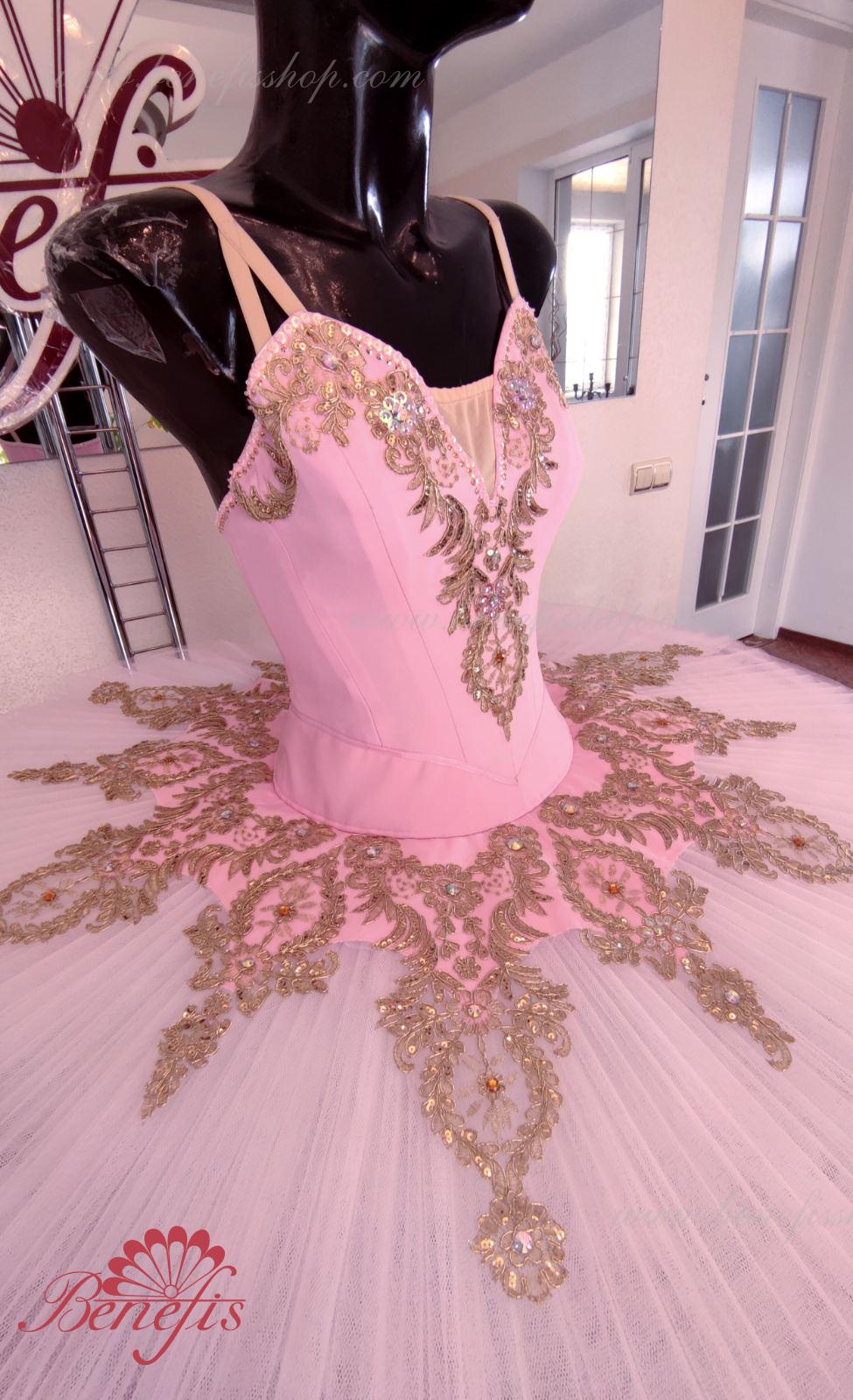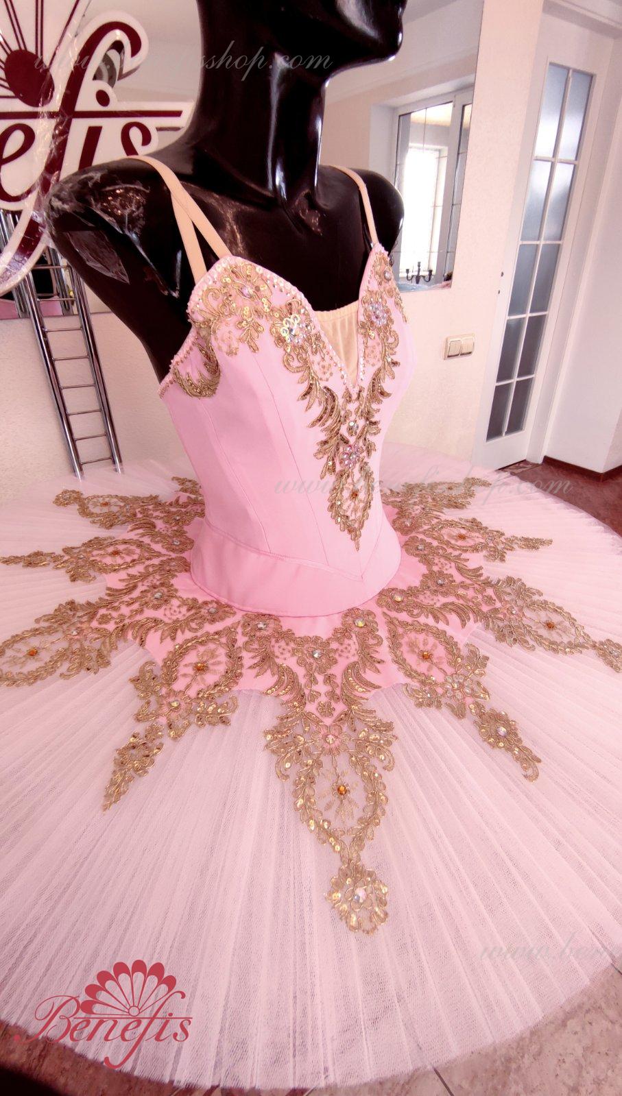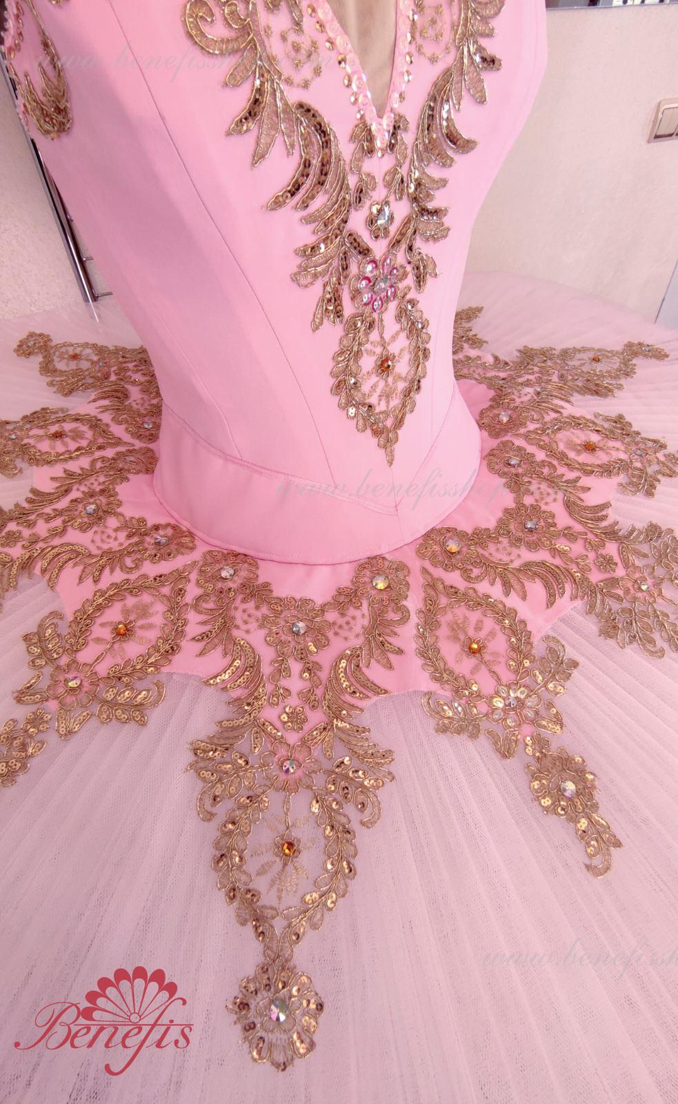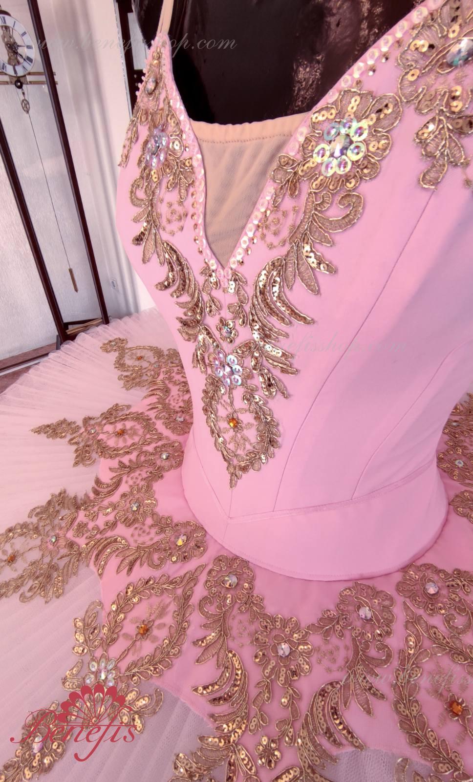 Details: costume. Bodice with embossed lines and decorative belt trim. The bodice is made of semi-elastic fabric. Eight pleated graduated layers of semi-soft tulle- seven long and one short on tulle panties with a 10 cm yoke attached to an elastic waistband. Two crinoline hoops are embedded in the middle layer with two additional short frills at the edges. The length of the top layer is 36-38 cm, each subsequent layer is 4 cm shorter. The tutu is fastened at the back with 6 large hooks and loops. The decor is made of gold guipure, cut-out fragments, sequins, rhinestones.
