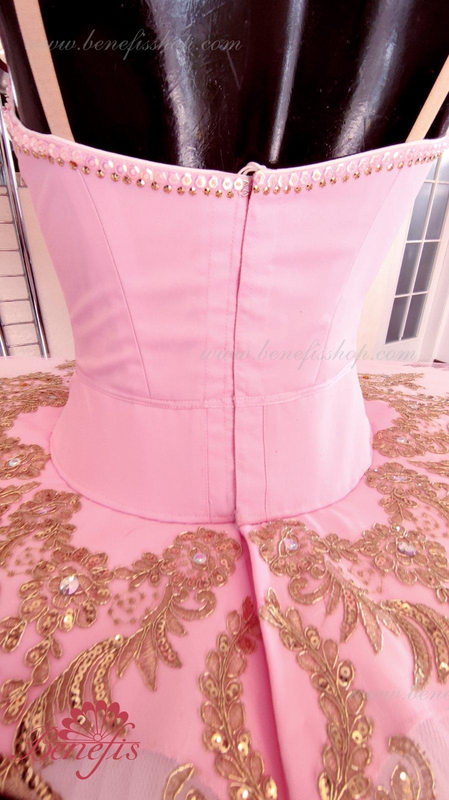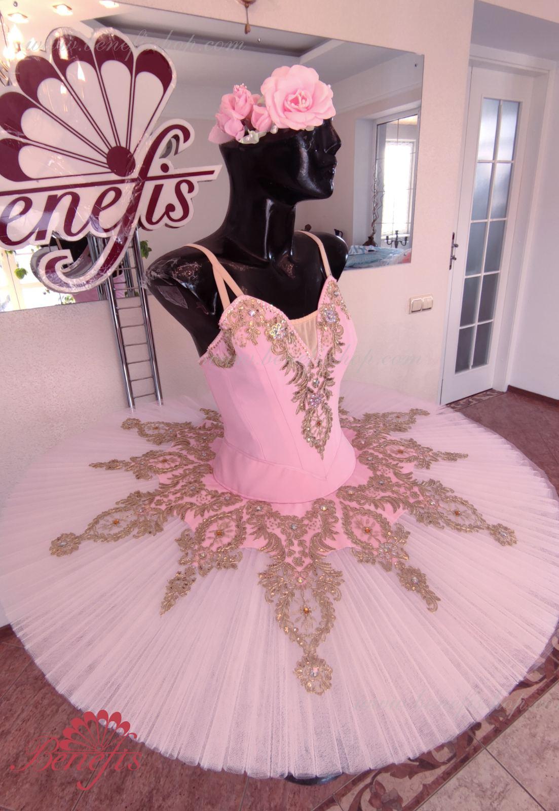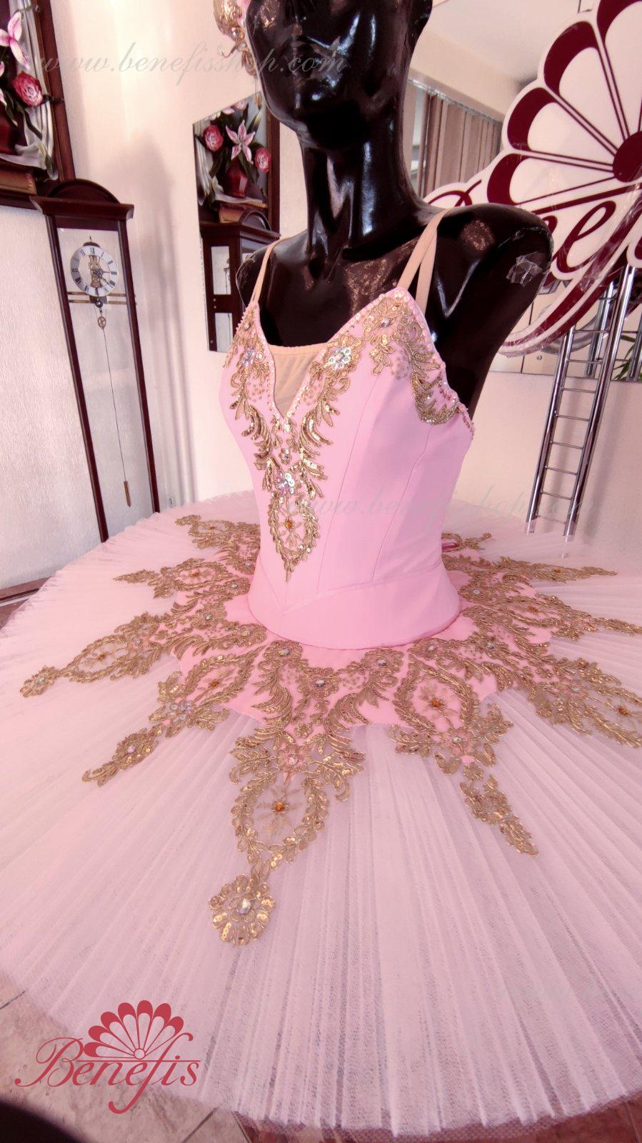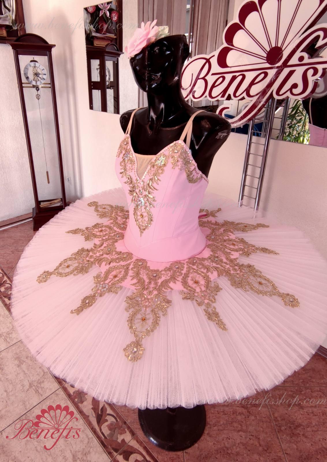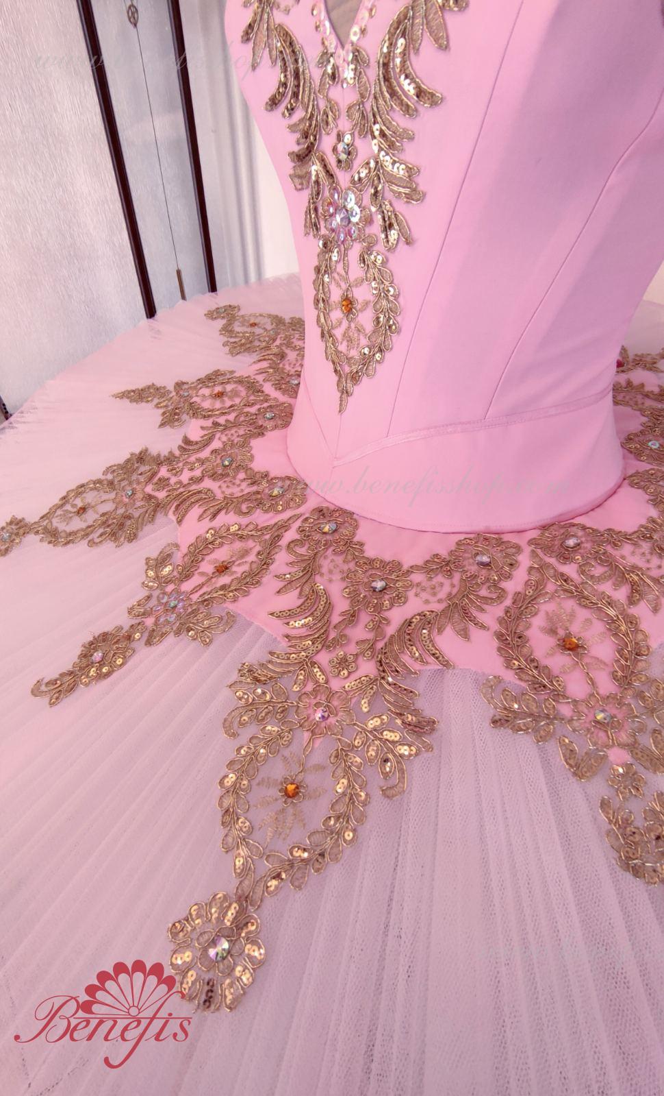 Details: costume. Bodice with embossed lines and decorative belt trim. The bodice is made of semi-elastic fabric. Eight pleated graduated layers of semi-soft tulle- seven long and one short on tulle panties with a 10 cm yoke attached to an elastic waistband. Two crinoline hoops are embedded in the middle layer with two additional short frills at the edges. The length of the top layer is 36-38 cm, each subsequent layer is 4 cm shorter. The tutu is fastened at the back with 6 large hooks and loops. The decor is made of gold guipure, cut-out fragments, sequins, rhinestones.