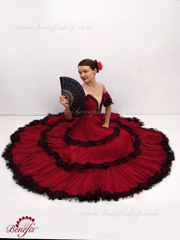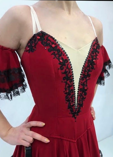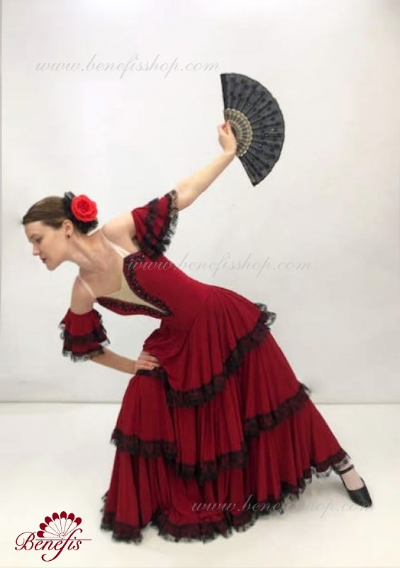 Spanish dress made of elastic fabric hb 1.5 cm skirt, with three ruffles decorated with black lace.