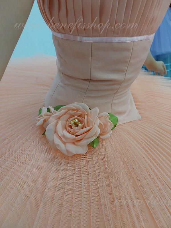 Corsetul este realizat pe curele elastice de culoare pielii. Partea superioară a corsetului este realizată din șifon și decorată cu flori și volane.