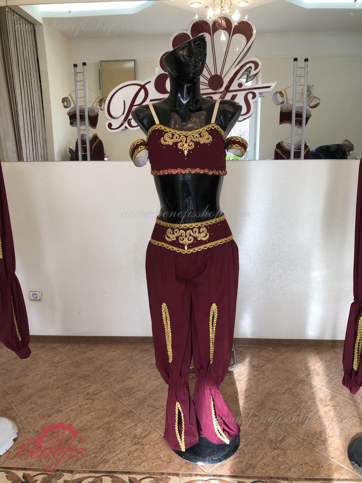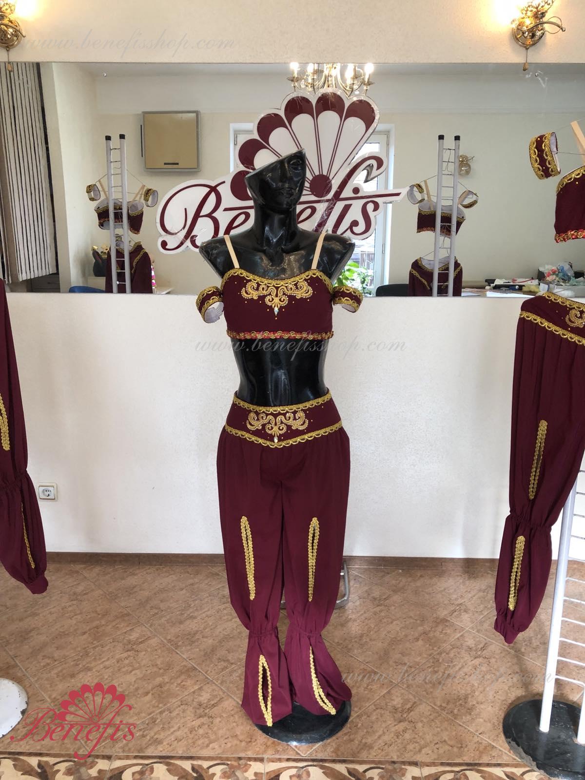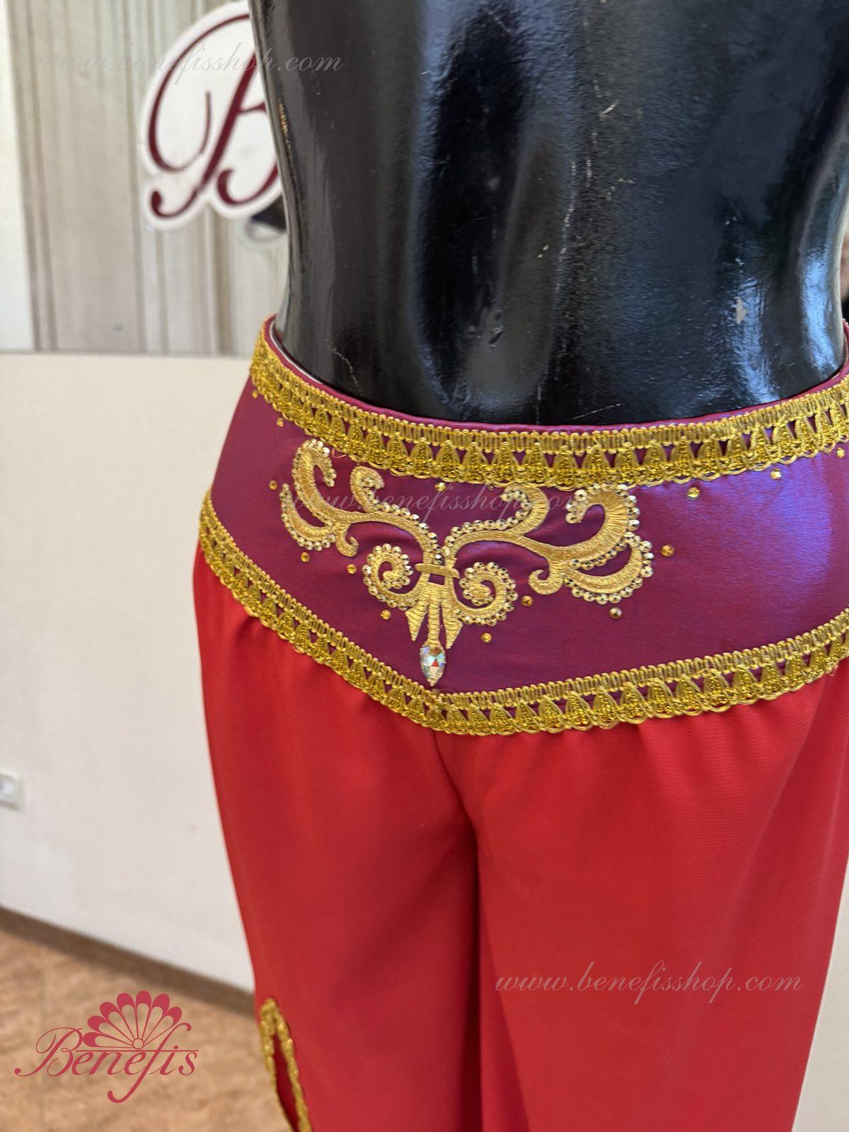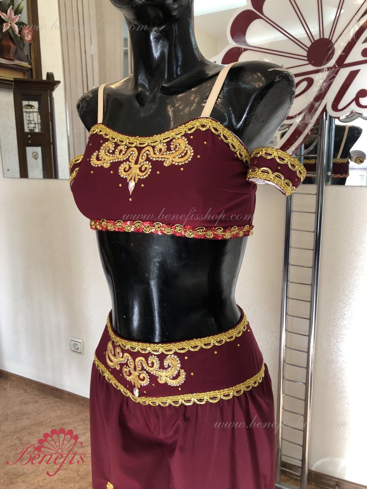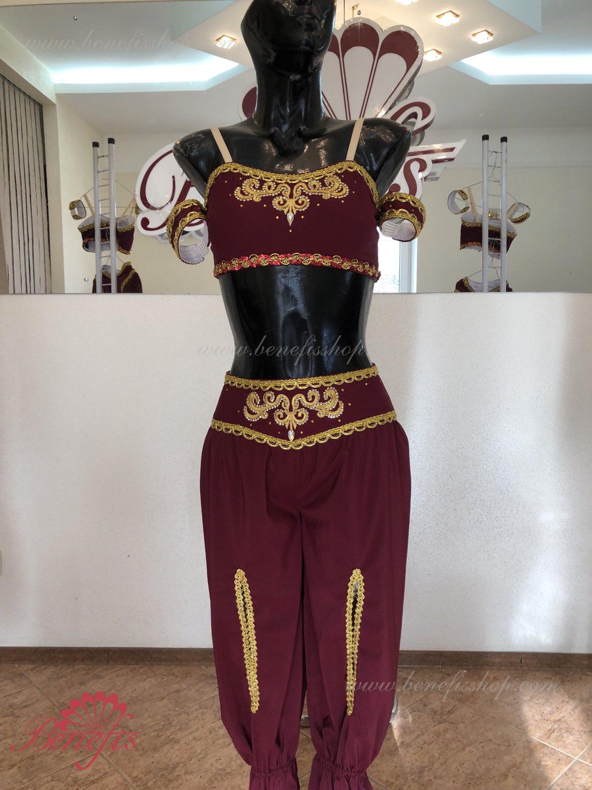 Detalii: Top, jug,mansete, pantaloni. Un vârf biflex.Articolul decorativ pentru cap nu este inclusă în prețul costumului. Pantaloni cu jug pe șolduri, din sifon cu fante verticale împodobite cu dantelă în față. Manșete F0017A. strasurile, mărgelele și împletitura aurie sunt folosite pentru a crea o compoziție artistică modelată în stil oriental pe corset și pe centură.