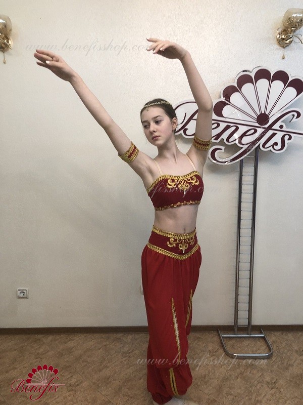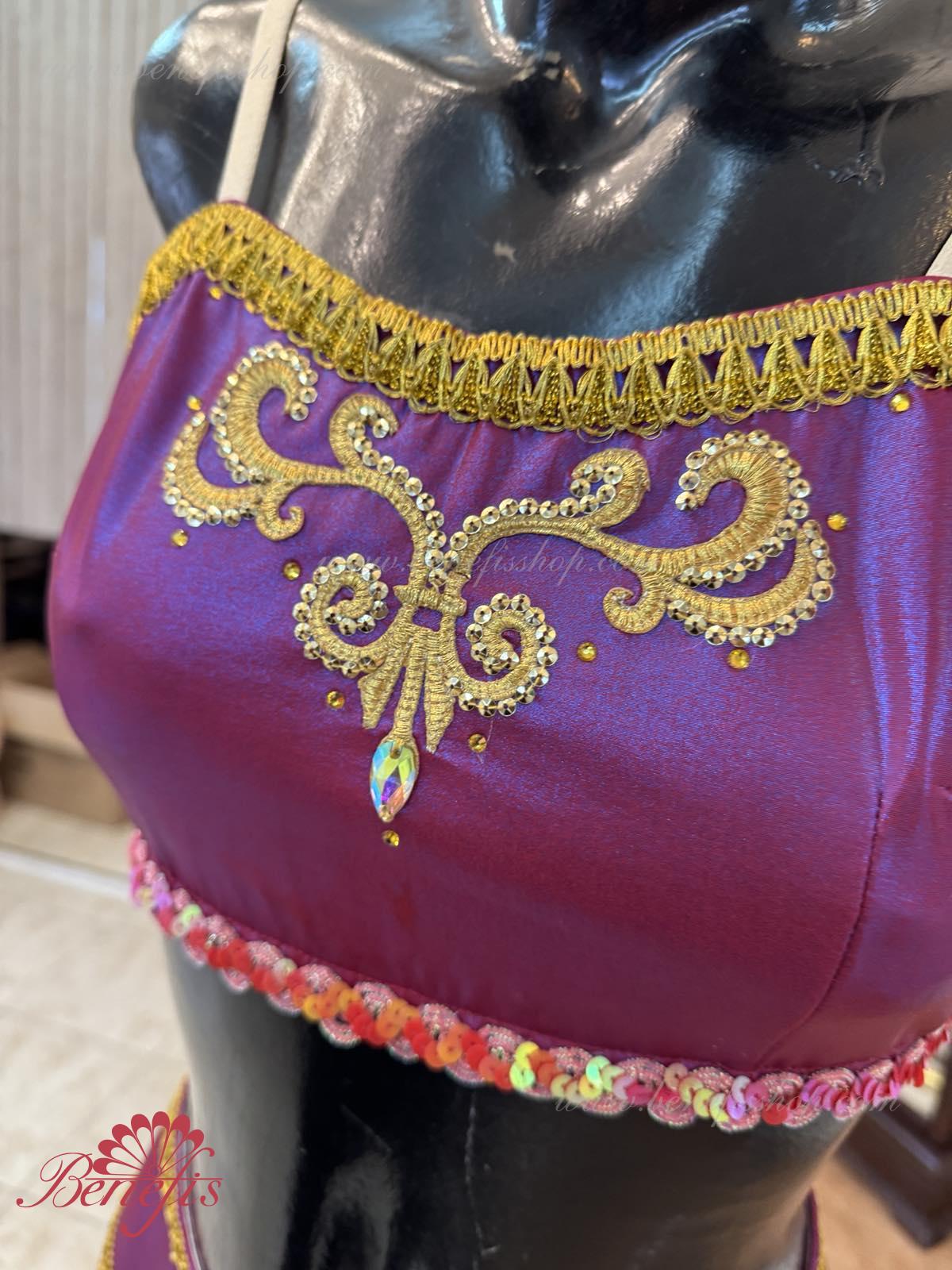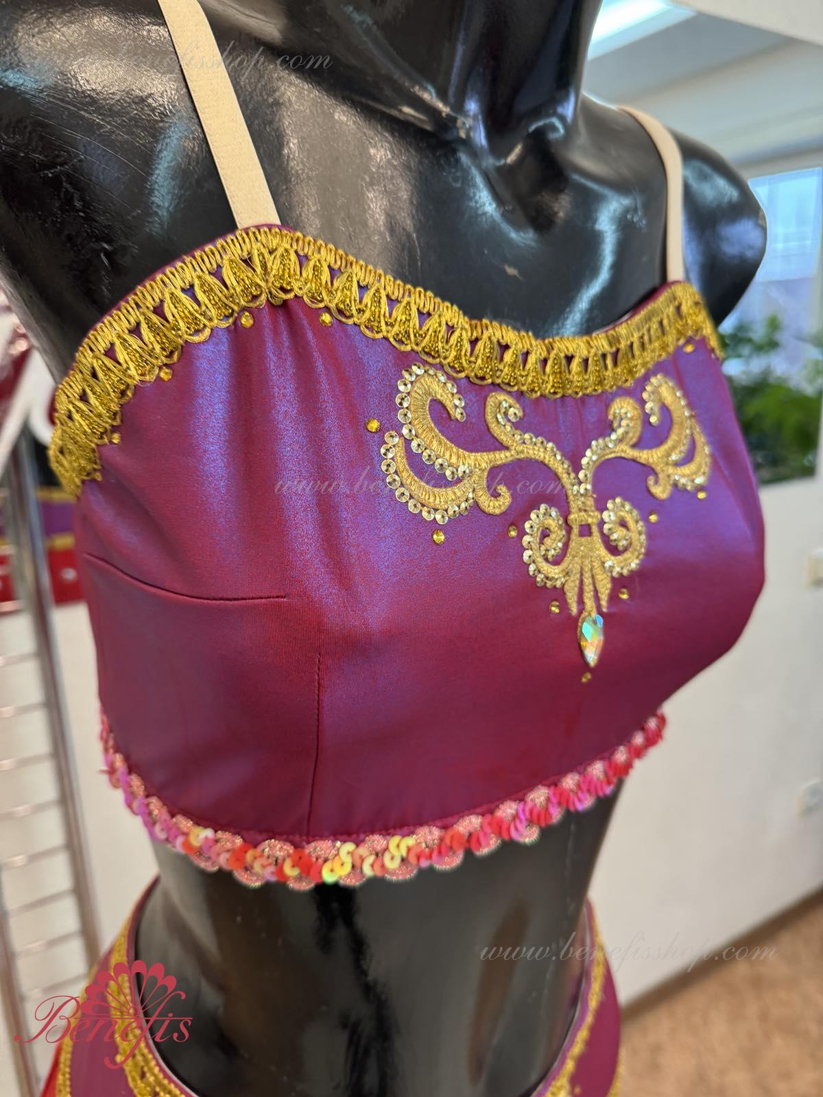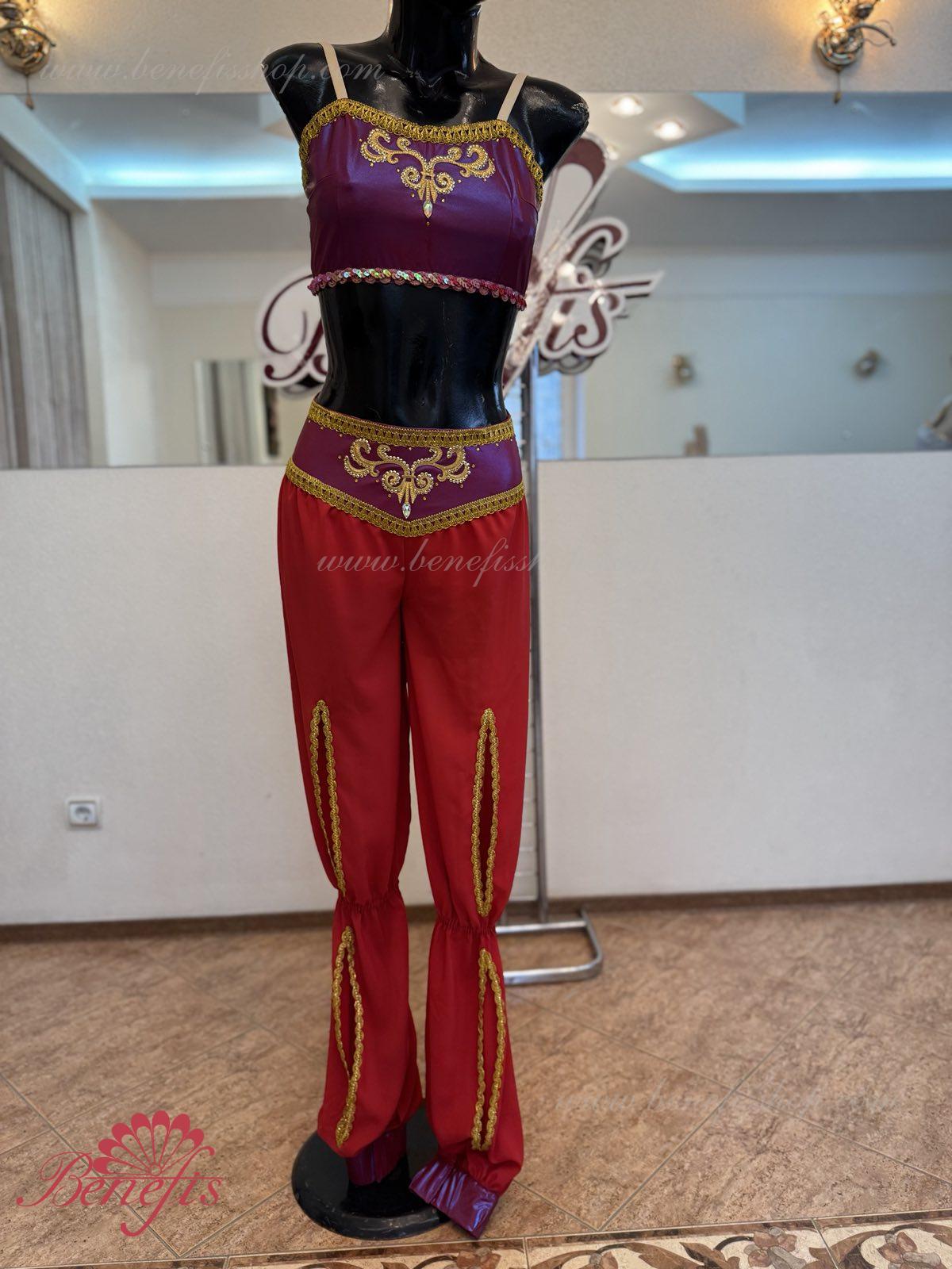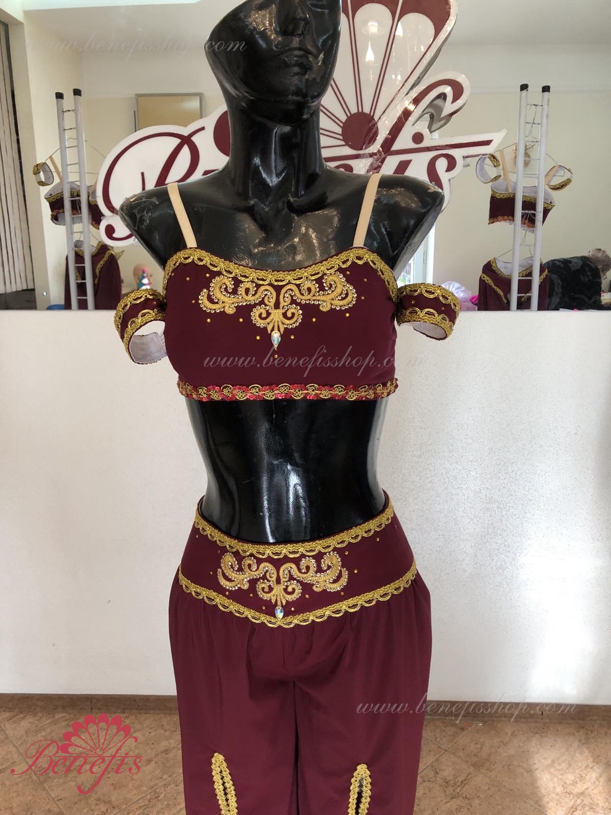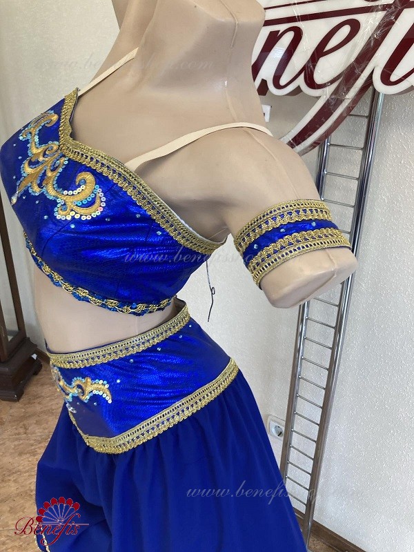 Detalii: Top, jug,mansete, pantaloni. Un vârf biflex.Articolul decorativ pentru cap nu este inclusă în prețul costumului. Pantaloni cu jug pe șolduri, din sifon cu fante verticale împodobite cu dantelă în față. Manșete F0017A. strasurile, mărgelele și împletitura aurie sunt folosite pentru a crea o compoziție artistică modelată în stil oriental pe corset și pe centură.
