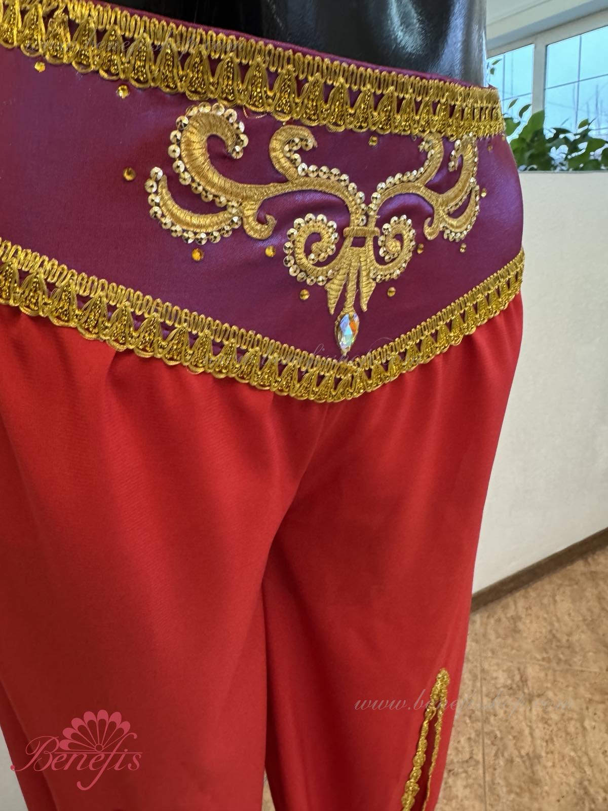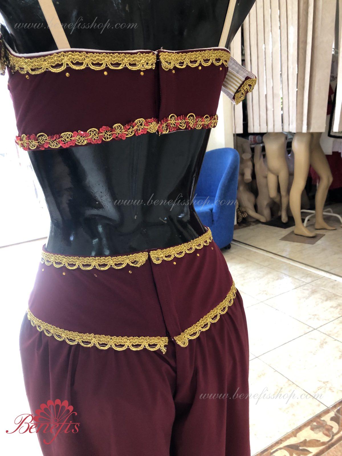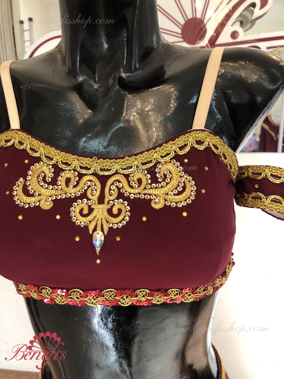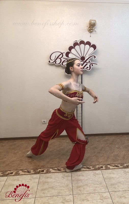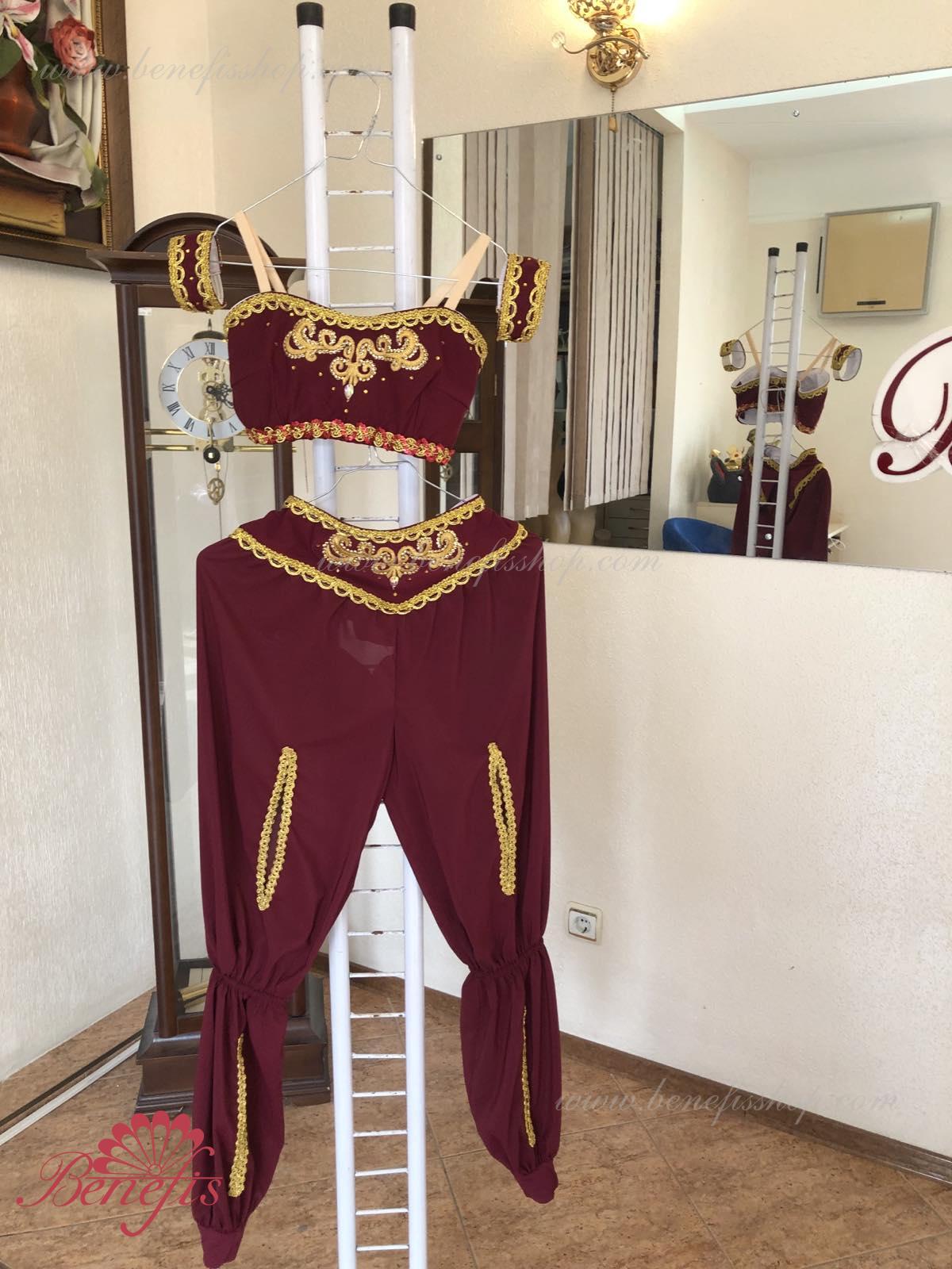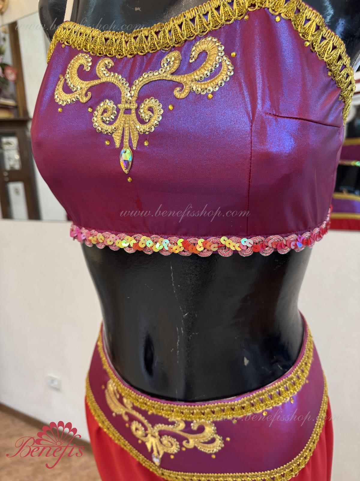Detalii: Top, jug,mansete, pantaloni. Un vârf biflex.Articolul decorativ pentru cap nu este inclusă în prețul costumului. Pantaloni cu jug pe șolduri, din sifon cu fante verticale împodobite cu dantelă în față. Manșete F0017A. strasurile, mărgelele și împletitura aurie sunt folosite pentru a crea o compoziție artistică modelată în stil oriental pe corset și pe centură.