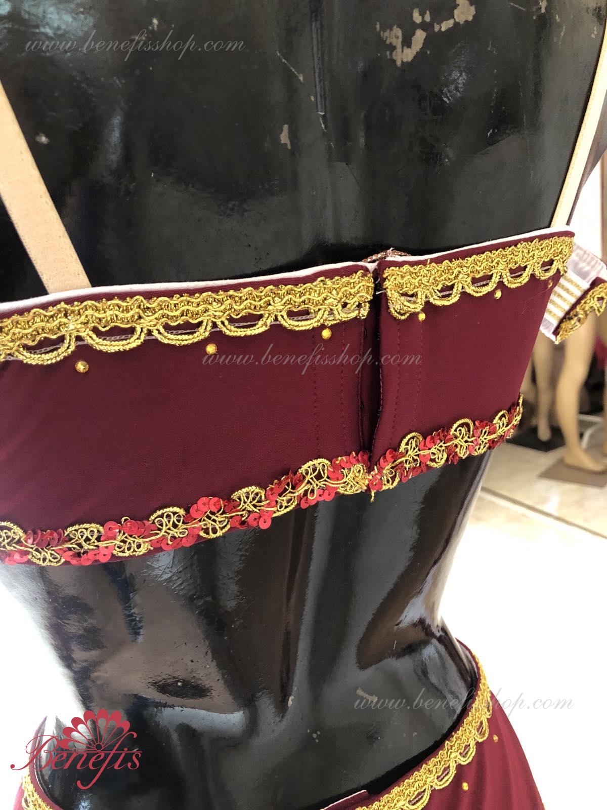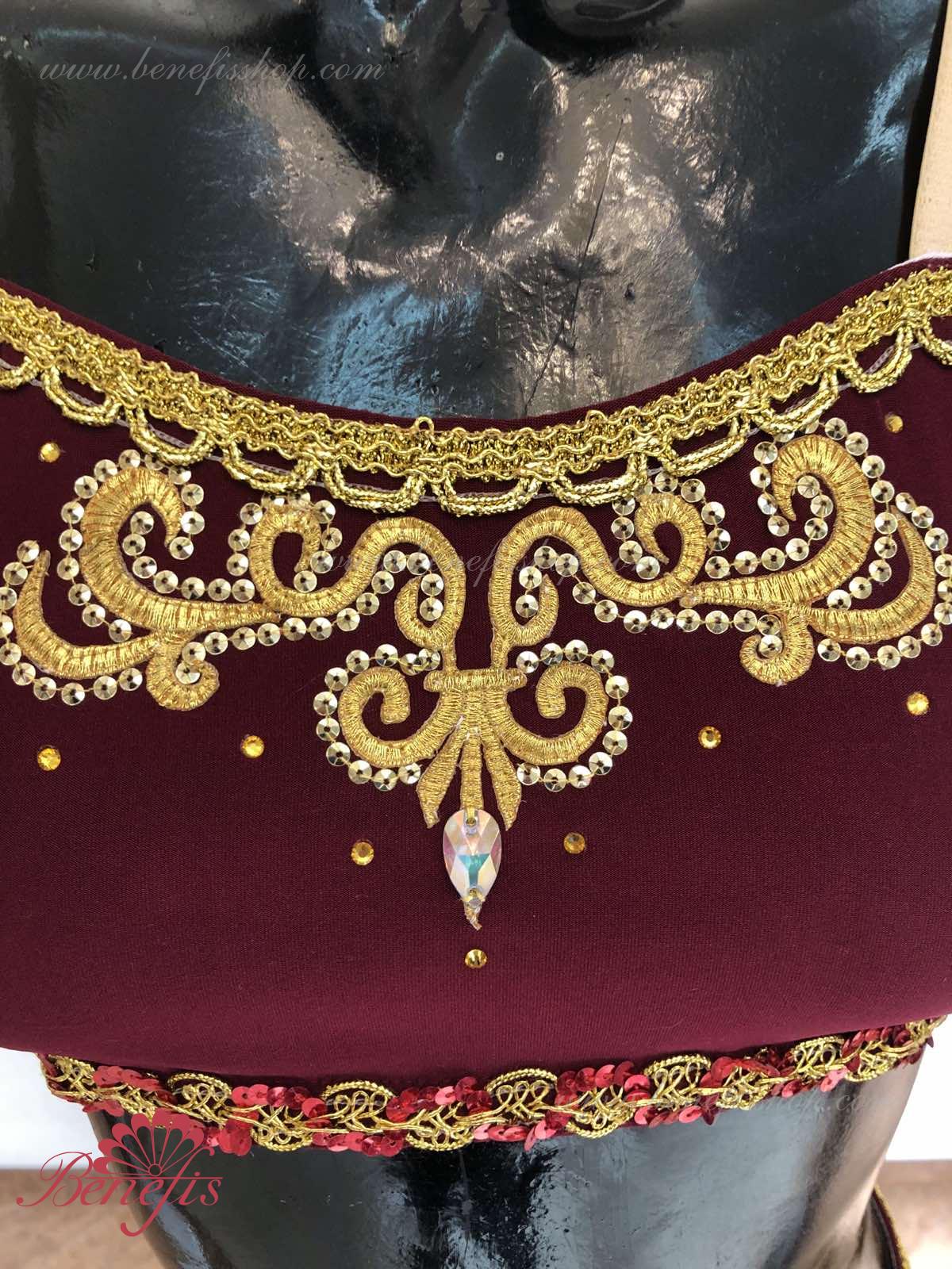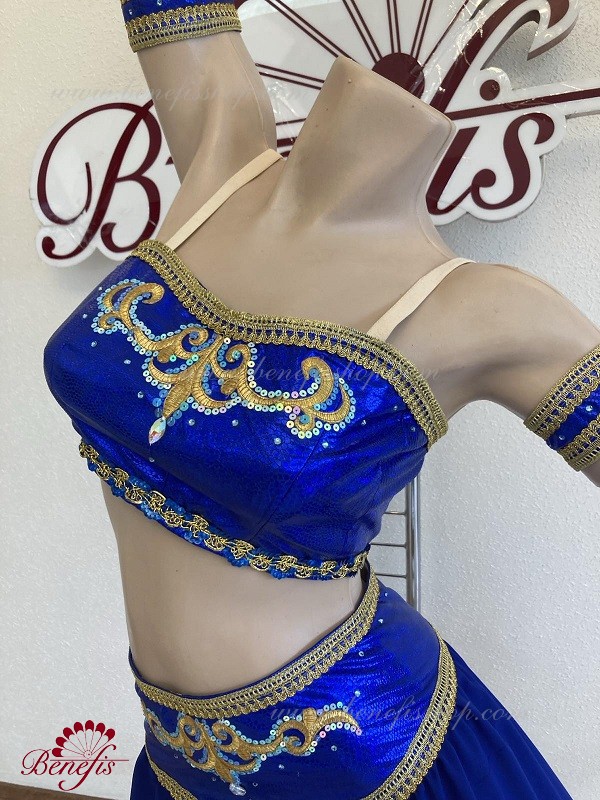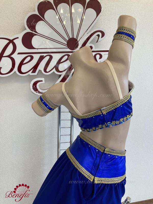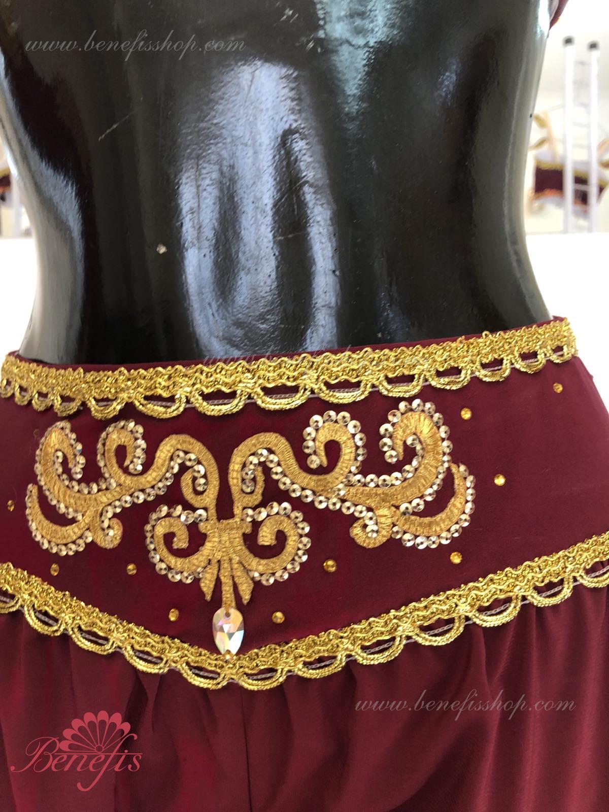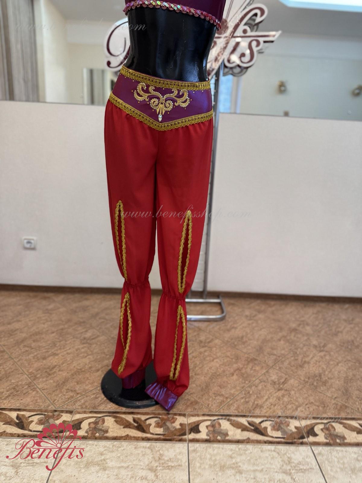 Detalii: Top, jug,mansete, pantaloni. Un vârf biflex.Articolul decorativ pentru cap nu este inclusă în prețul costumului. Pantaloni cu jug pe șolduri, din sifon cu fante verticale împodobite cu dantelă în față. Manșete F0017A. strasurile, mărgelele și împletitura aurie sunt folosite pentru a crea o compoziție artistică modelată în stil oriental pe corset și pe centură.