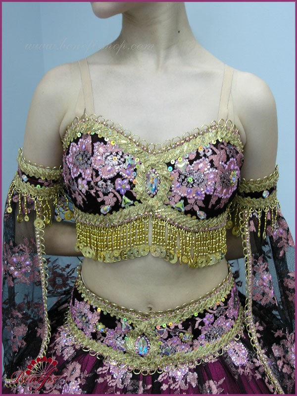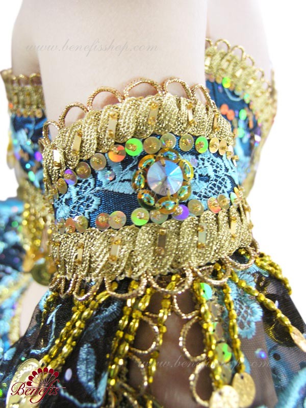 Corsetul sub piept se termină cu o margine de margele și margele de sticlă, care strălucesc cu nuanțe de aur și argint în timpul dansului.