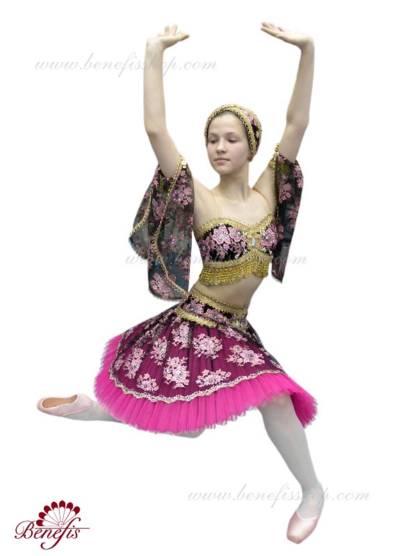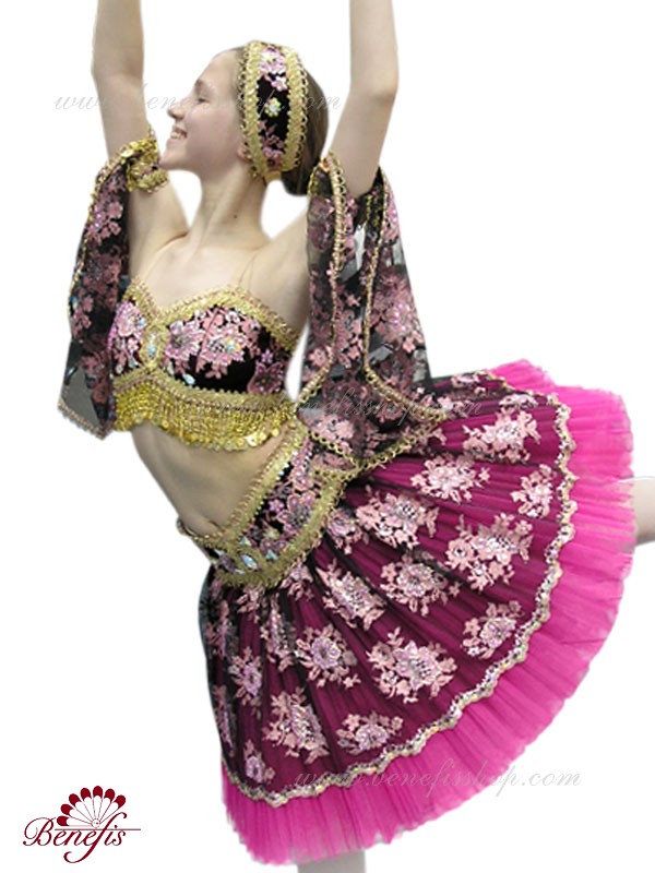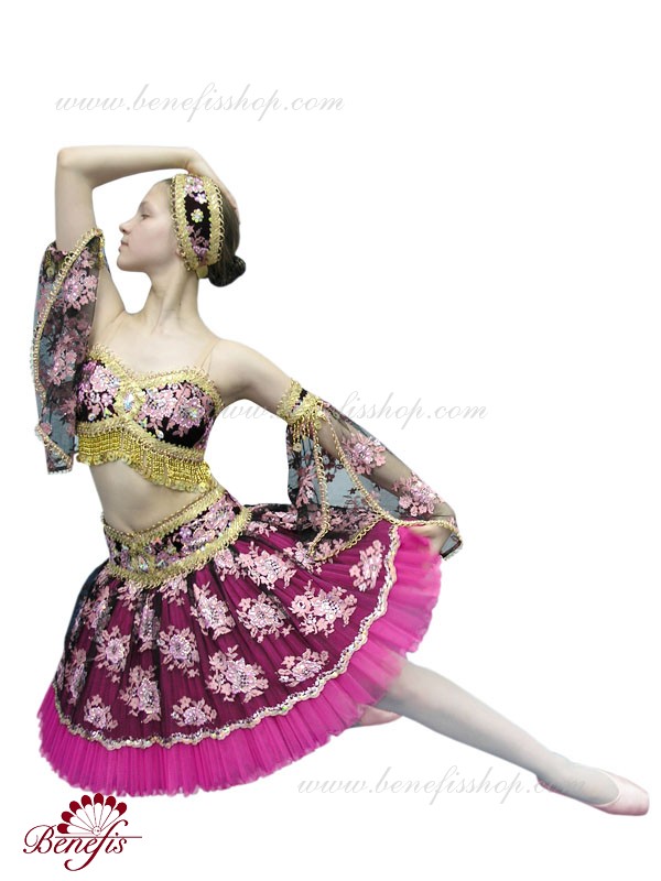 Costumul de balet luxos este realizat în cele mai bune tradiții orientale. Corsetul scurtat este realizat separat de fusta tutu, care se poarta pe solduri.