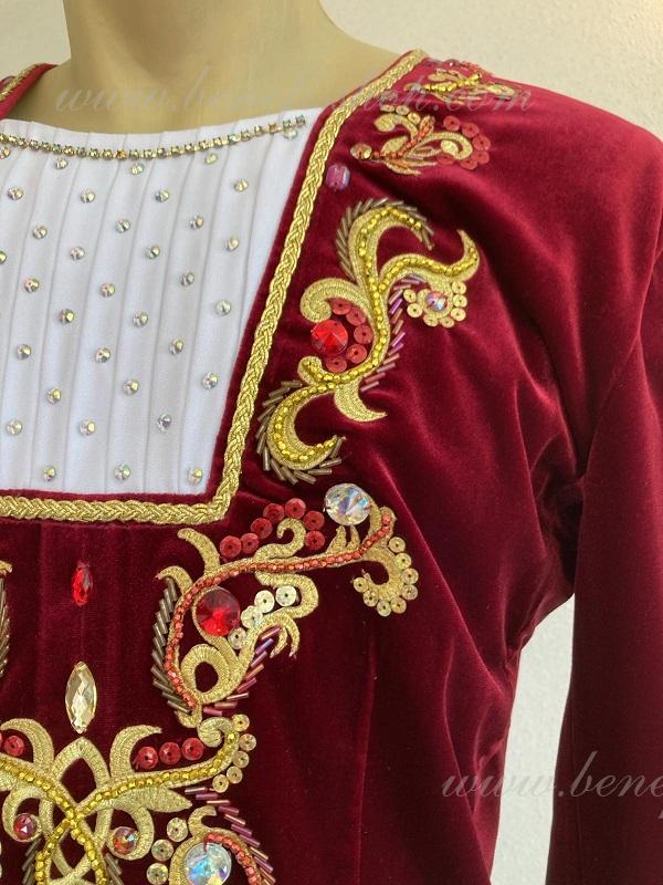 Jacheta este confectionata din catifea elastica densa cu insertie Alba crep-sifon pe piept si cu maneci crep –sifon sub cot.