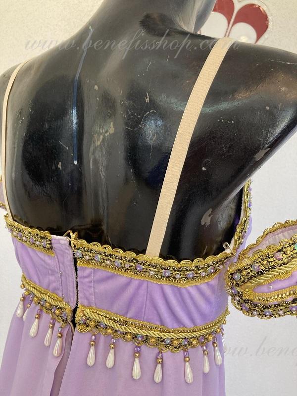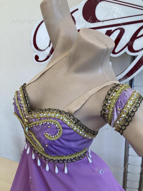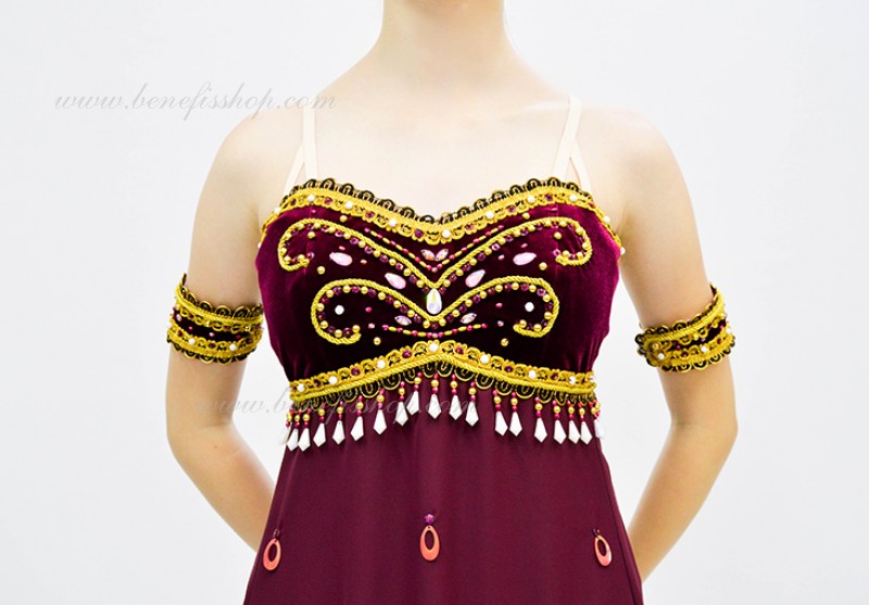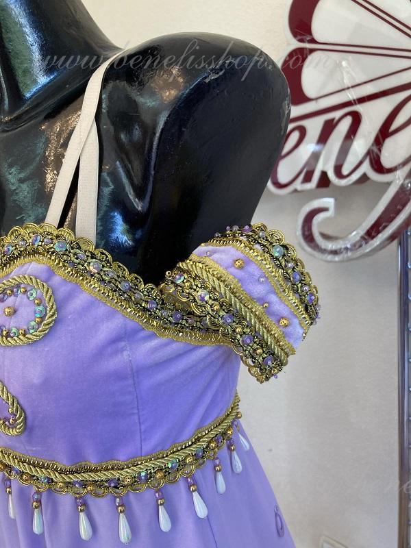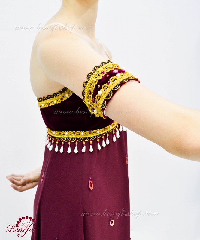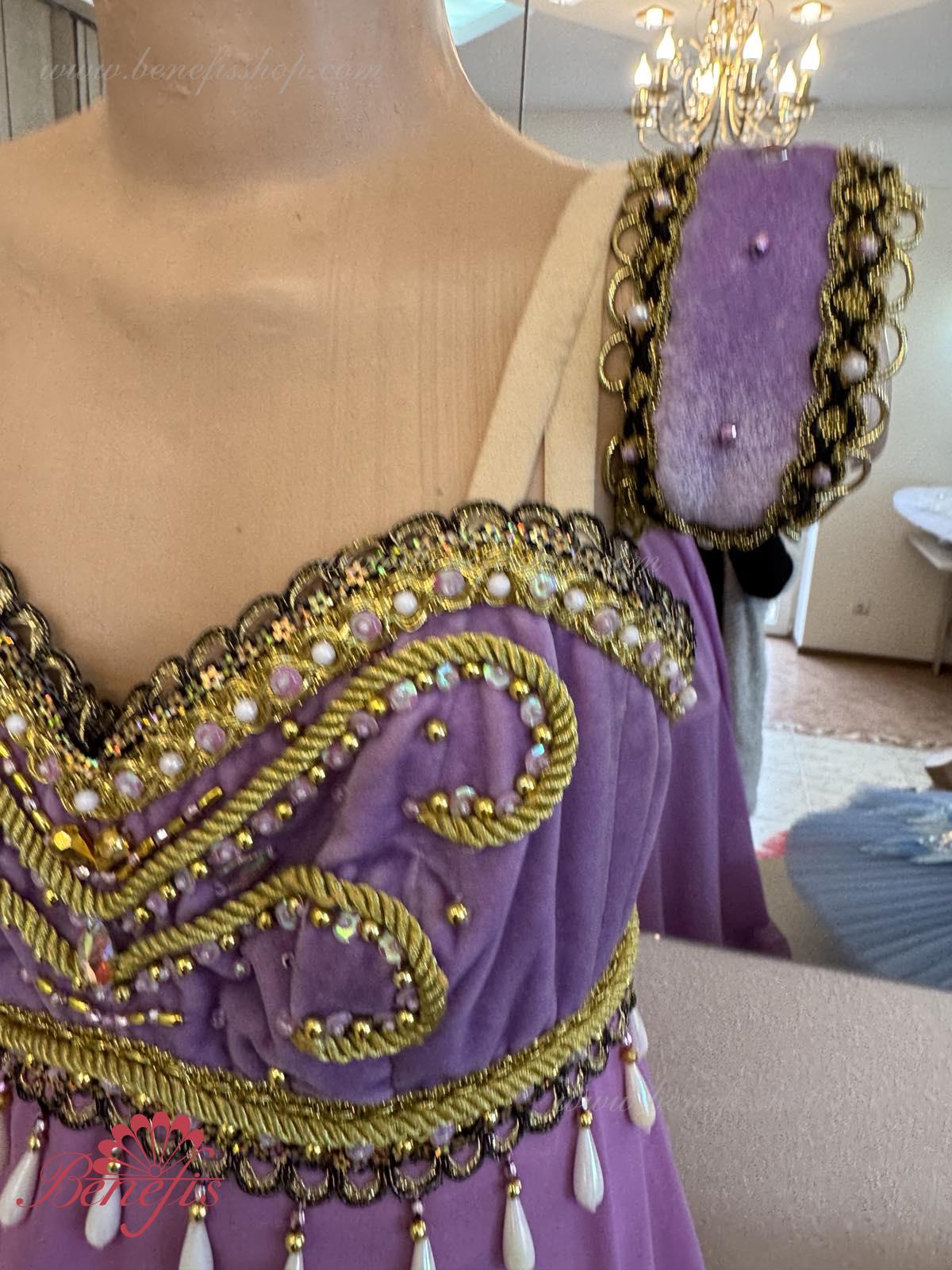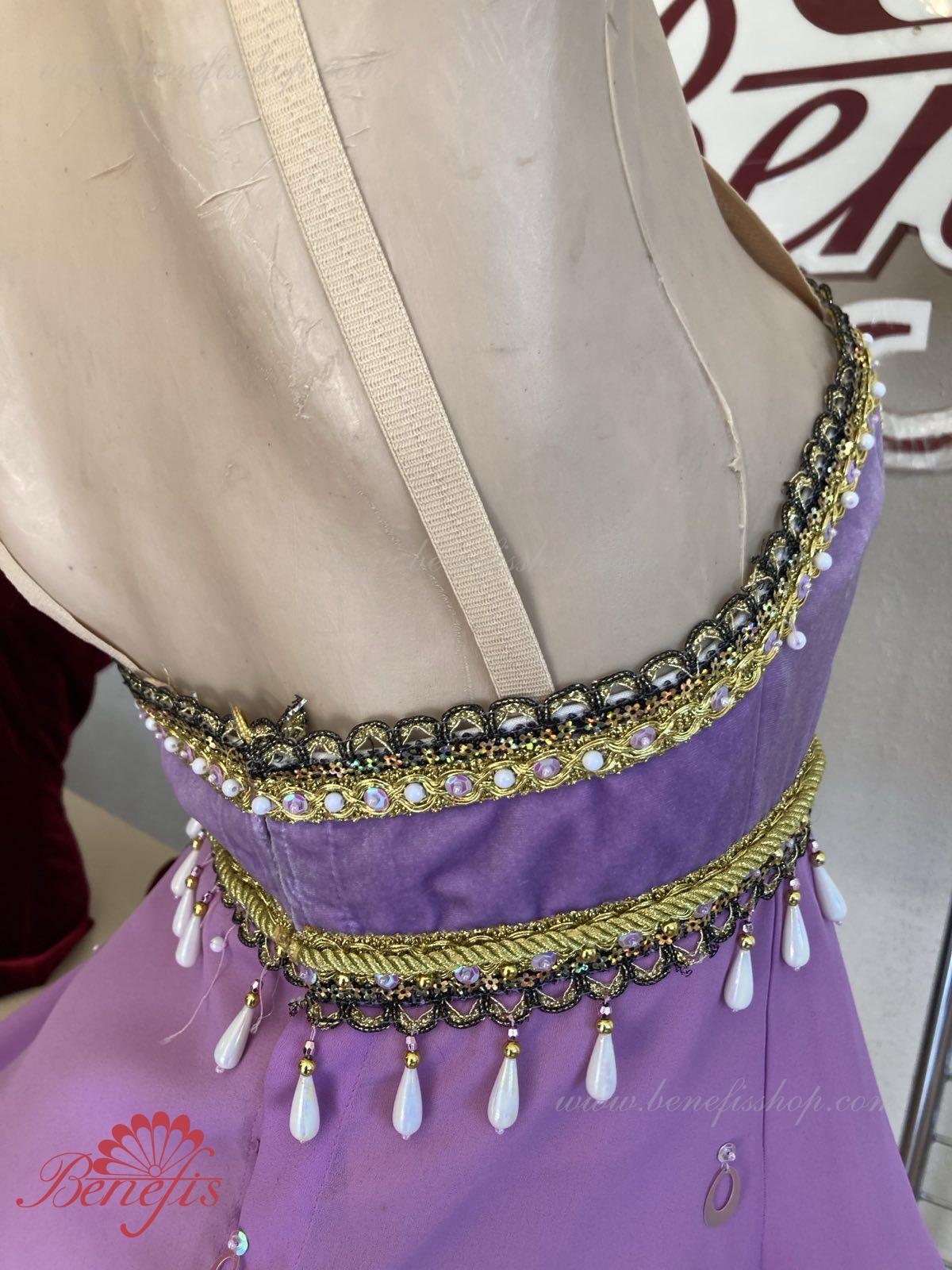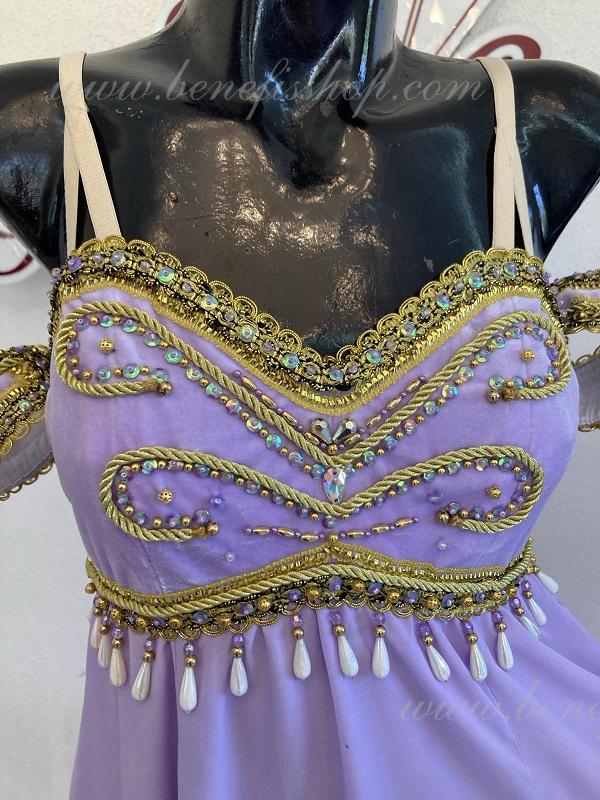 Această rochie profesională de balet cu jug umflat este realizată pe baza unui costum de baie biflex. Corsetul din zona pieptului este confecționat din catifea elastică, este împodobit cu o împletitură largă de aur și decorat cu paiete, mărgele, dantelă, strasuri.