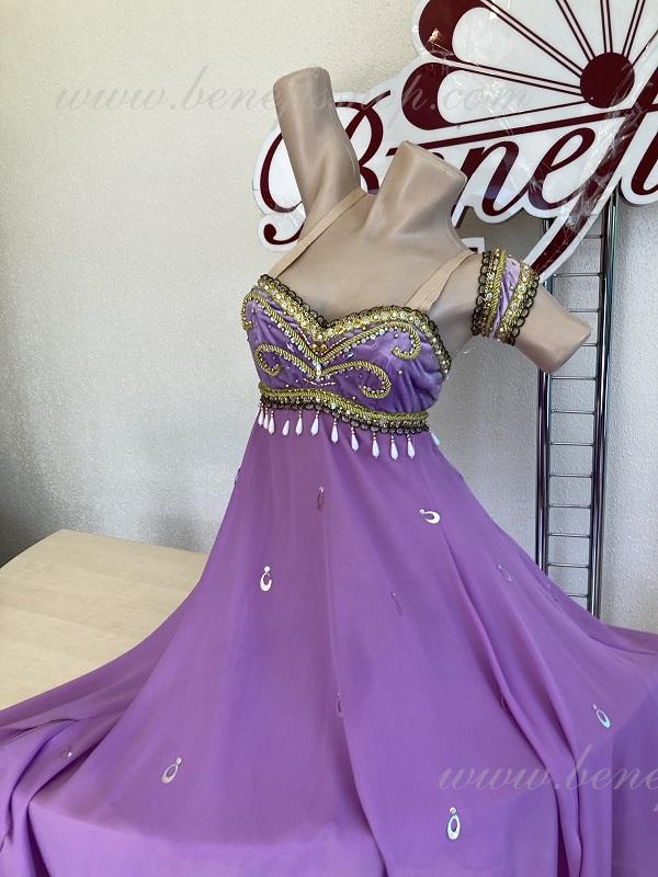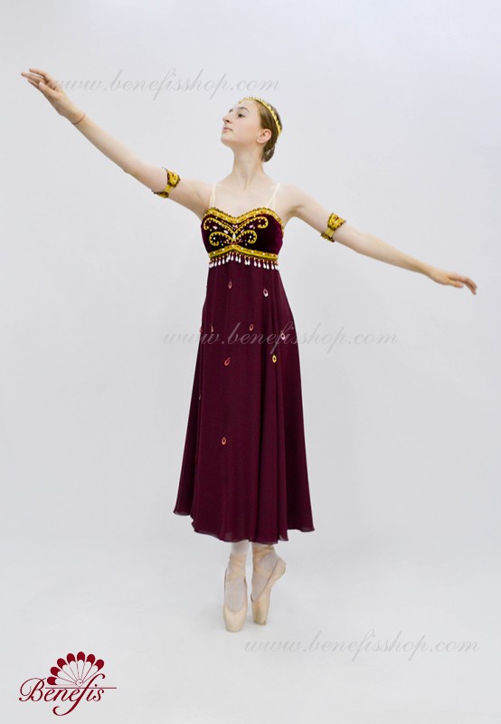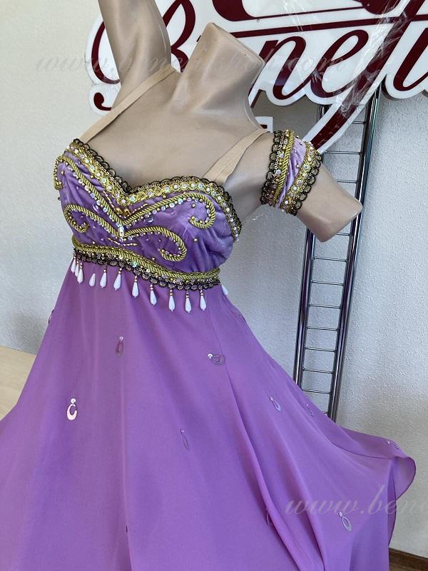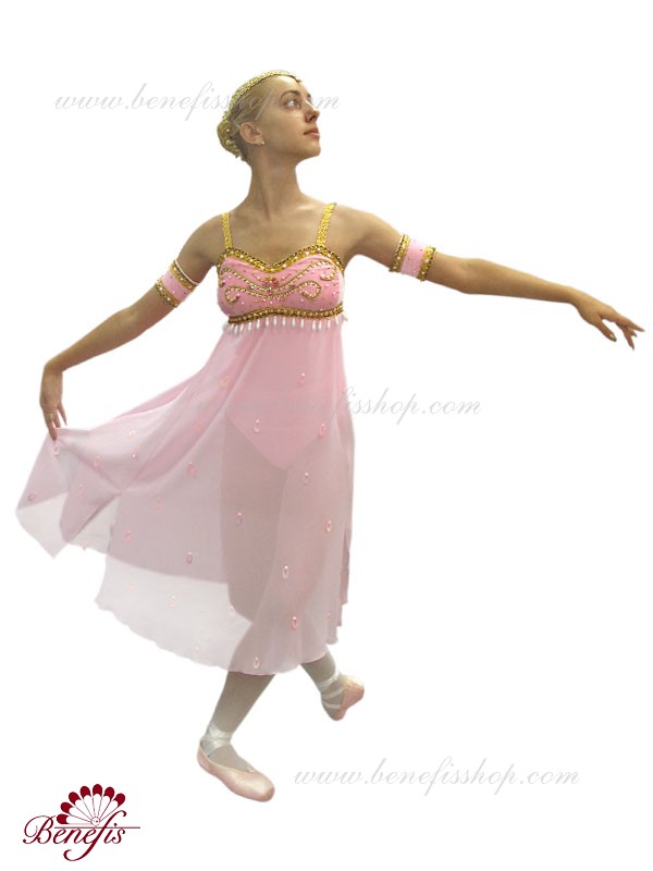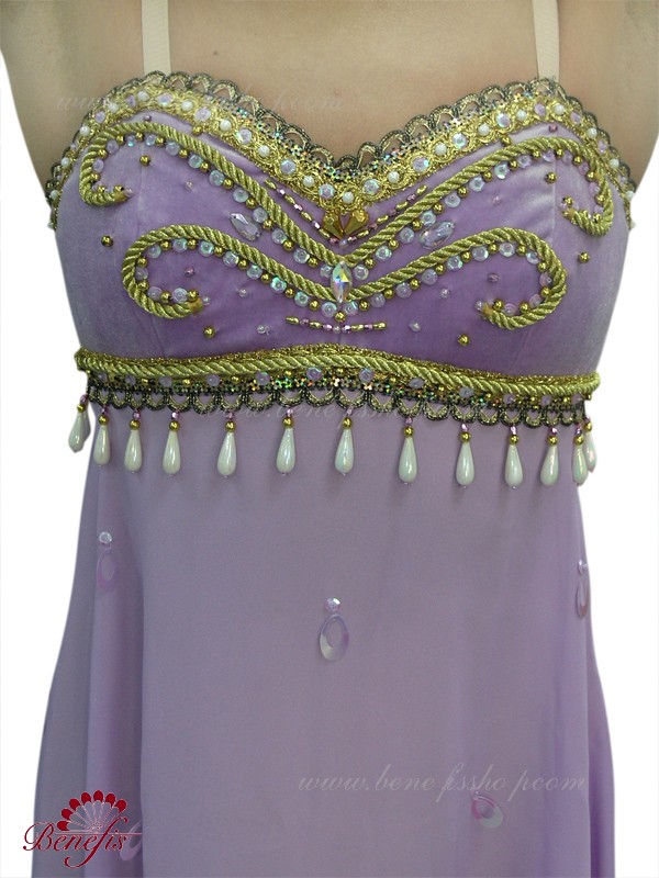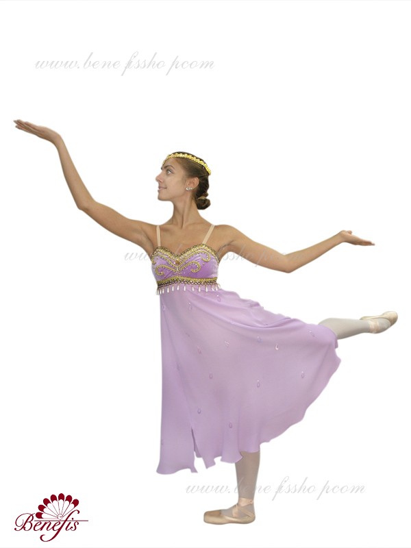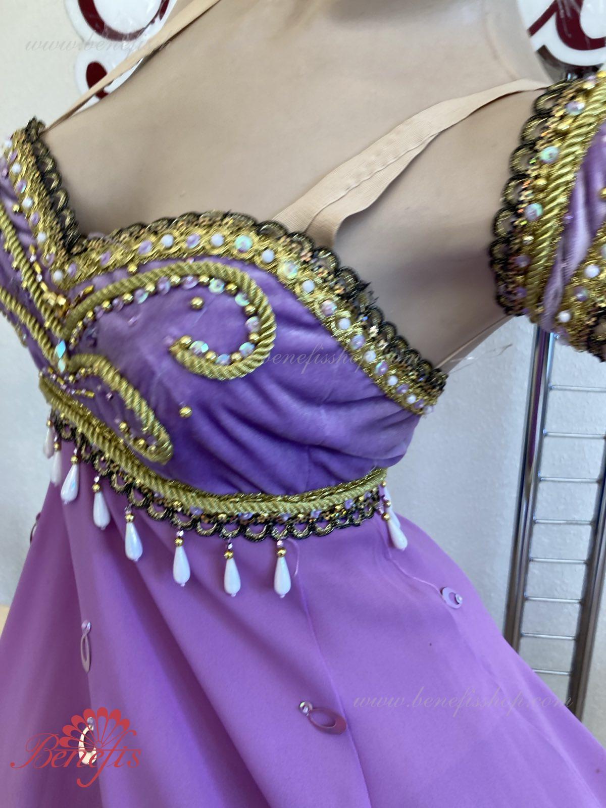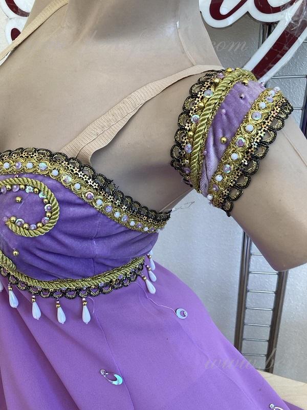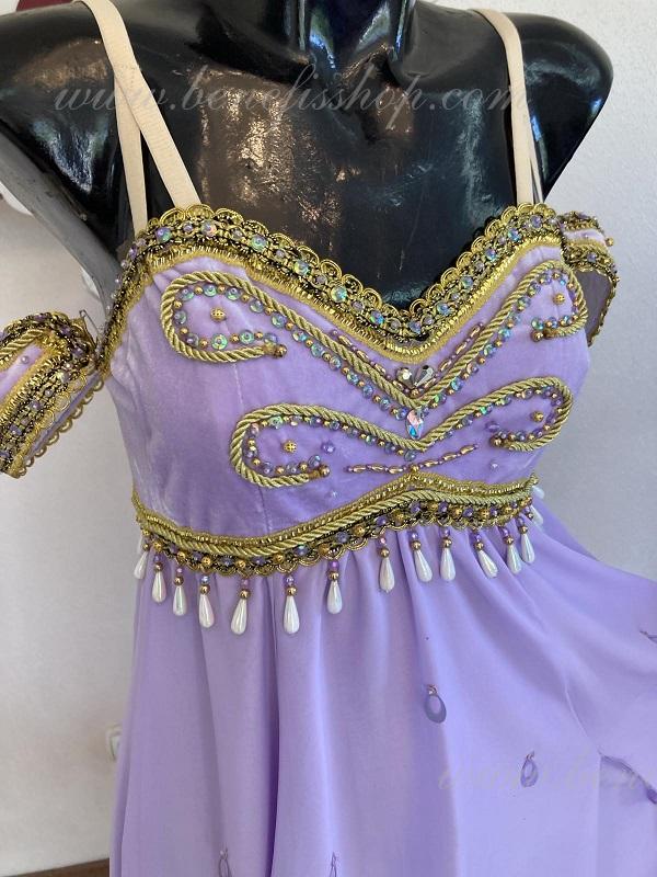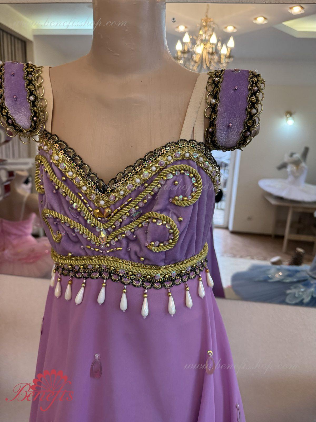 Această rochie profesională de balet cu jug umflat este realizată pe baza unui costum de baie biflex. Corsetul din zona pieptului este confecționat din catifea elastică, este împodobit cu o împletitură largă de aur și decorat cu paiete, mărgele, dantelă, strasuri.