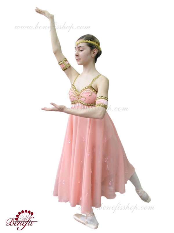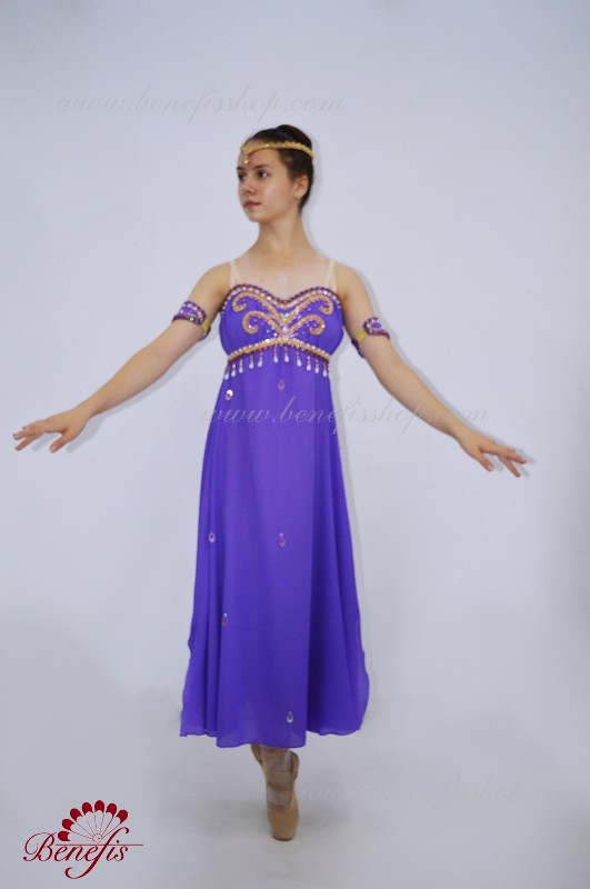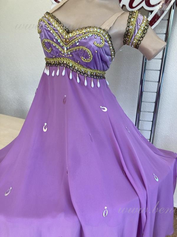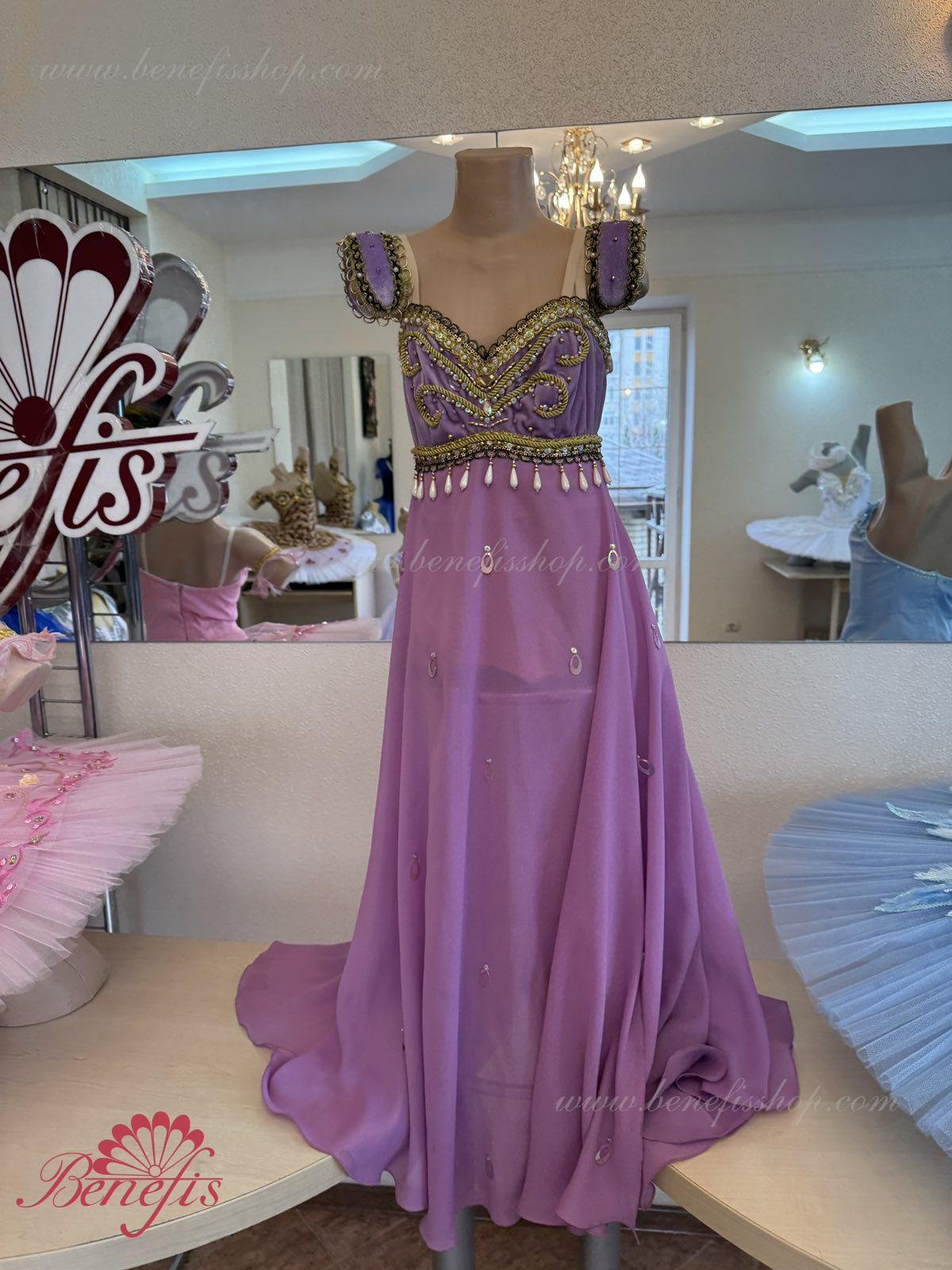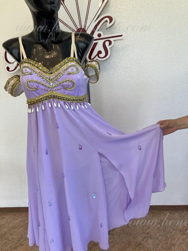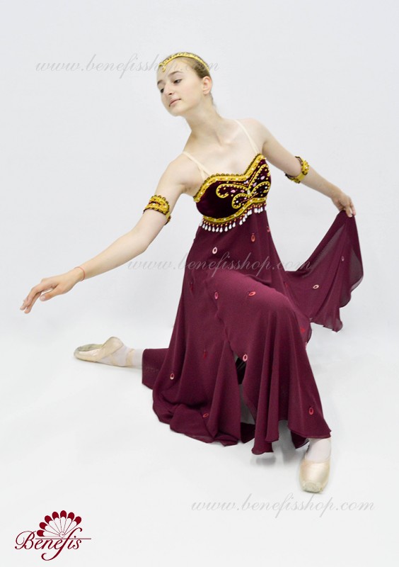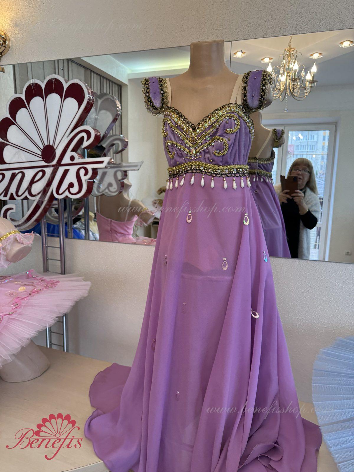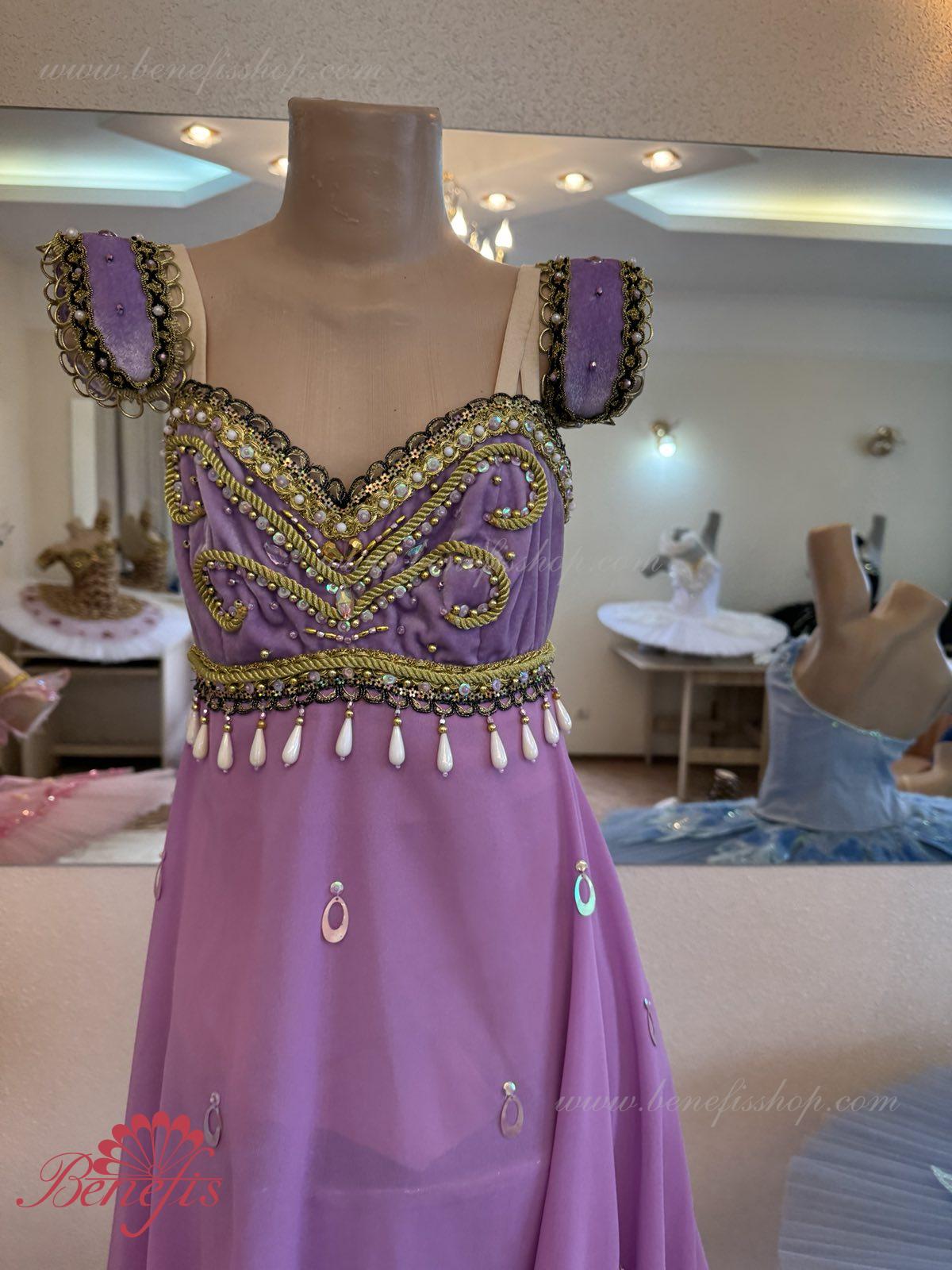 Această rochie profesională de balet cu jug umflat este realizată pe baza unui costum de baie biflex. Corsetul din zona pieptului este confecționat din catifea elastică, este împodobit cu o împletitură largă de aur și decorat cu paiete, mărgele, dantelă, strasuri.