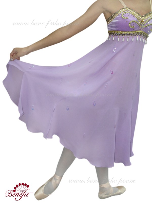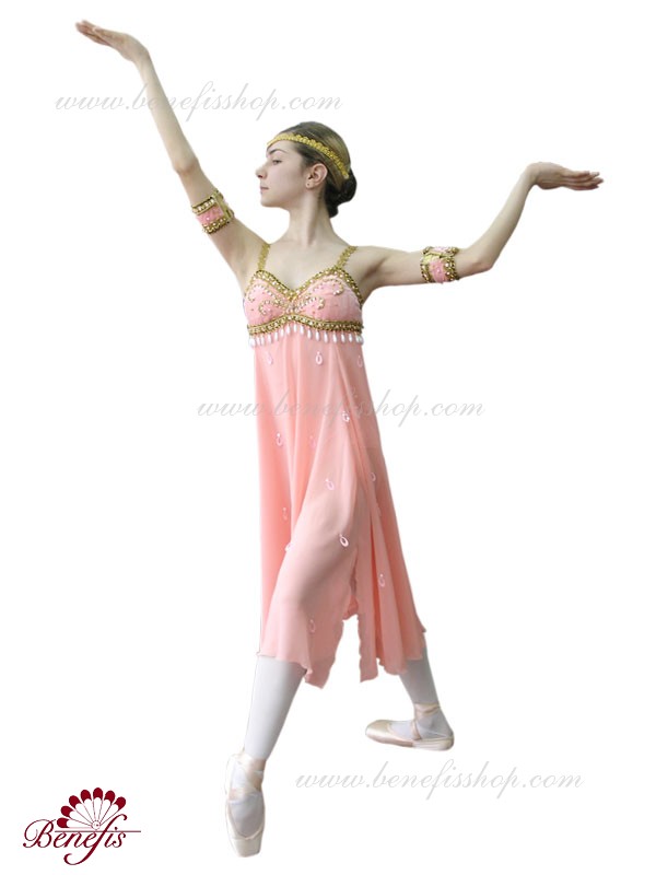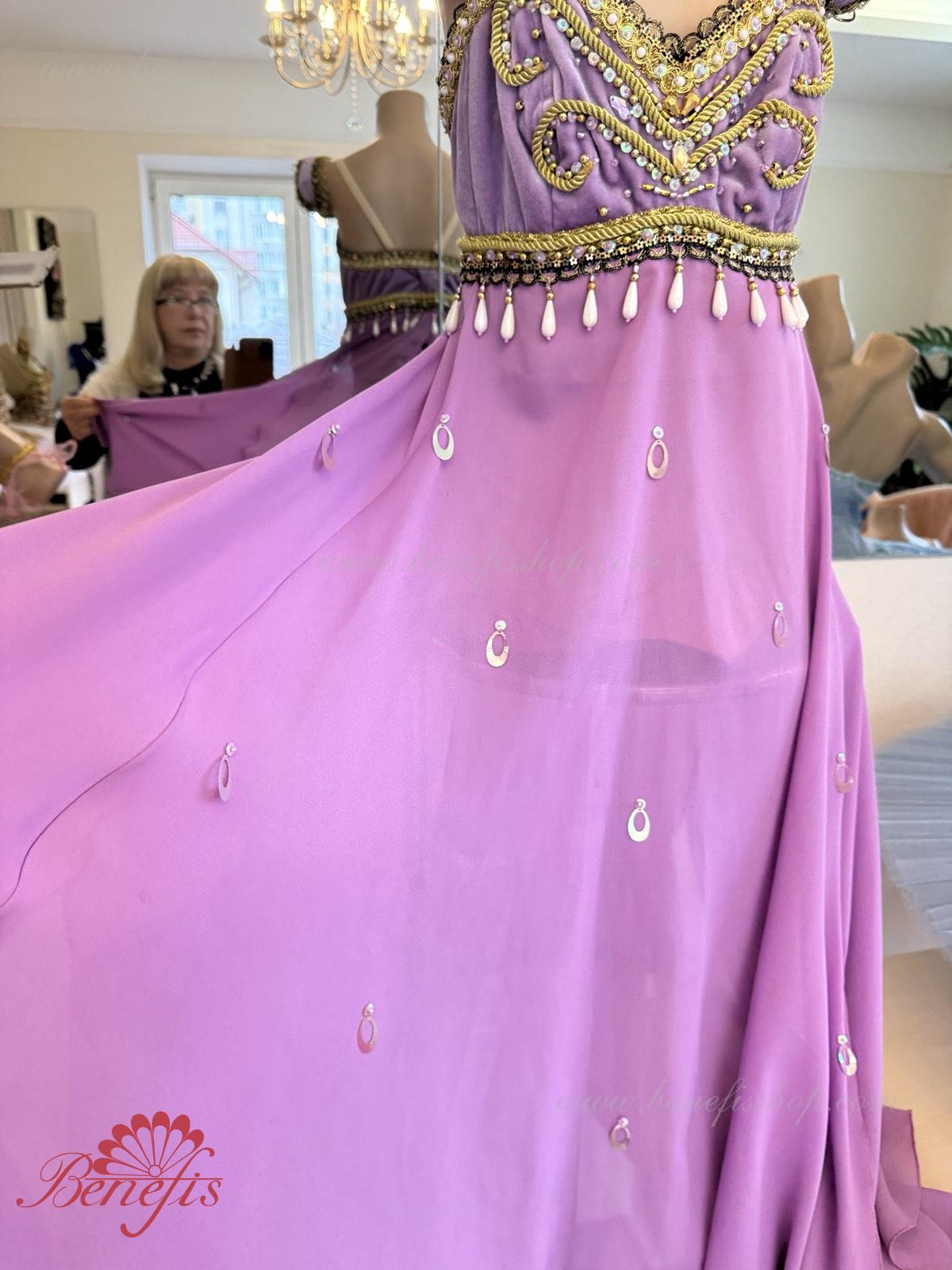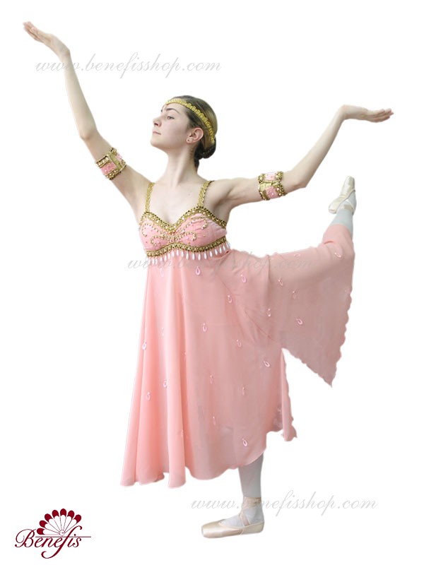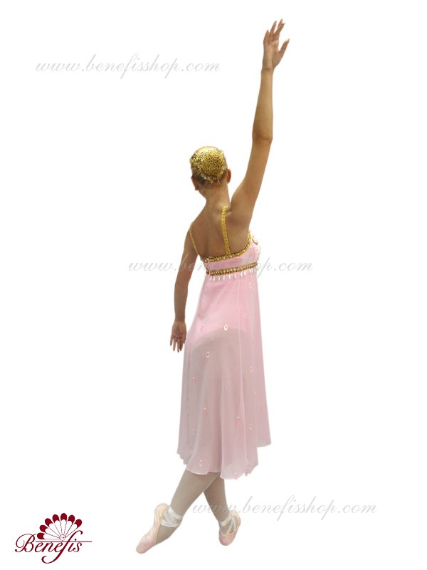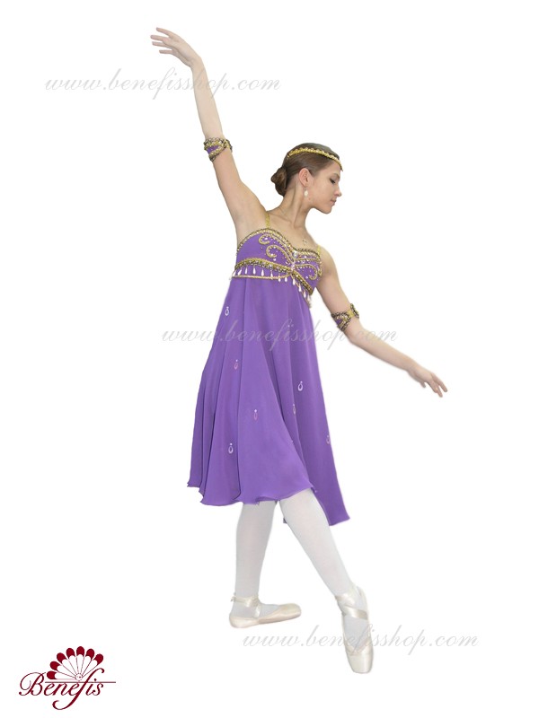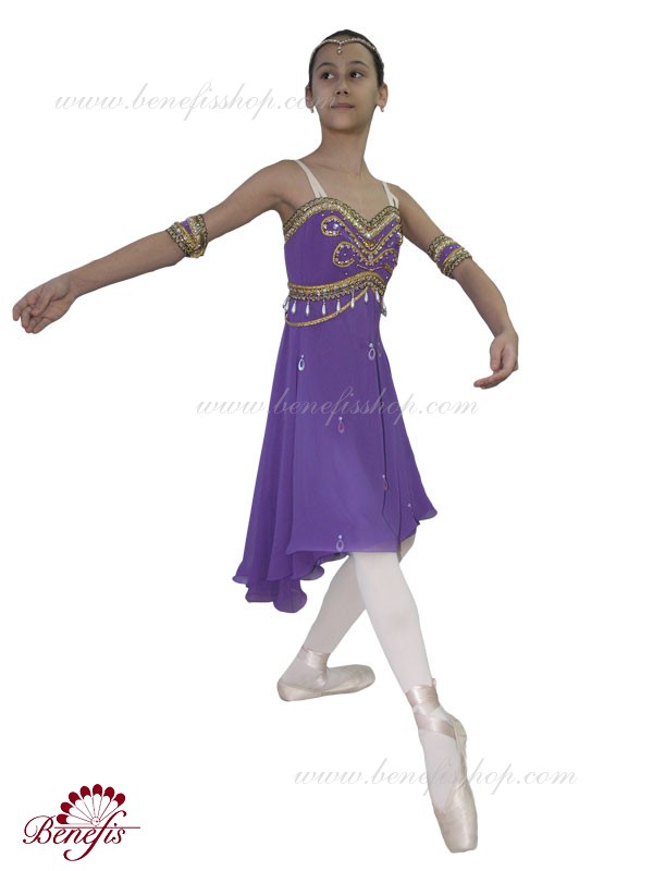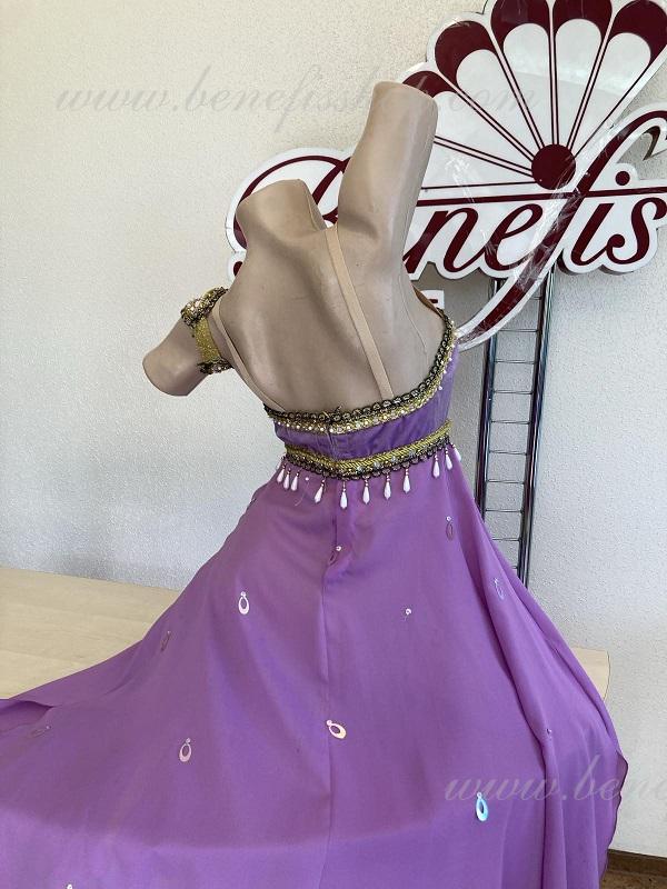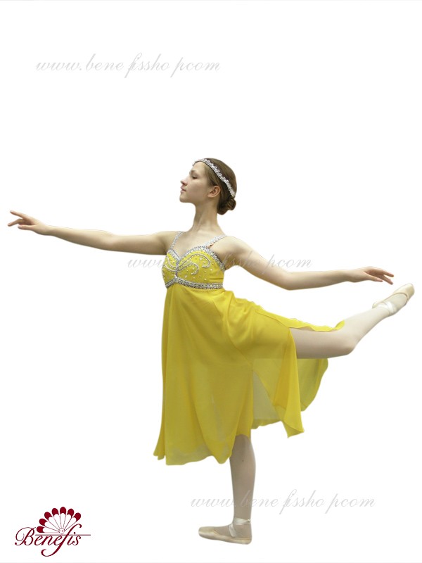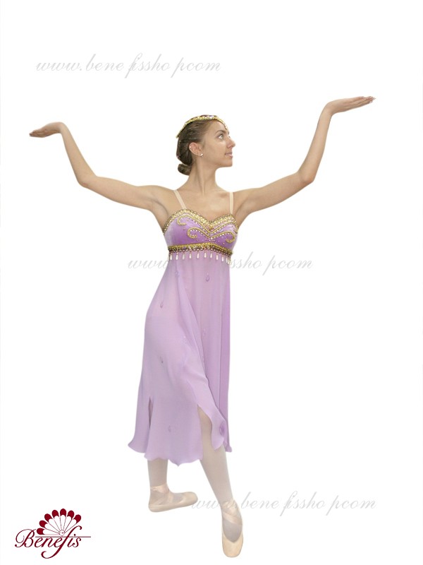 Această rochie profesională de balet cu jug umflat este realizată pe baza unui costum de baie biflex. Corsetul din zona pieptului este confecționat din catifea elastică, este împodobit cu o împletitură largă de aur și decorat cu paiete, mărgele, dantelă, strasuri.
