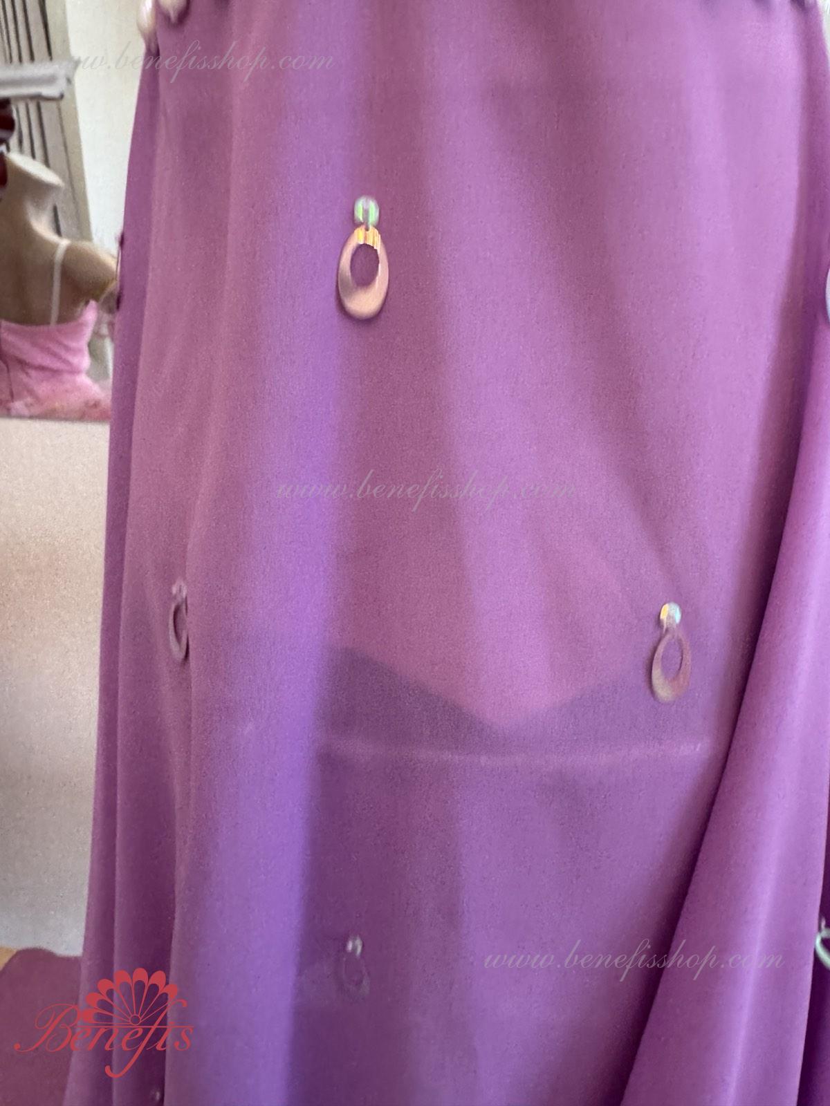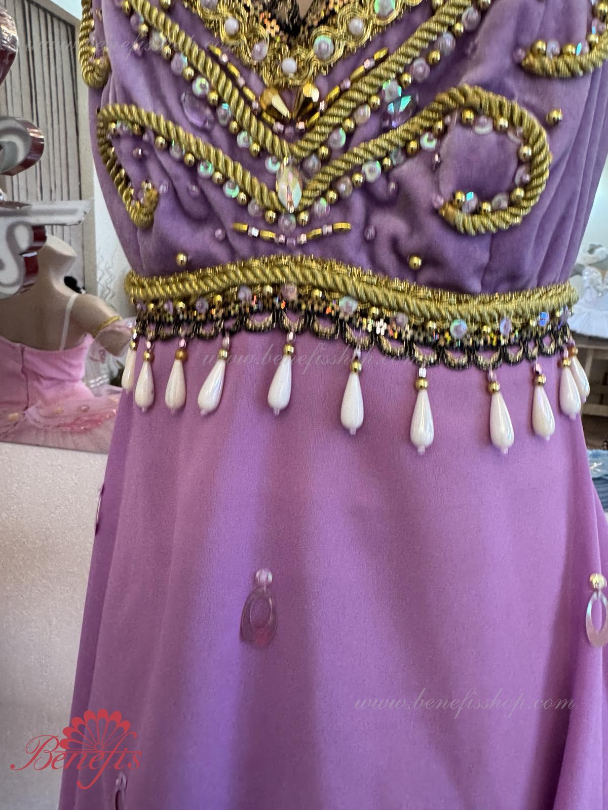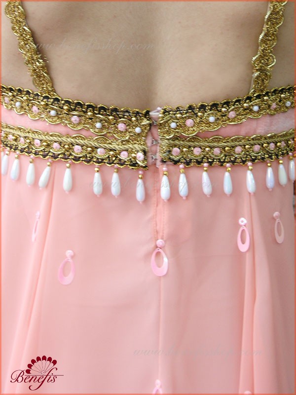 O serie de margele de perle sub formă de picături de-a lungul liniei jugului și brățări decorate luxos subliniază stilul oriental al rochiei.