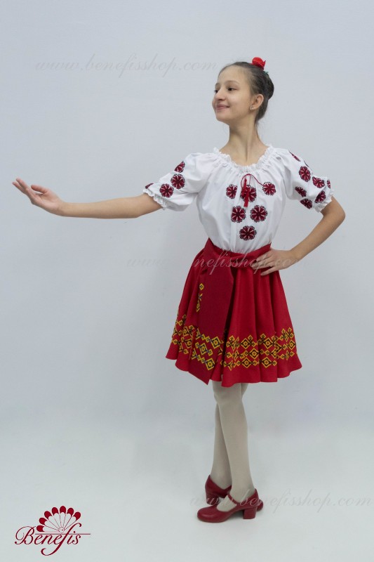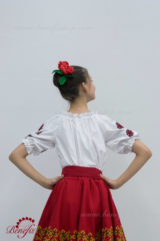 Bluza este confecționată din țesătură de cămașă. O bandă elastică este introdusă pe decolteu și mâneci și este decorată cu dantelă naturală. Broderia este realizată în stil național pe o mașină specială.