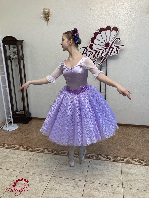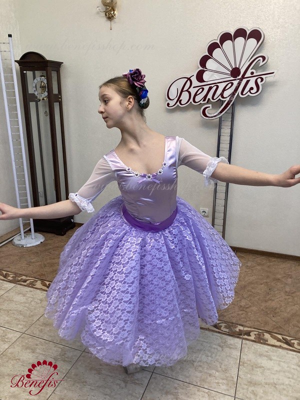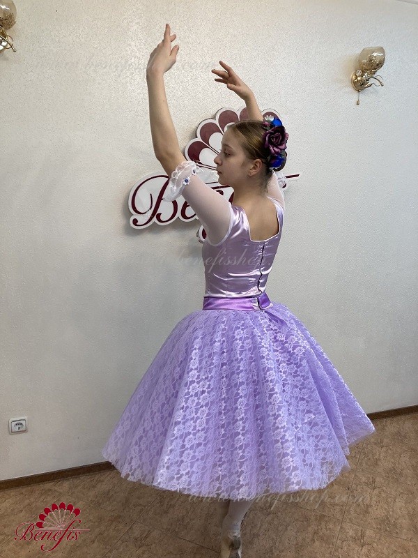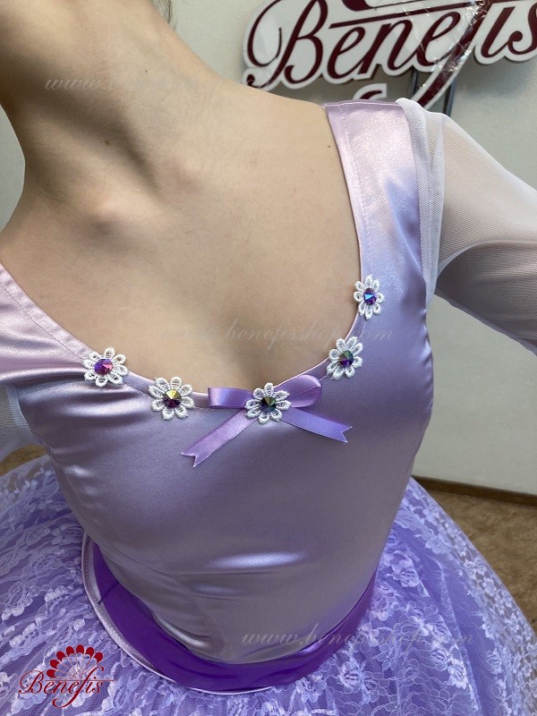 Пачка застегивается сзади на 4 крючка и петельки, которые пришиты в области талии. Лиф из атласа, юбка обычная, сверху гипюр. Рукава из сетки. Декор из тесьма и стразы.