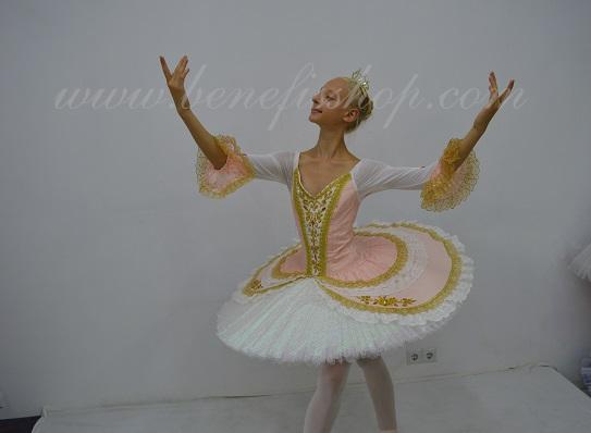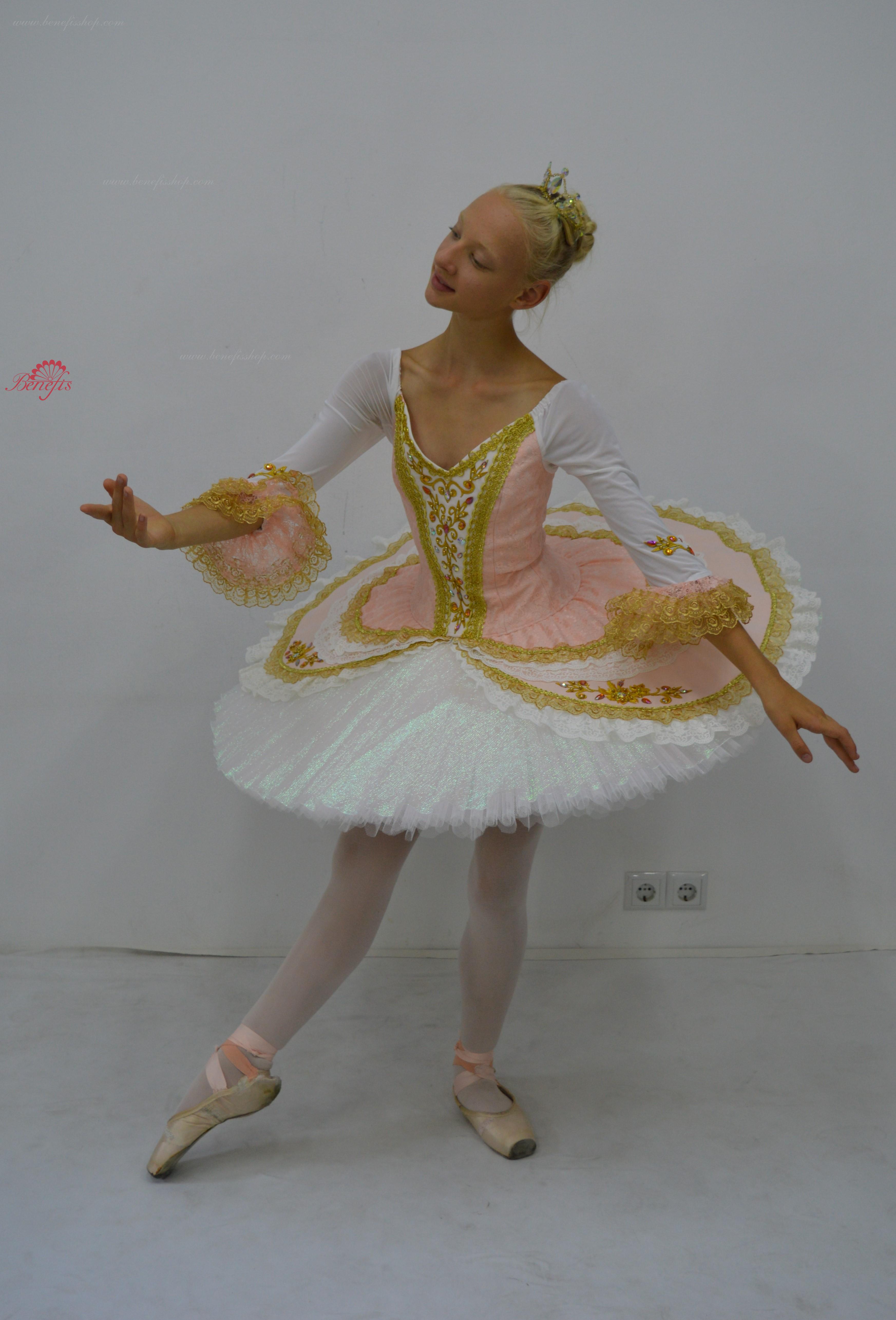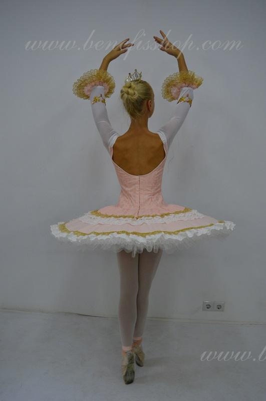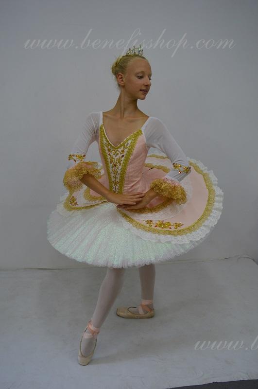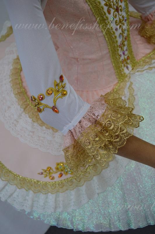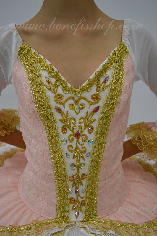 Балетный сценический костюм выполнен на базовой основе T0001В. Лиф выполнен из полуэластичной ткани с V образным мысом на груди. Лиф застегивается сзади на крючках в 2 ряда. По верхнему срезу лифа используется рюша из шифона. В виде декора используется декоративные детали, тесьма, стразы и кружева.