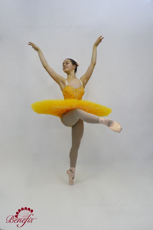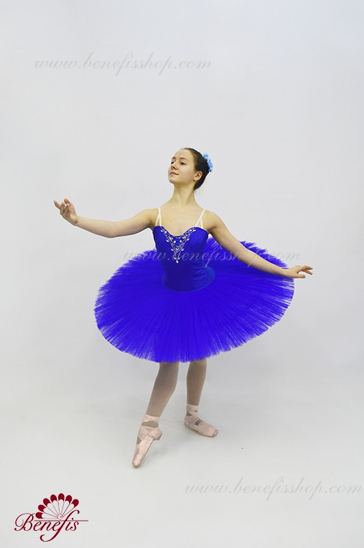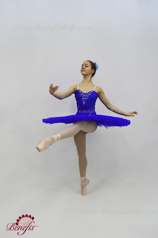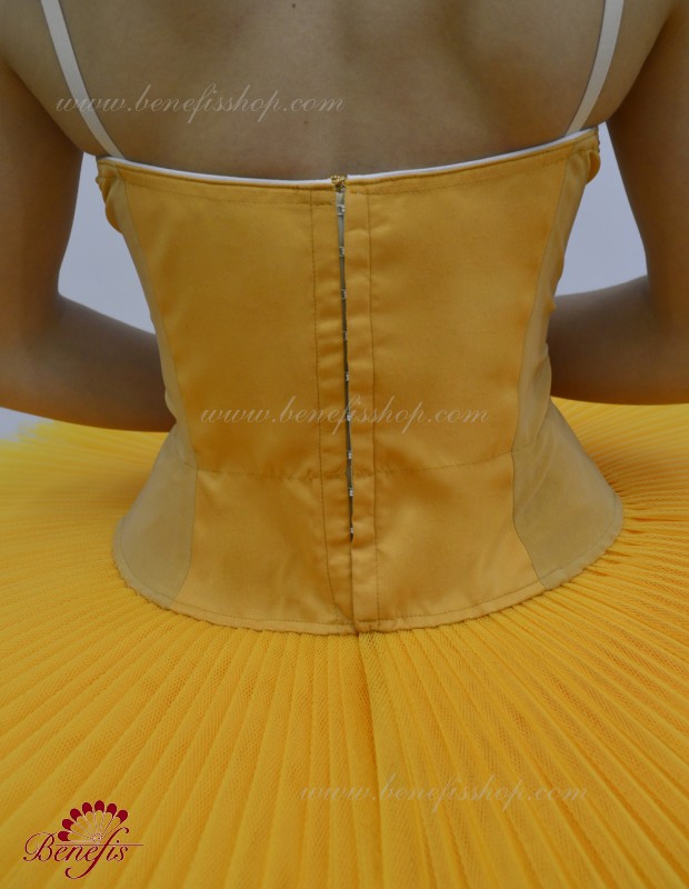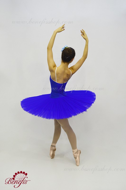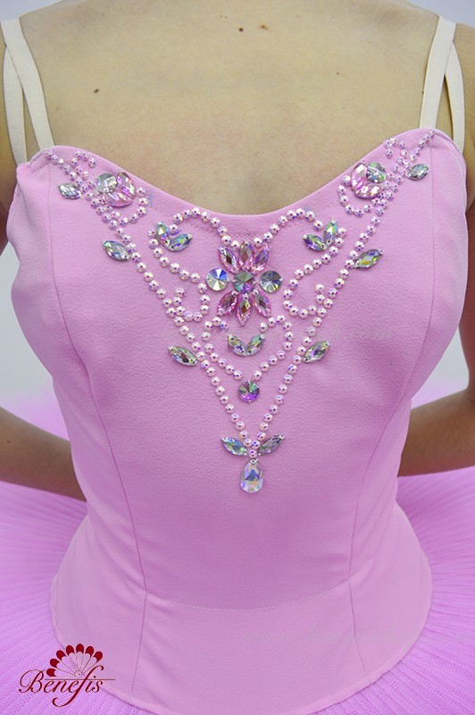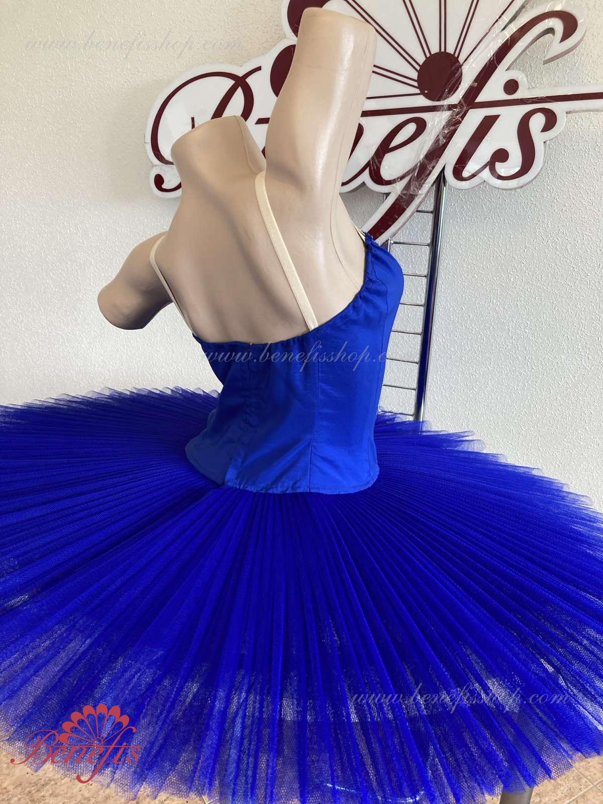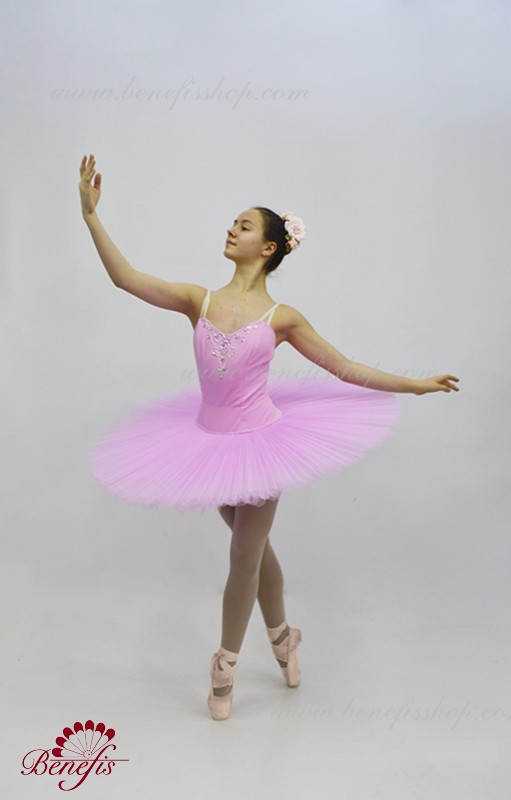 Сценический костюм выполнен на основе лифа Т0009 и пачки Т0001В, с легким декором в области груди. Пачка выполнена из 8 слоёв тюля. Все слои пачки заложены складками, как любая профессиональная пачка. Длина слоёв разная (в зависимости от размера изделия), идёт на уменьшение в направлении нижнего слоя. В середине слоёв вшит волан, куда вставляется стальной обруч.