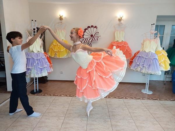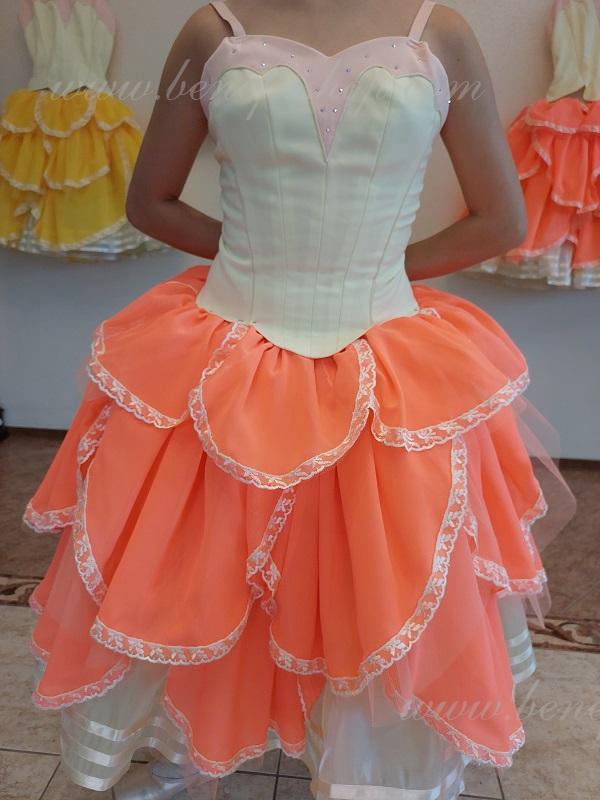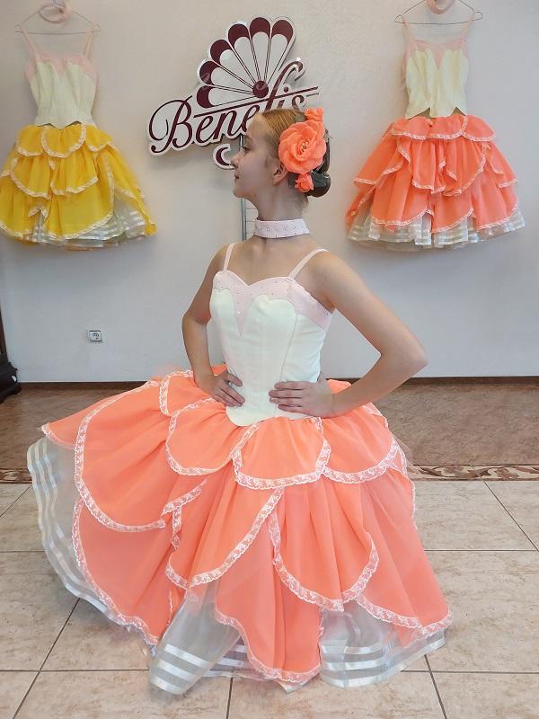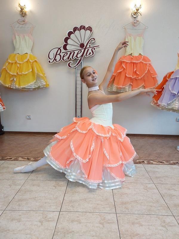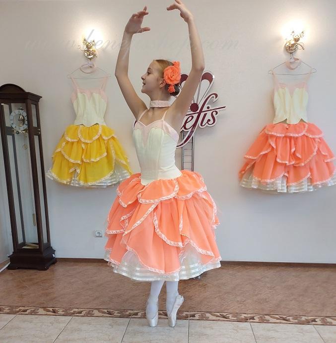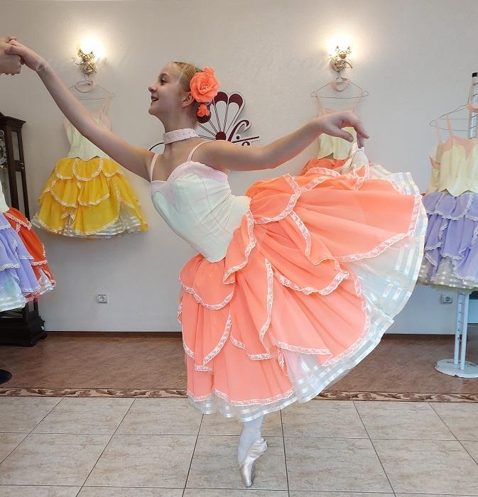 Детали: корсет с юбкой+ чокер. Это профессиональный балетный костюм изготовлен из полу-эластичной плотной ткани. Лиф застегивается сзади на два ряда петель. Для удобного регулирование в области груди лиф можно затянуть внутренним шнуром. Юбка из мягкого и жесткого тюля покрыта органзой которая в свою очередь несет на себе 3 ряда атласной ленты. Покрышка в виде лепестков из шифона и полу-жесткого тюля придает пышность и элегантности всему костюму.