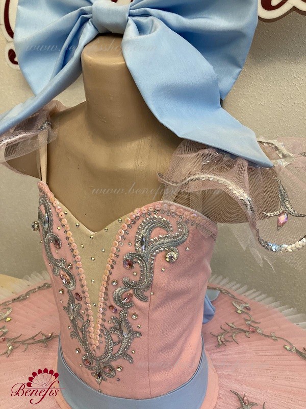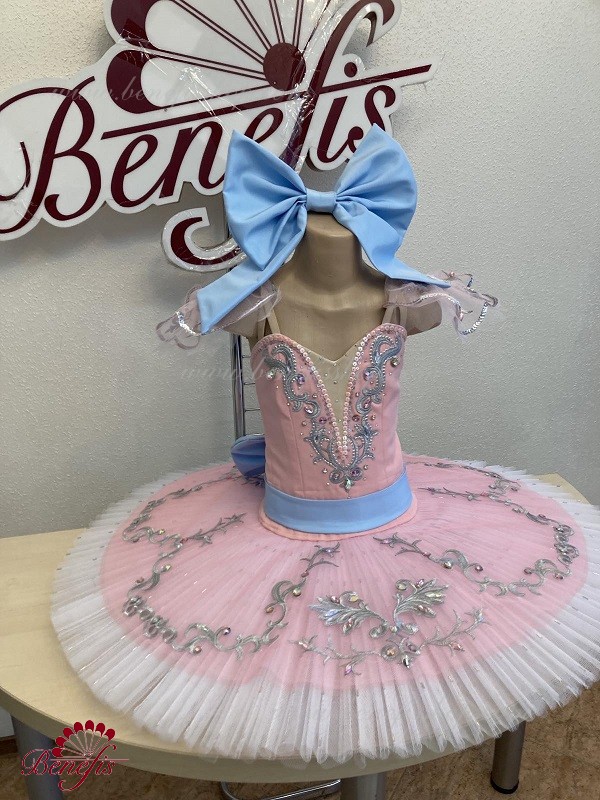 Detalii: costum, arc și centură.Este confectionat in baza fustei de balet profesioniste #T0001B (vezi compartimentul „Fuste de balet de baza si pentru repetitii”).Corsetul, cu bretele elastice și inserție corporală pe piept, este confecționat din material semielastic dens.Corsetul este fixat cu cârlige în două rânduri pentru o ajustare convenabilă a dimensiunii în zona pieptului.