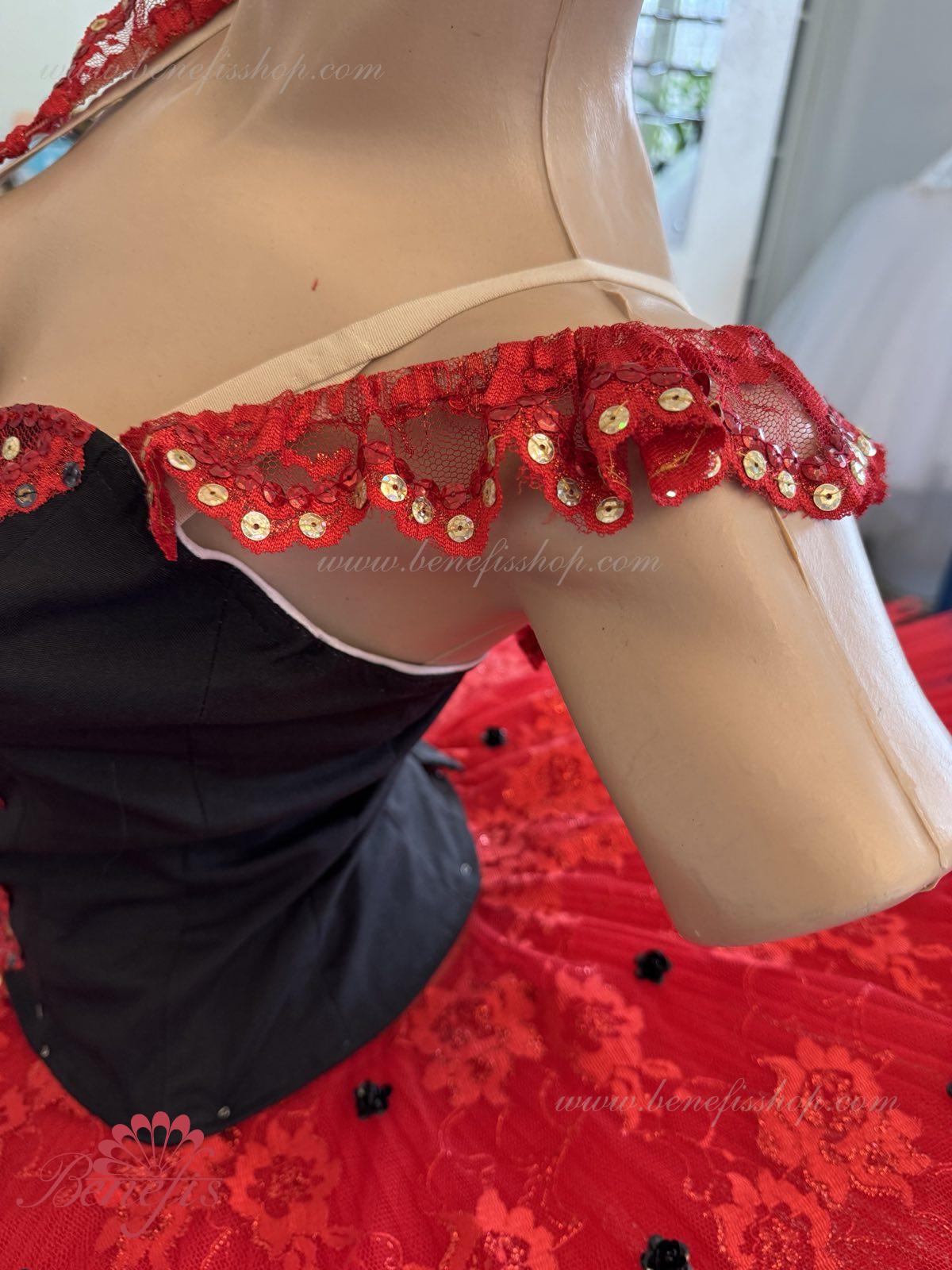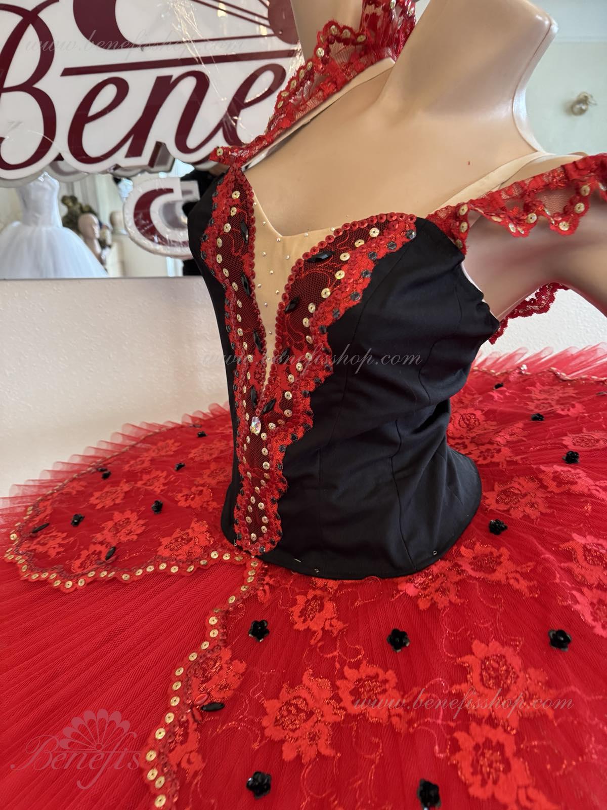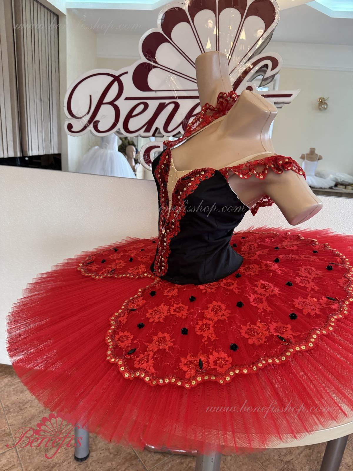 Costum de scena profesionist. Corsetul, cu bretele elastice și o inserție de culoarea pielii pe piept, este realizat din țesătură densă semi-elastică. Corsetul este fixat cu cârlige în două rânduri pentru o reglare ușoară, cordonul interior este folosit pentru a strânge corsetul în zona pieptului.Opt straturi gradate plisate de tul semi-moale-șapte lungi și unul scurt pe chiloți din tul cu un jug de 10 cm atașat la o centură elastică. Două cercuri de crinolină sunt încorporate în stratul mijlociu, cu două bibelouri scurte suplimentare la margini. Lungimea stratului superior este de 36-38 cm, fiecare strat ulterior este cu 4 cm mai scurt. Tutu-ul este fixat la spate cu 6 cârlige și bucle mari. Acest tutu de repetiție de balet poate fi realizat atât pentru adulți, cât și pentru copii. Mâneci și decor de pelerină din guipure.