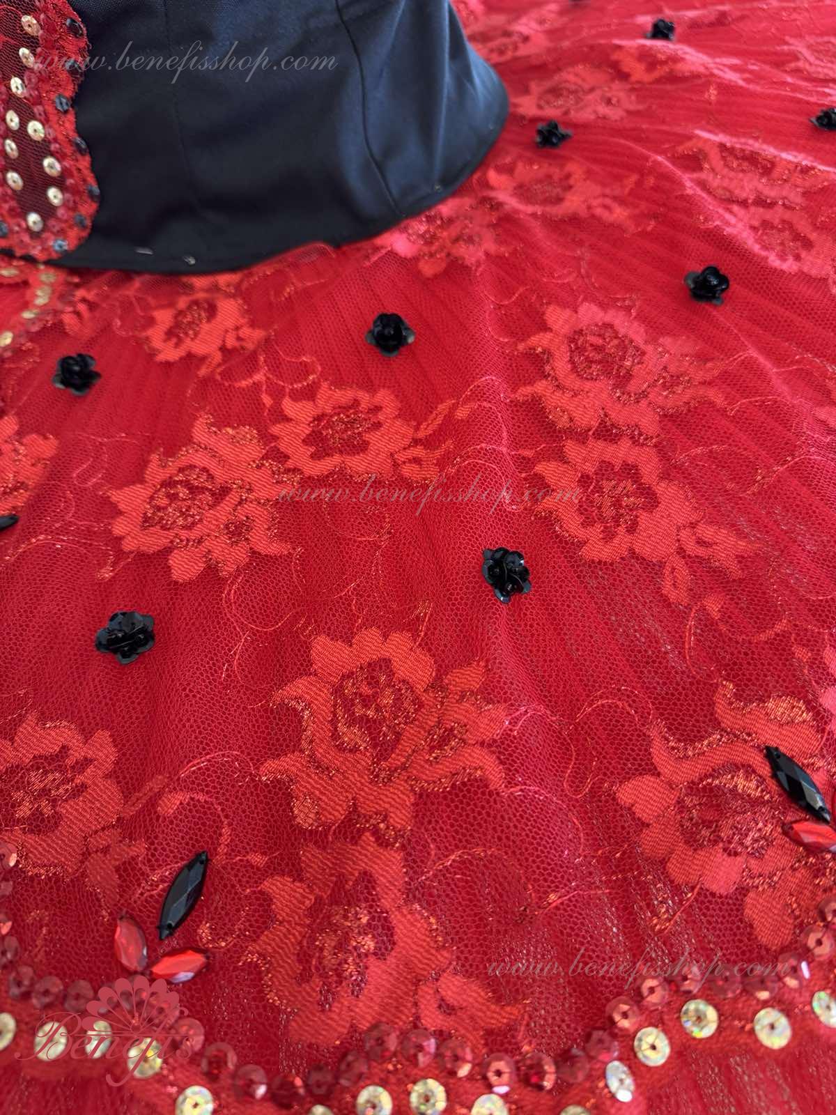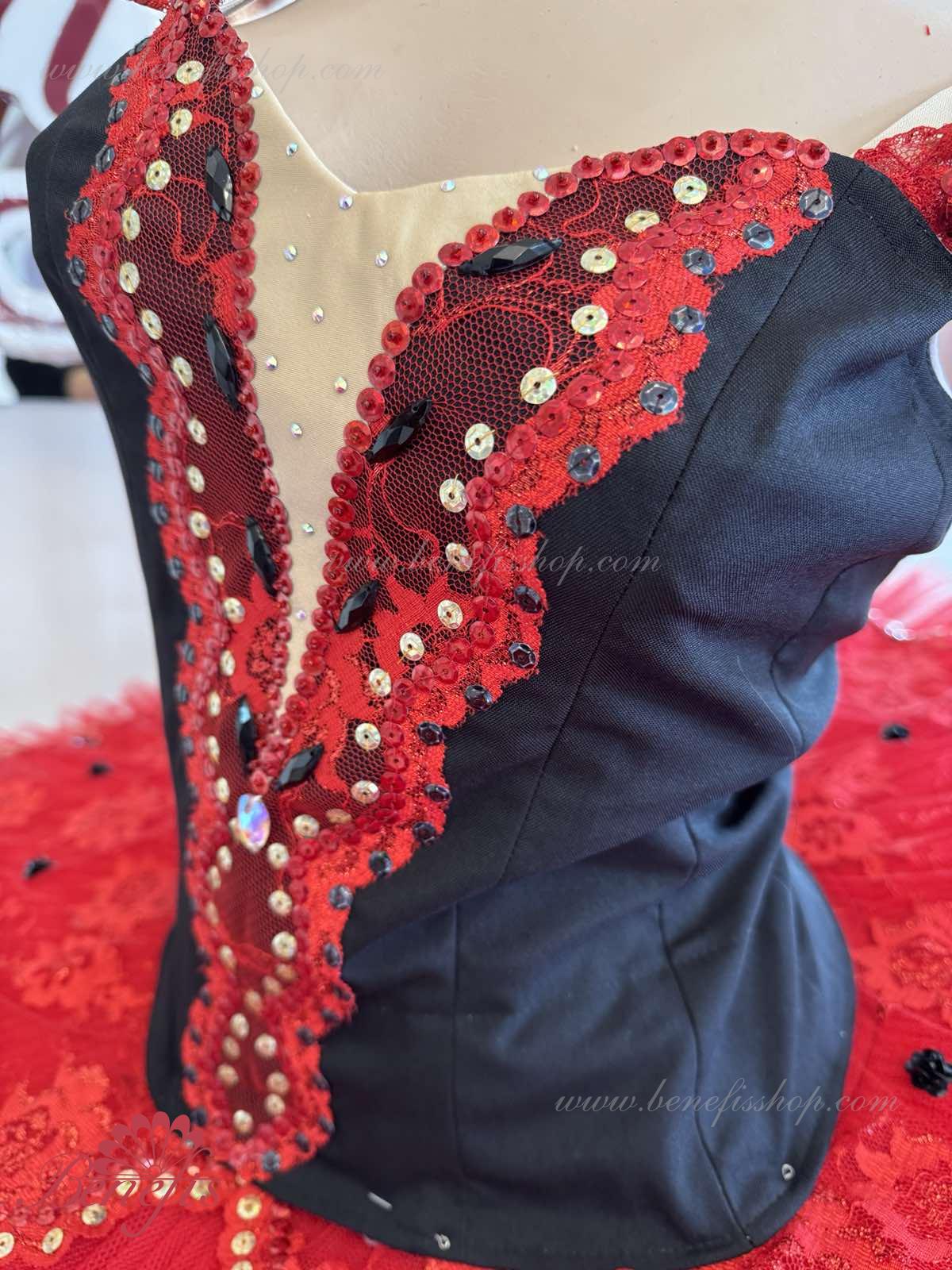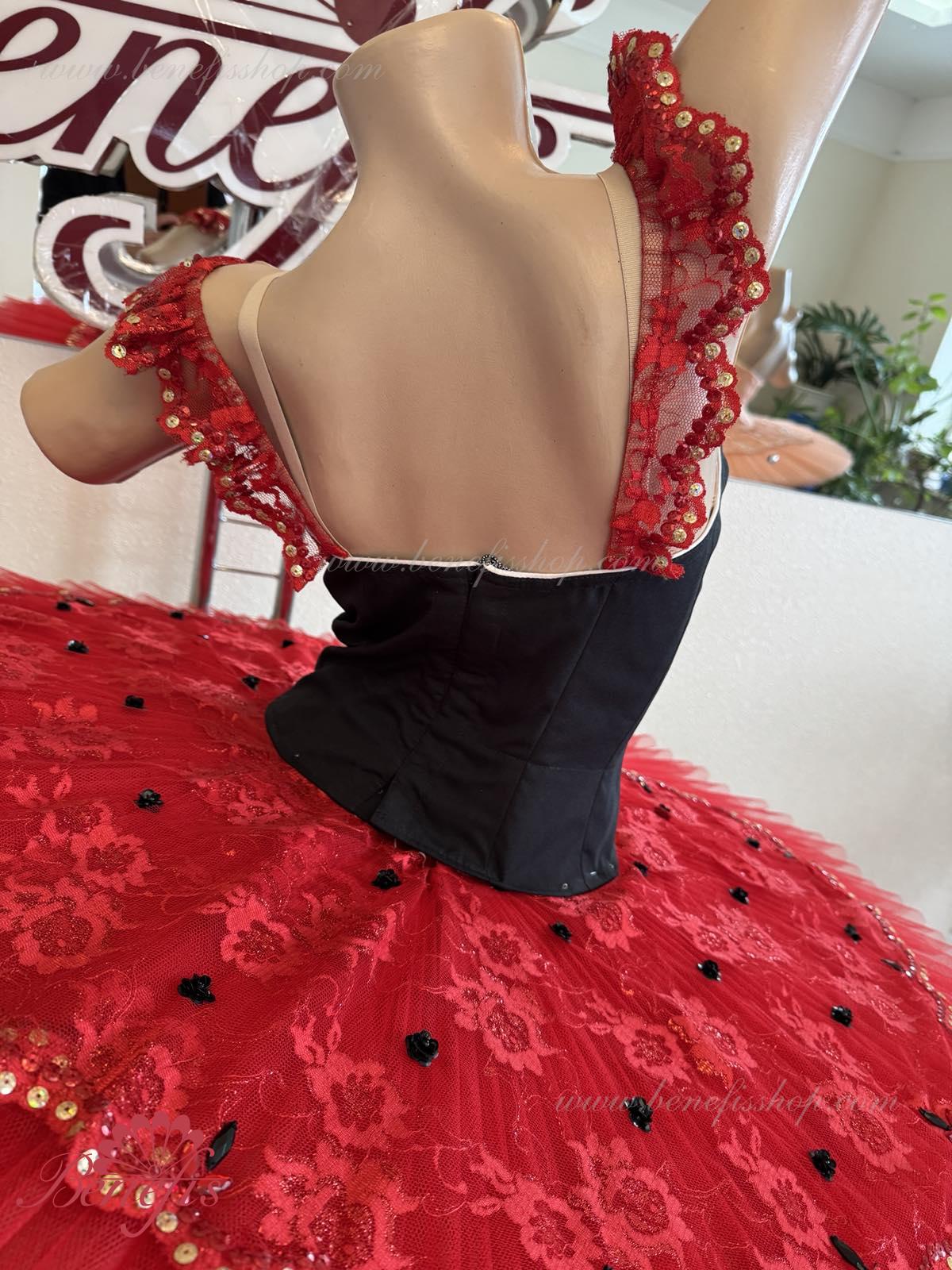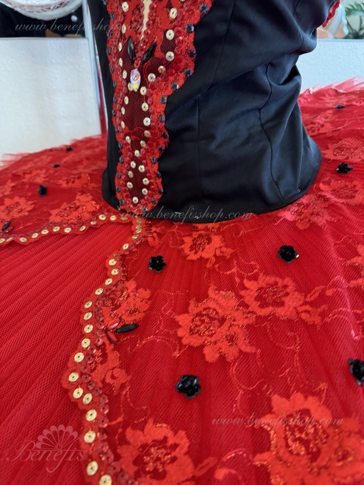 Costum de scena profesionist. Corsetul, cu bretele elastice și o inserție de culoarea pielii pe piept, este realizat din țesătură densă semi-elastică. Corsetul este fixat cu cârlige în două rânduri pentru o reglare ușoară, cordonul interior este folosit pentru a strânge corsetul în zona pieptului.Opt straturi gradate plisate de tul semi-moale-șapte lungi și unul scurt pe chiloți din tul cu un jug de 10 cm atașat la o centură elastică. Două cercuri de crinolină sunt încorporate în stratul mijlociu, cu două bibelouri scurte suplimentare la margini. Lungimea stratului superior este de 36-38 cm, fiecare strat ulterior este cu 4 cm mai scurt. Tutu-ul este fixat la spate cu 6 cârlige și bucle mari. Acest tutu de repetiție de balet poate fi realizat atât pentru adulți, cât și pentru copii. Mâneci și decor de pelerină din guipure.