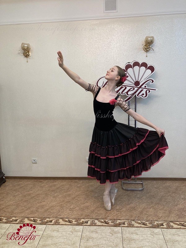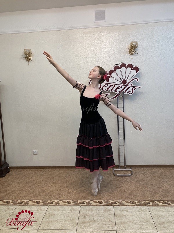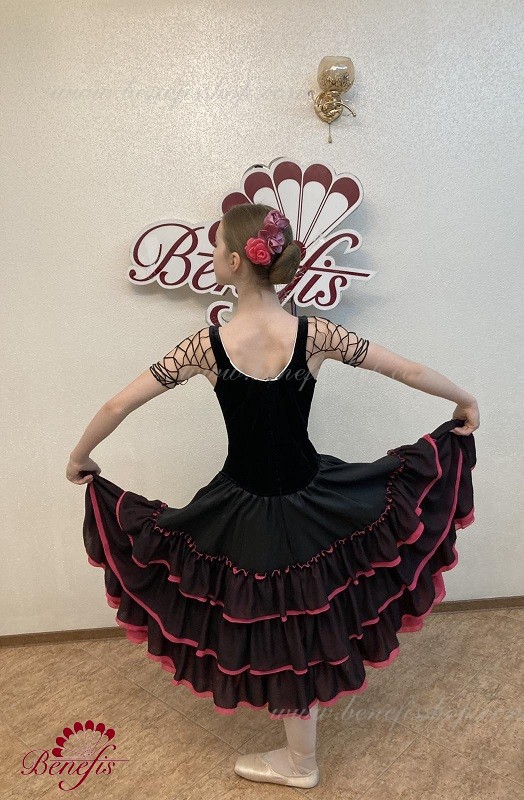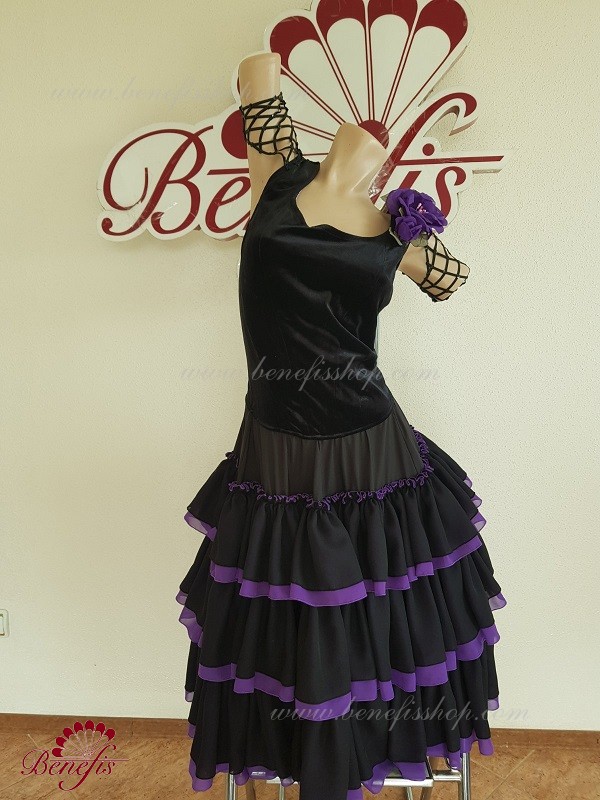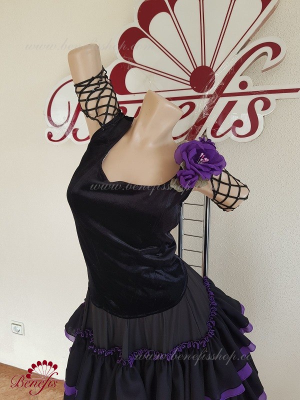 Detalii: rochie. Baza fustei este din tafta. Catifea pe corset, volane din sifon.Costumul are mâneci sub formă de plasă neagră mare.