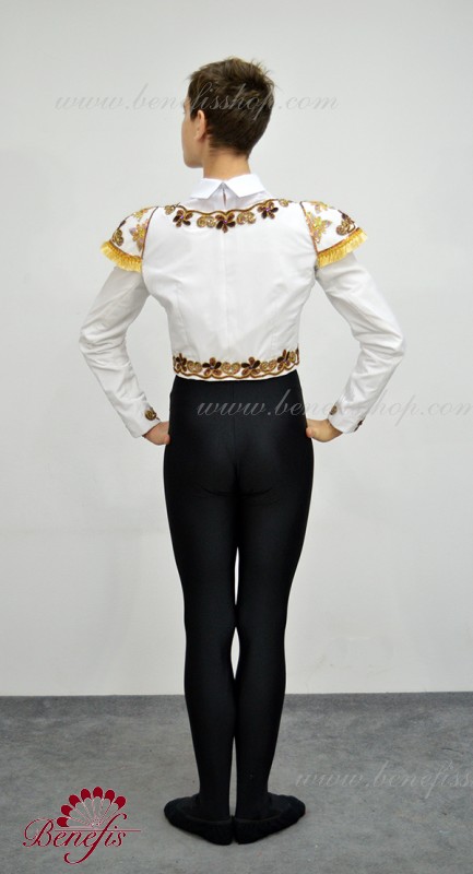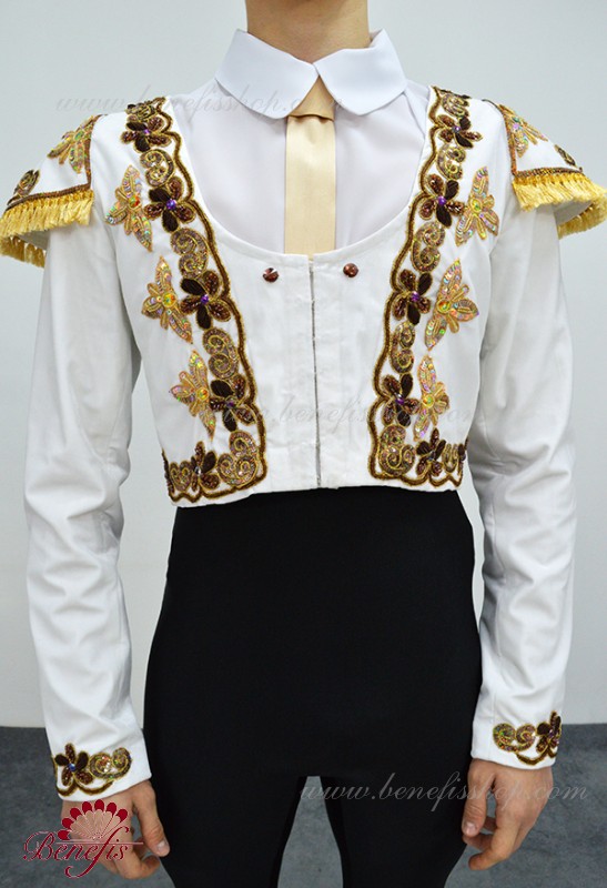 Silueta scurtată este realizată în stil spaniol. Jacheta este fixată în față cu un rând de cârlige. Ca decor folosit: pietre, paiete.