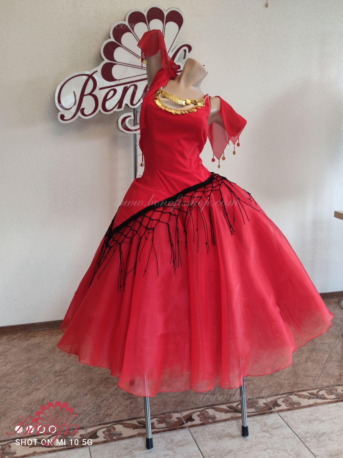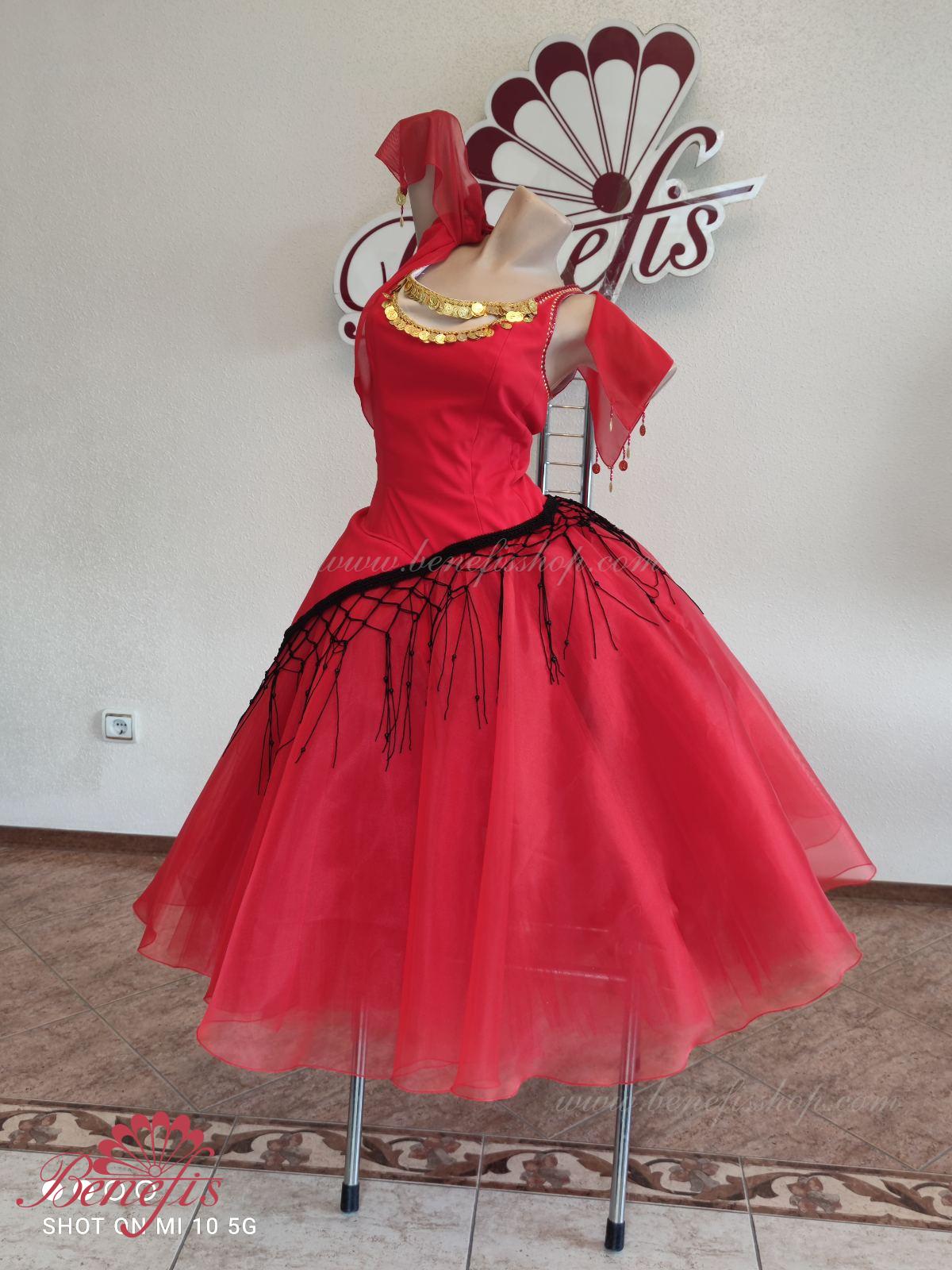 Acesta este un costum de scena profesionist realizat pe baza fustei de balet de baza T 0003. Corsetul cu maneci scurte este realizat din tesatura densa semi-elastica bogat decorata cu paiete si manista. Corsetul este fixat pe două rânduri de cârlige și bucle pentru confort, în zona pieptului este strâns și reglat cu un șnur. Fusta de tul este acoperită cu organza elegantă. Există o bască sub formă de șal pe coapsă, care este tivită cu împletitură decorativă cu franjuri la margini.