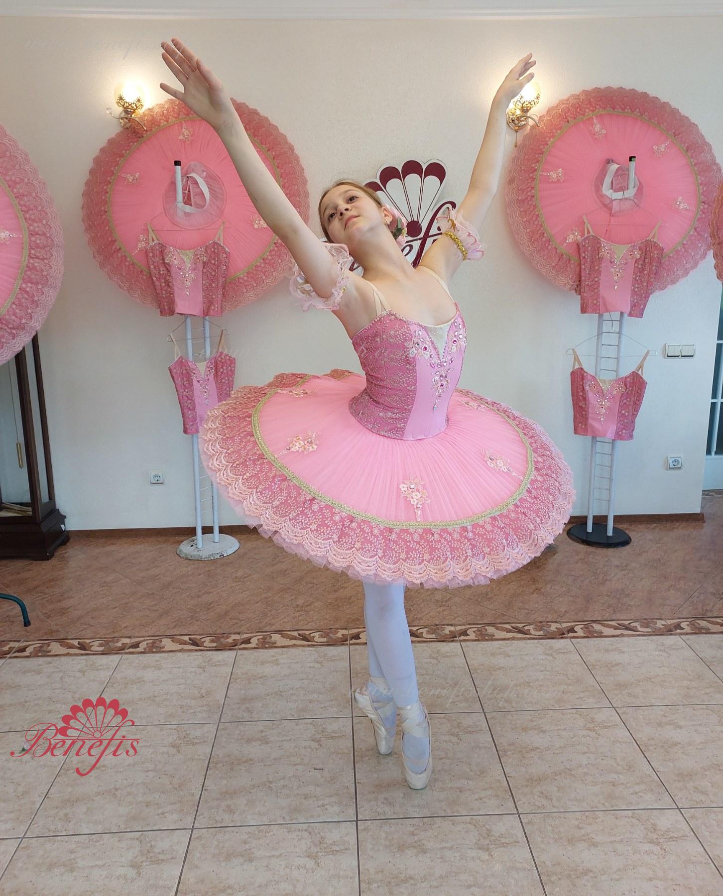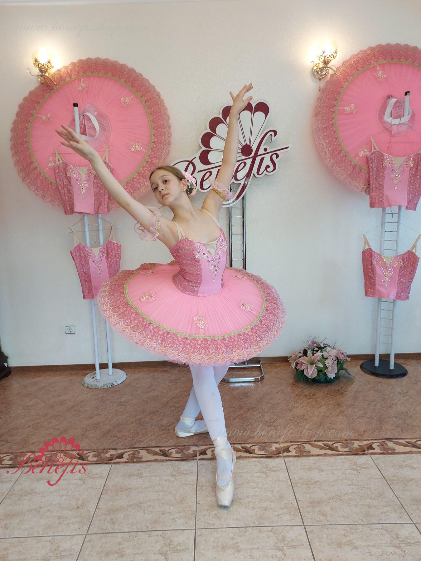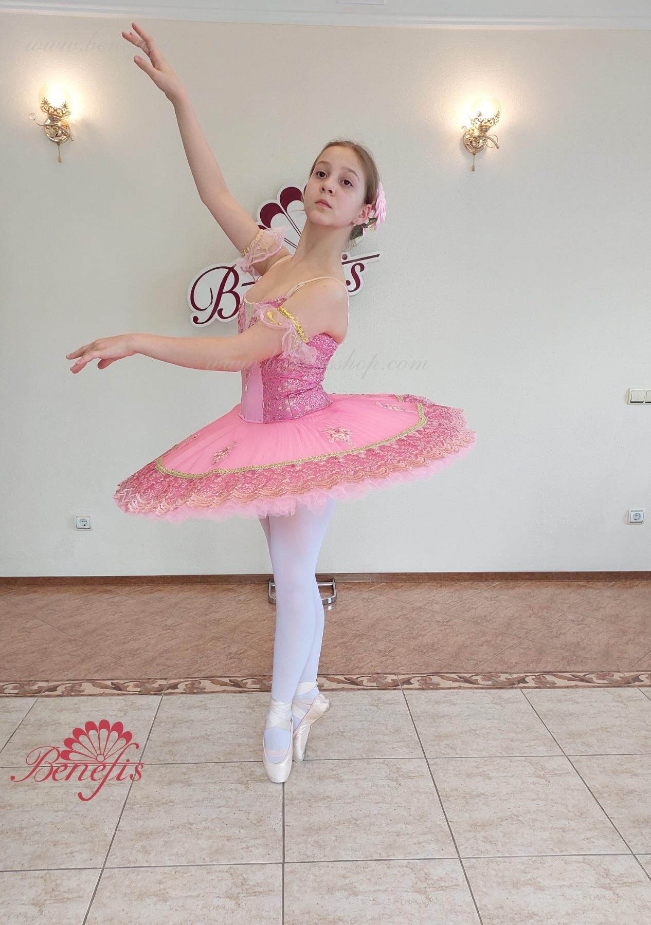 Detalii: costum, banderole. Acest costum de scenă profesional este realizat pe baza fustei de balet profesioniste #T0001B (vezi compartimentul „Fuste de balet de baza si pentru repetitii”). Corsetul din fata este din satin catifelat cu ghipura.