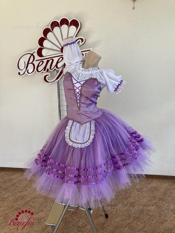 Costumul este realizat în stil țărănesc, cu un șorț mic în față și trei rânduri de împletitură de satin de-a lungul fundului stratului superior al fustei.