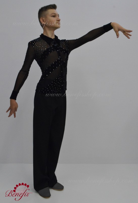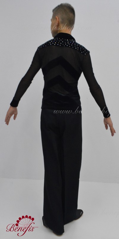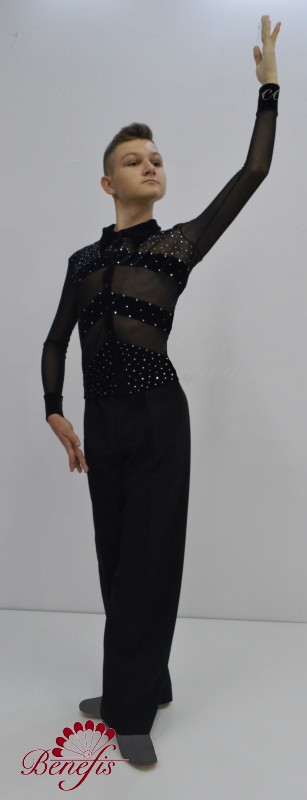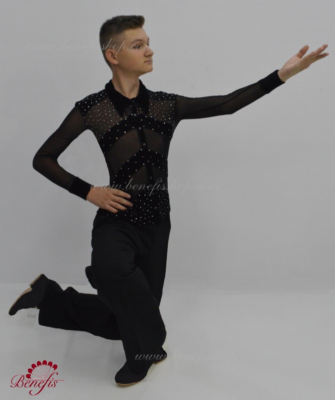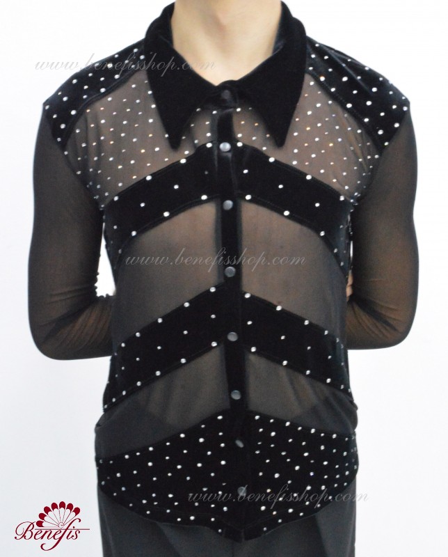 Cămașa este fabricată din țesătură elastică, plasă și catifea. Tricoul se fixează cu butoanele din față. Costumul este decorat cu pietre.