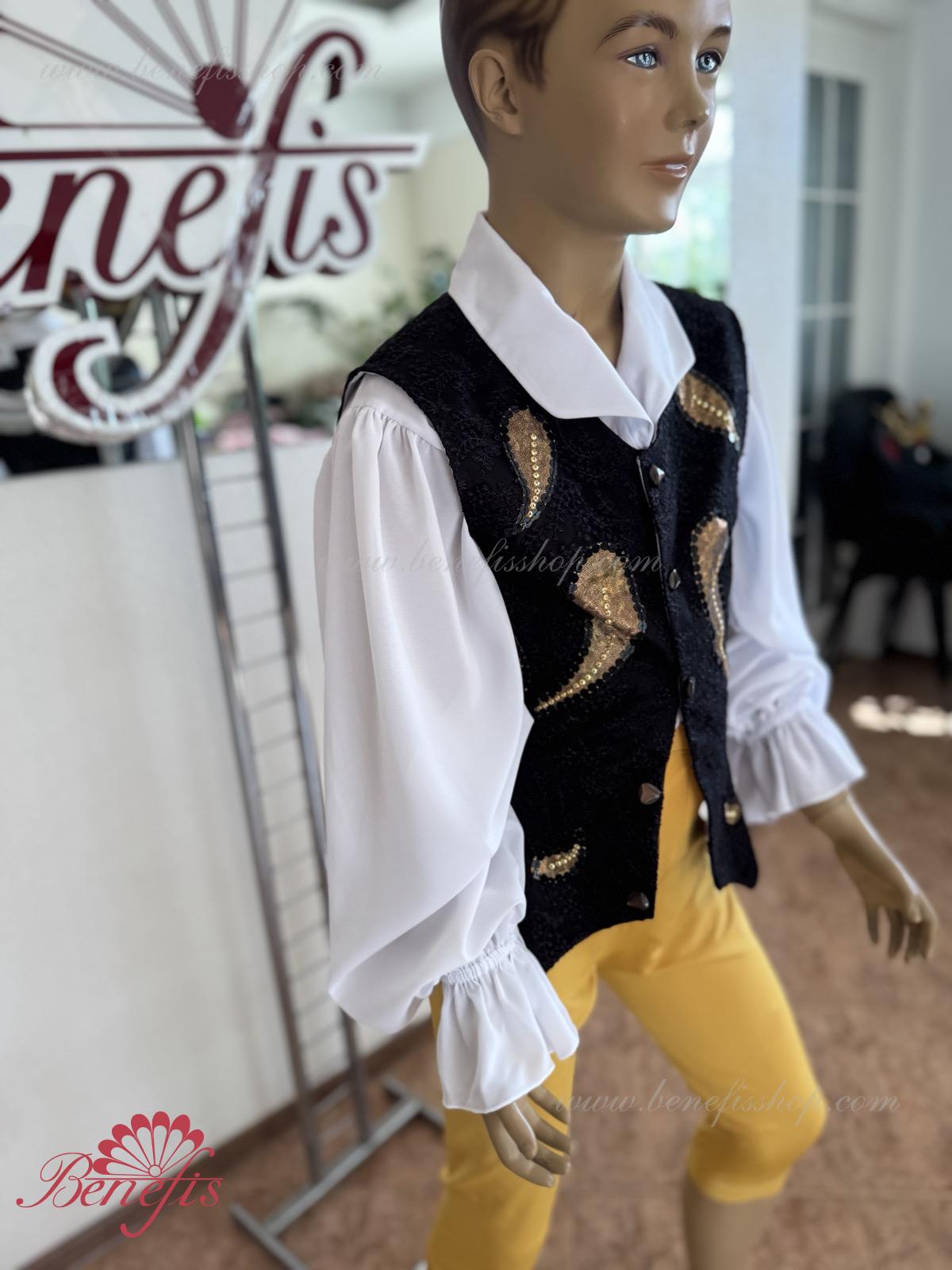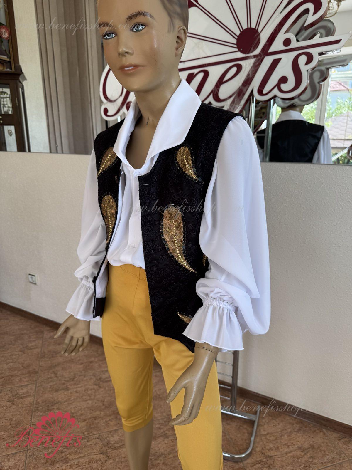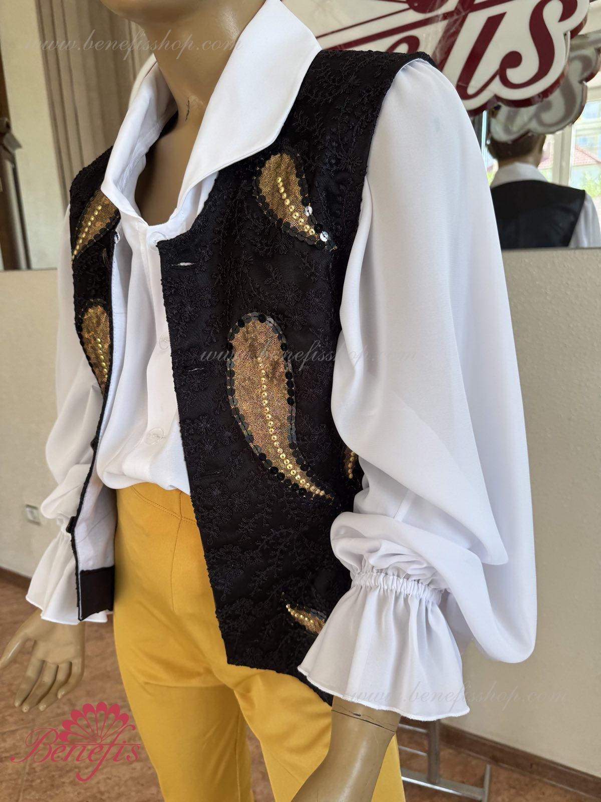 Detalii: costum. Vesta din satin este duplicată cu guipure, decorul este realizat din biflex. Bluza bărbătească este din viscoză fără cataramă. Pantalonii sunt din satin, cu fermoar in fata.