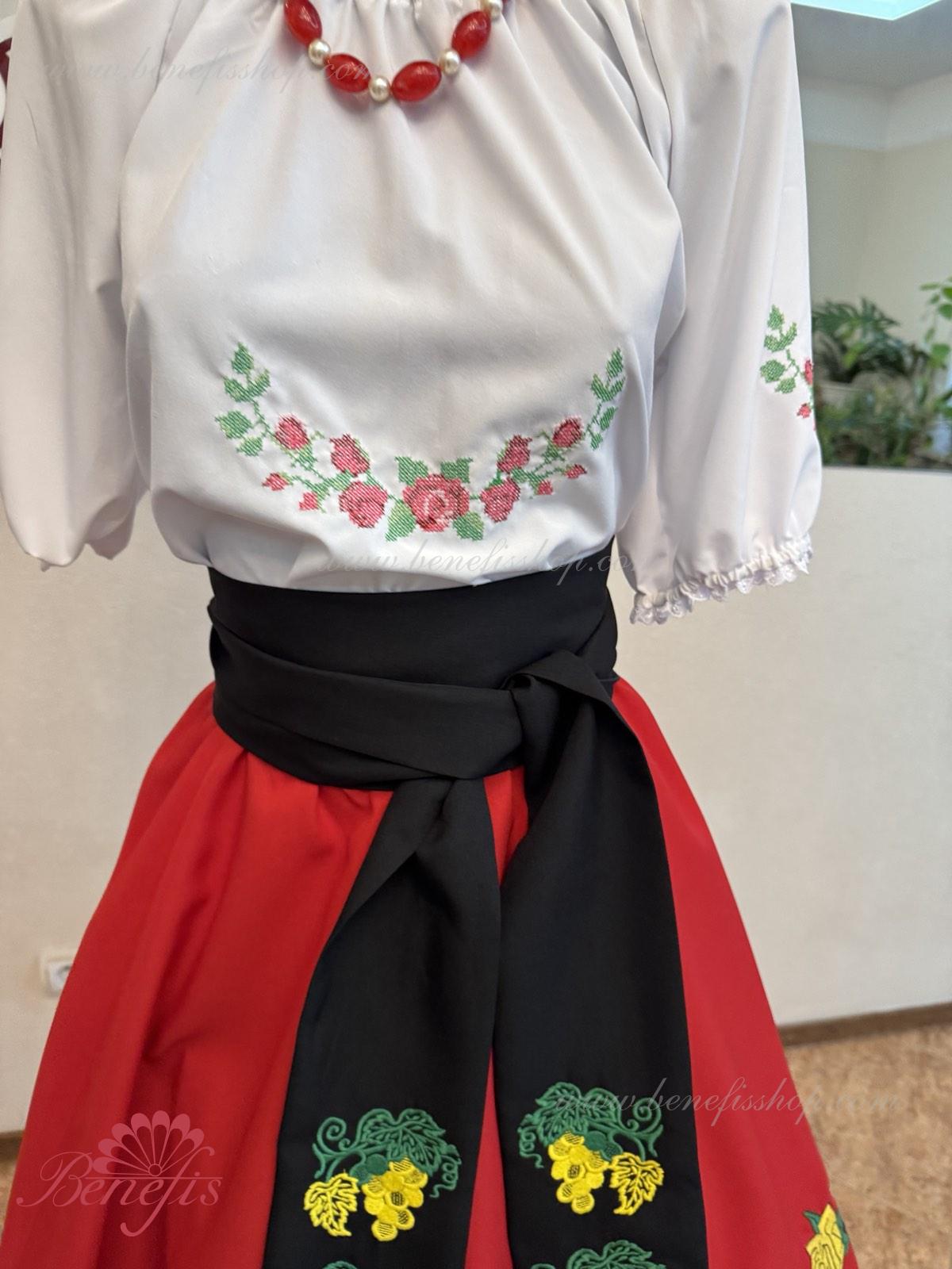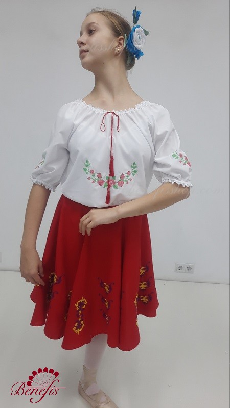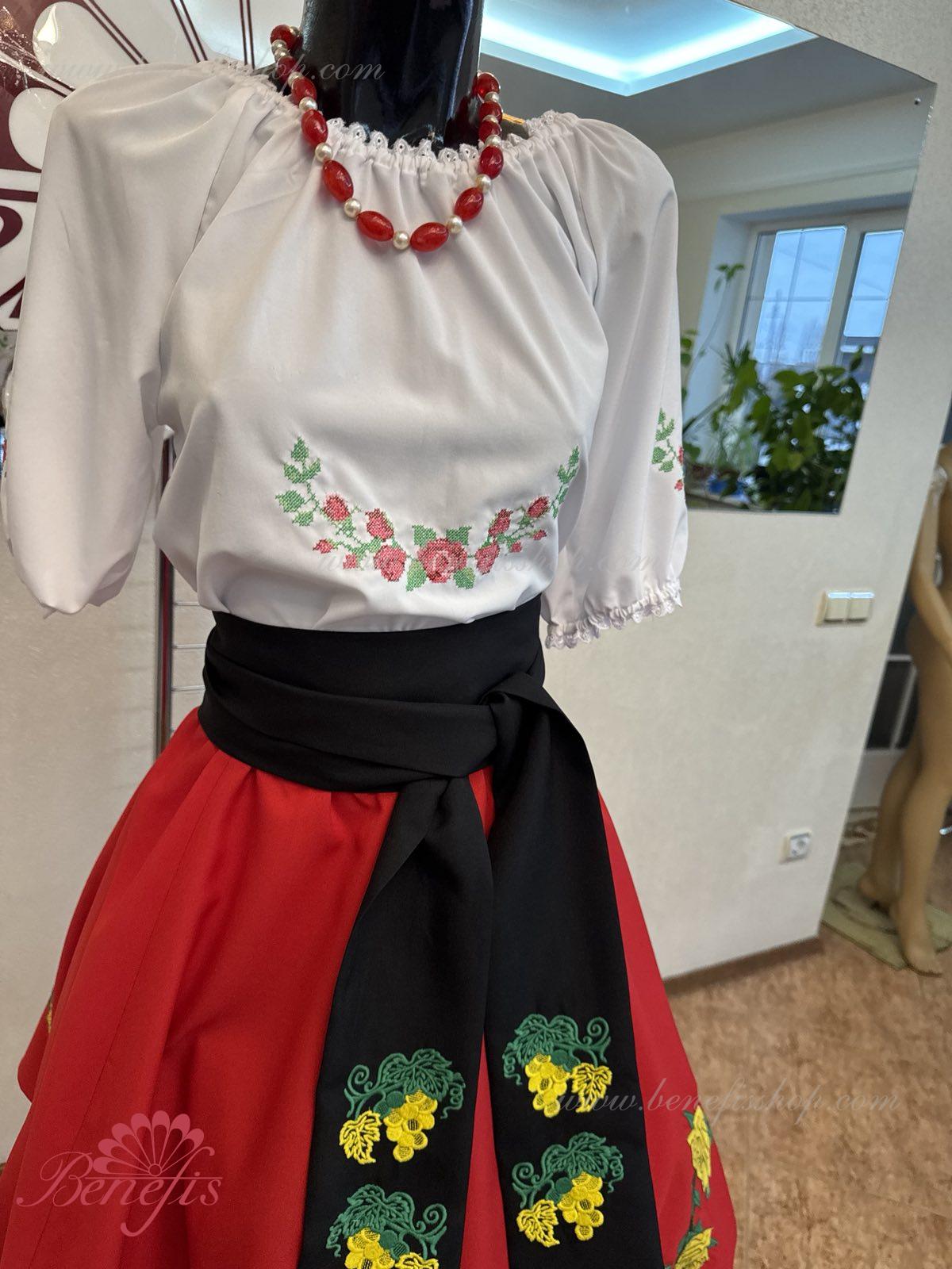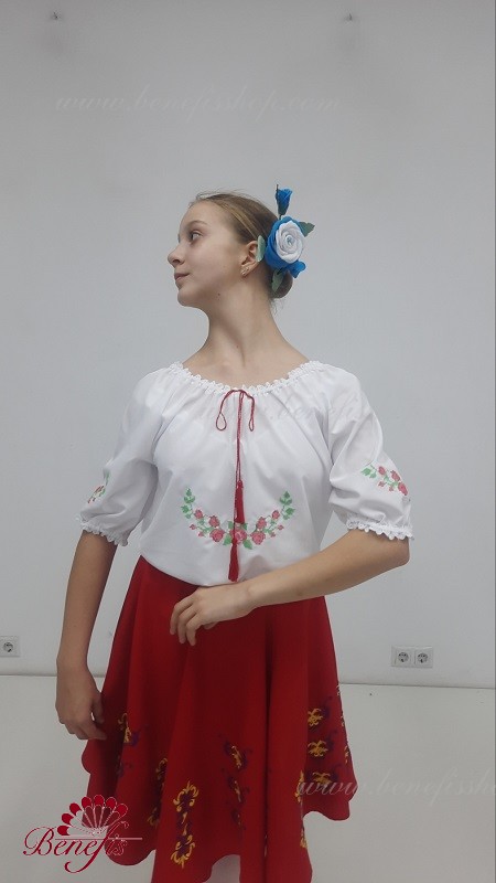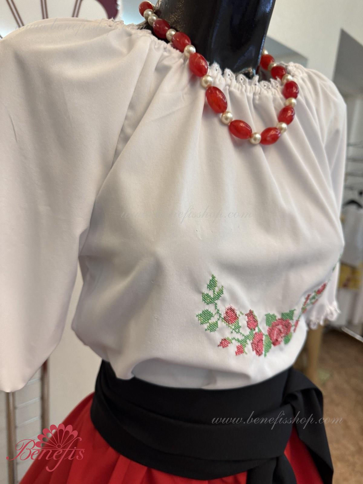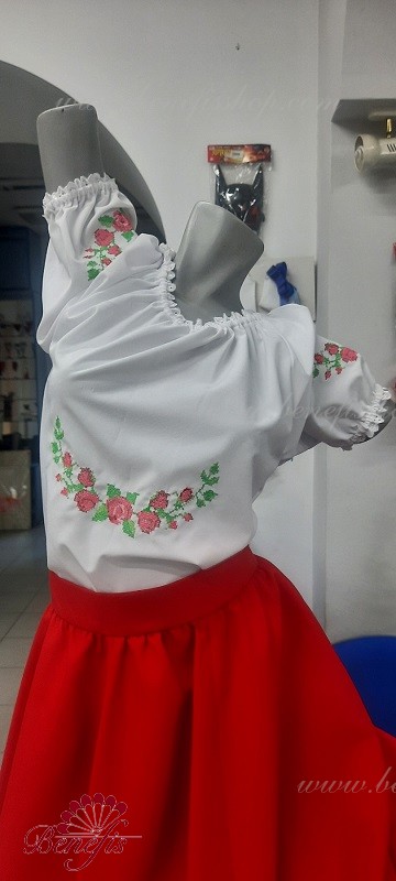Bluza este confecționată din țesătură de cămașă. O bandă elastică este introdusă pe decolteu și mâneci și este decorată cu dantelă naturală. Broderia este realizată în stil național pe o mașină specială.