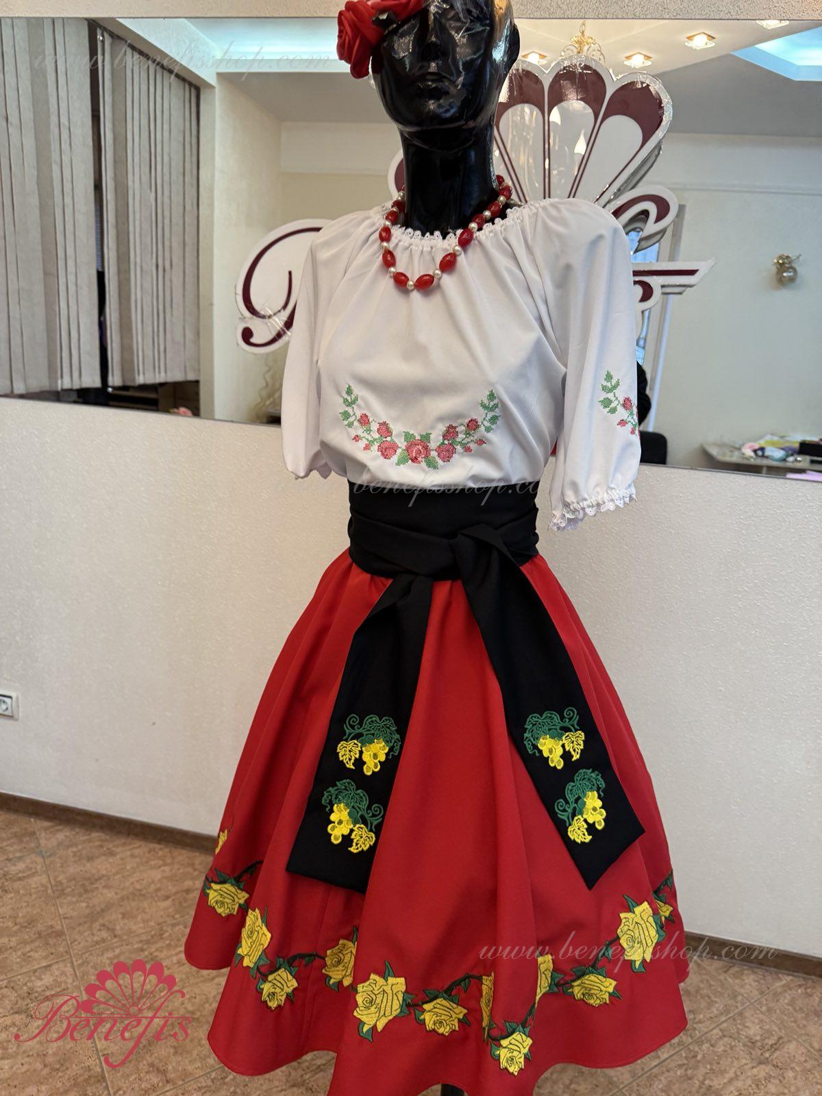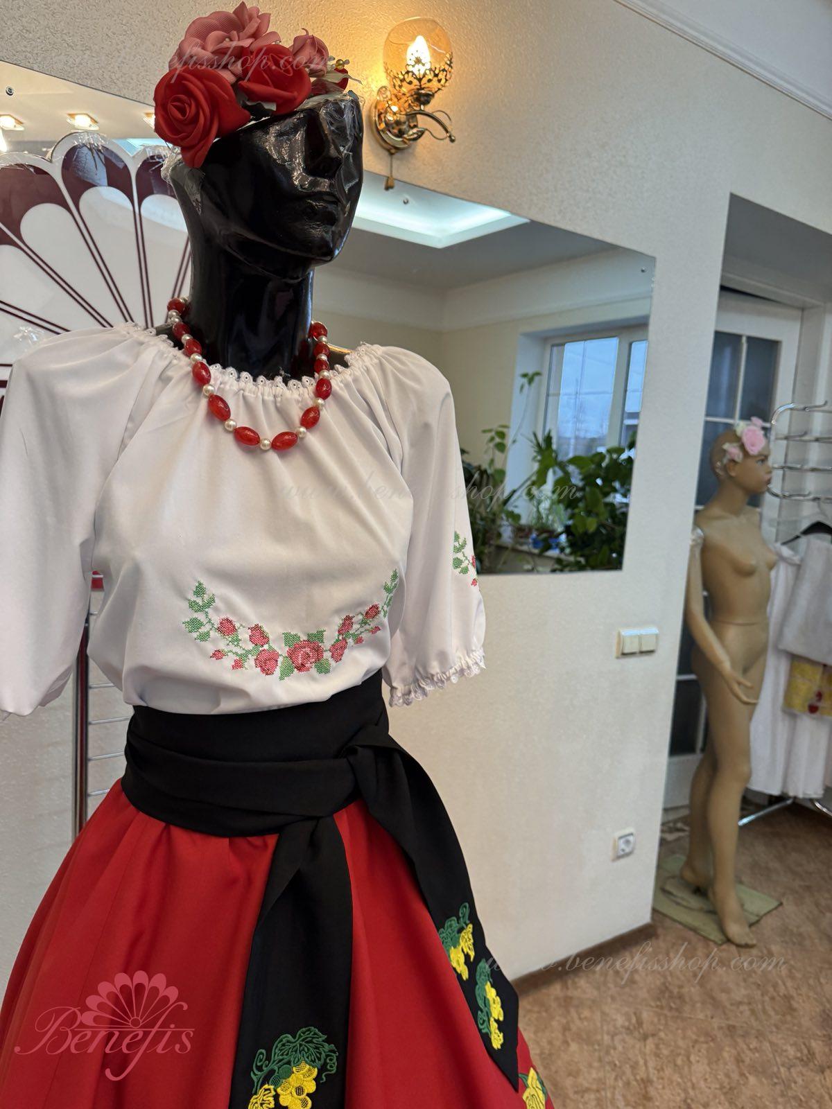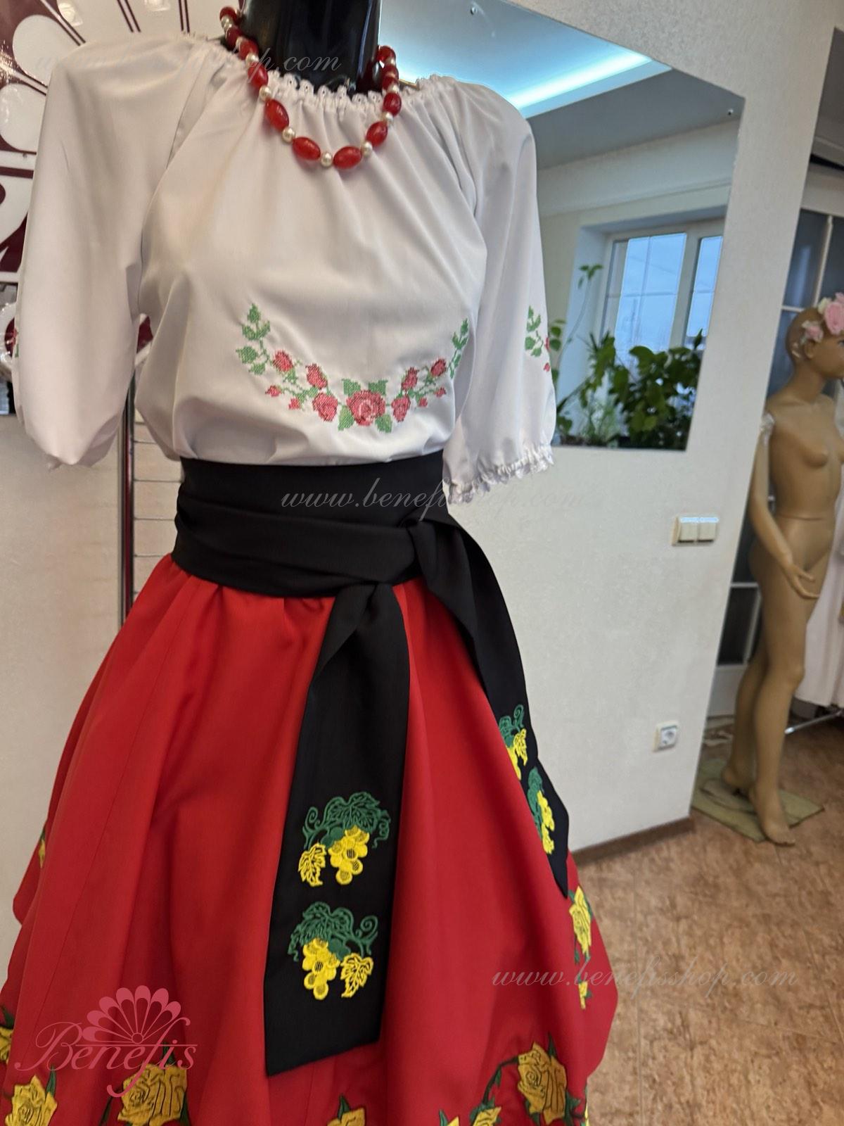Bluza este confecționată din țesătură de cămașă. O bandă elastică este introdusă pe decolteu și mâneci și este decorată cu dantelă naturală. Broderia este realizată în stil național pe o mașină specială.