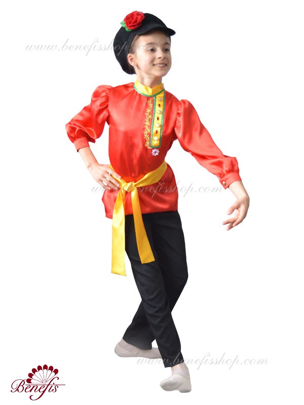 Shirt is made from semi-flexible fabric (satin). On the shirt the hand decoration is made: the applications, flowers, rhinestones.