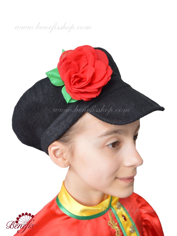 The head piece is made from semi-flexible fabric (velvet) with a decorative red flower
