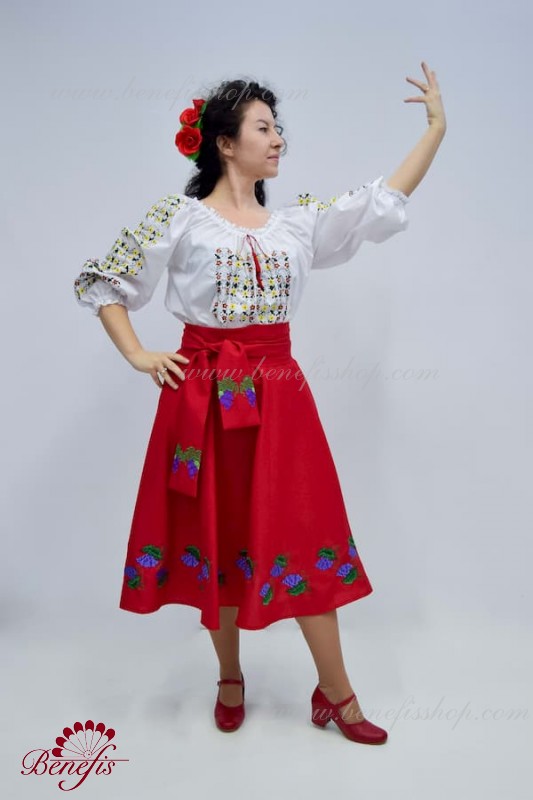 Bluza este confecționată din țesătură de cămașă. O bandă elastică este introdusă pe decolteu și mâneci și este decorată cu dantelă naturală. Broderia este realizată în stil național pe o mașină specială.