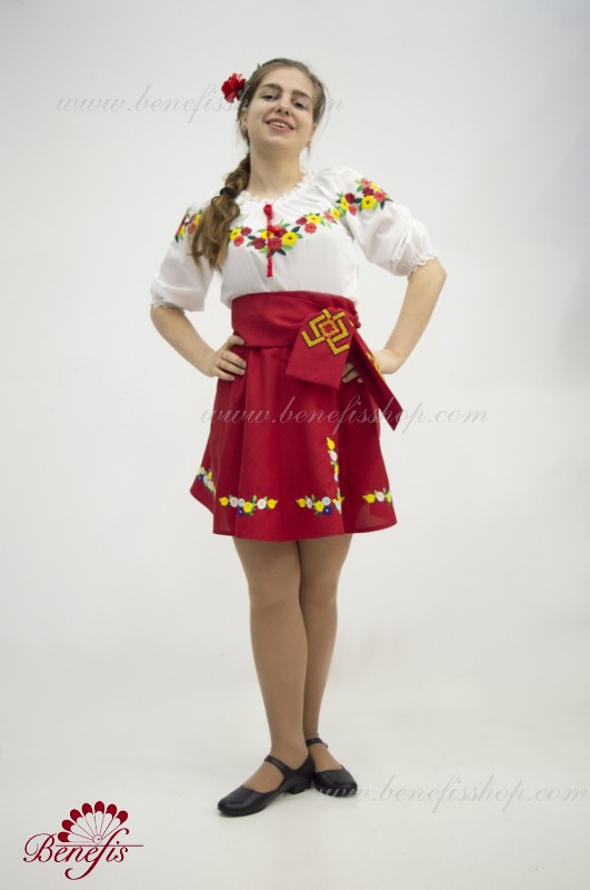 Bluza este confecționată din țesătură de cămașă. O bandă elastică este introdusă pe decolteu și mâneci și este decorată cu dantelă naturală. Broderia este realizată în stil național pe o mașină specială.