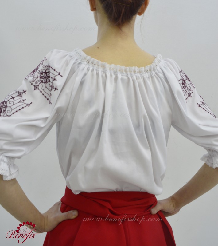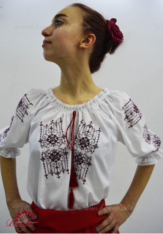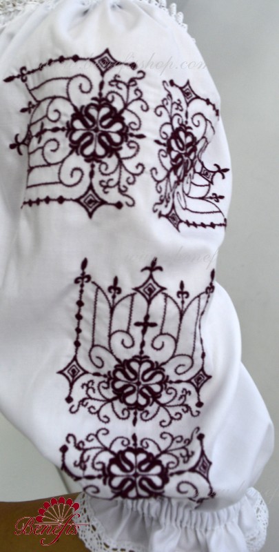 Bluza este confecționată din țesătură de cămașă. O bandă elastică este introdusă pe decolteu și mâneci și este decorată cu dantelă naturală. Broderia este realizată în stil național pe o mașină specială.