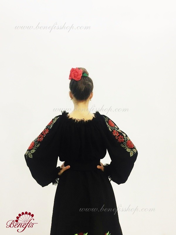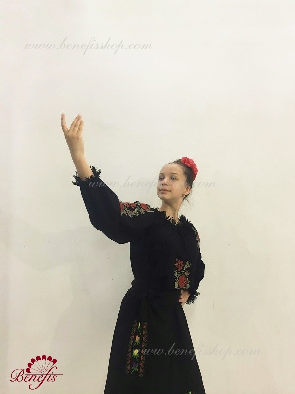 Bluza este confecționată din țesătură de cămașă. O bandă elastică este introdusă pe decolteu și mâneci și este decorată cu dantelă naturală. Broderia este realizată în stil național pe o mașină specială.