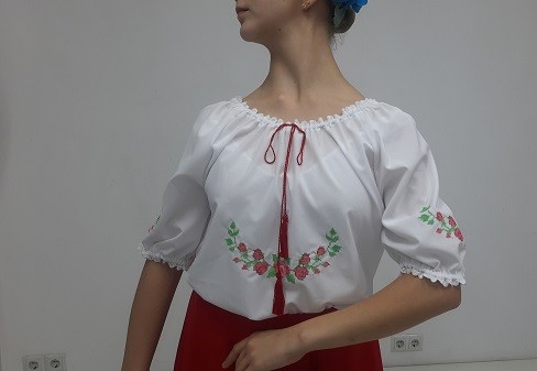 Bluza este confecționată din țesătură de cămașă. O bandă elastică este introdusă pe decolteu și mâneci și este decorată cu dantelă naturală. Broderia este realizată în stil național pe o mașină specială.Fusta și briul nu sunt incluse în preț. În plus cu bluza, puteți comanda o fustă J0368 și briul J0342.