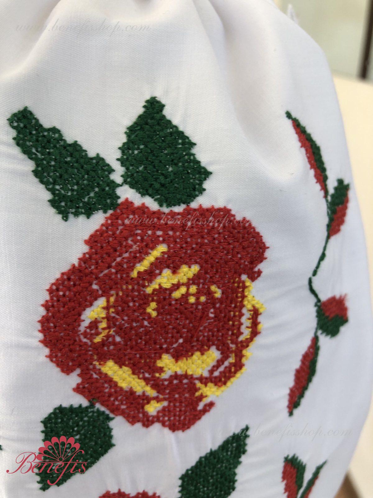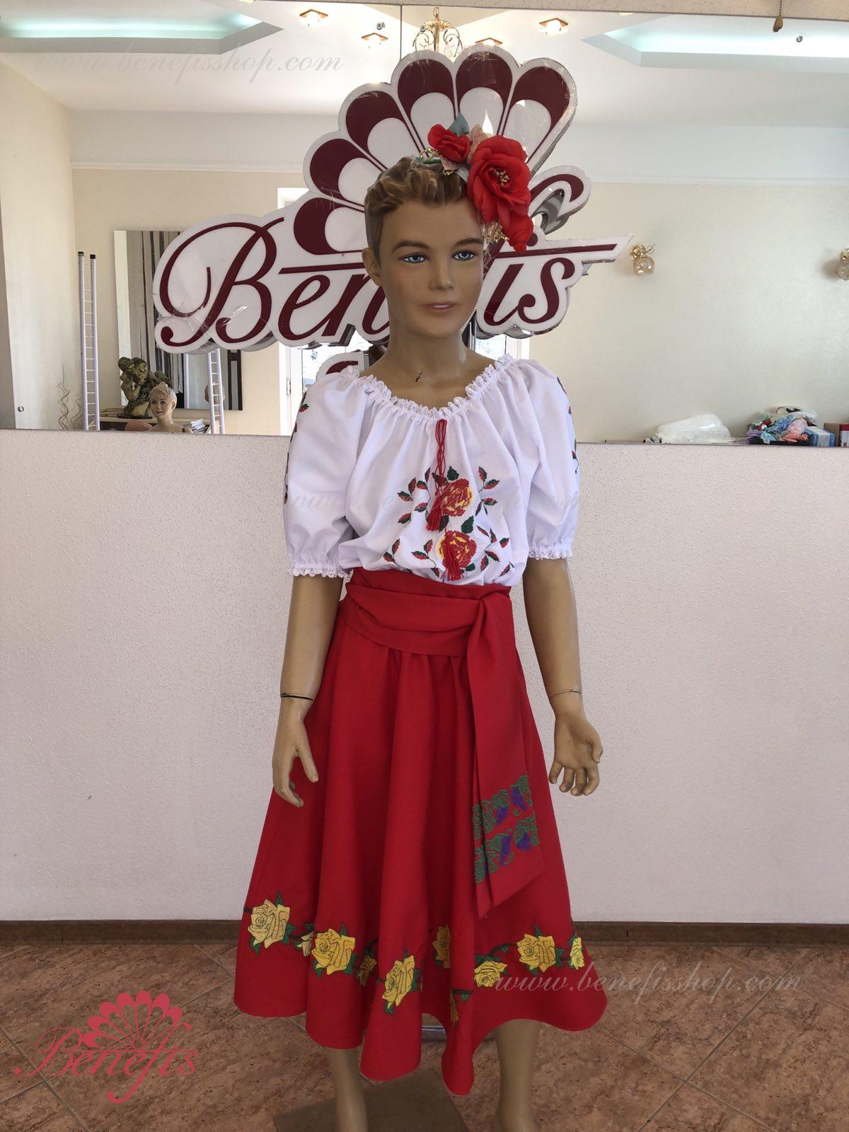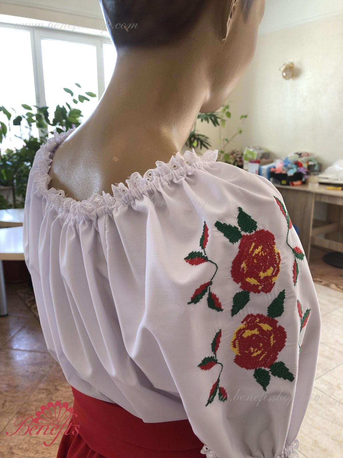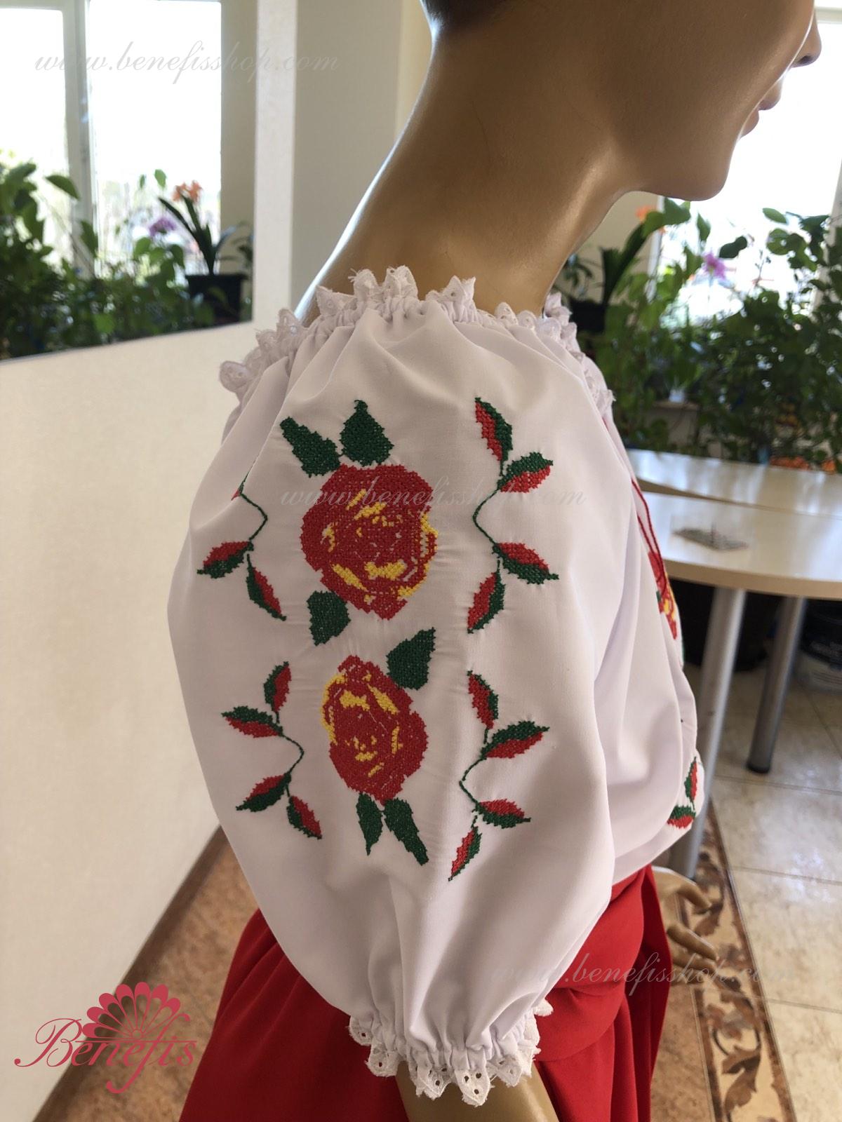 Bluza este confecționată din țesătură de cămașă. O bandă elastică este introdusă pe decolteu și mâneci și este decorată cu dantelă naturală. Broderia este realizată în stil național pe o mașină specială.