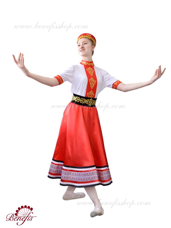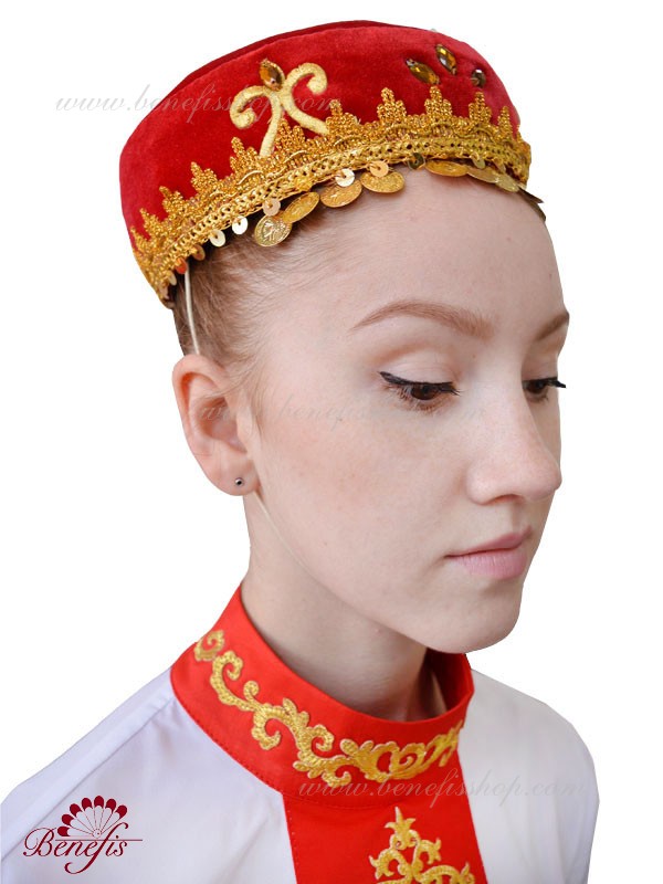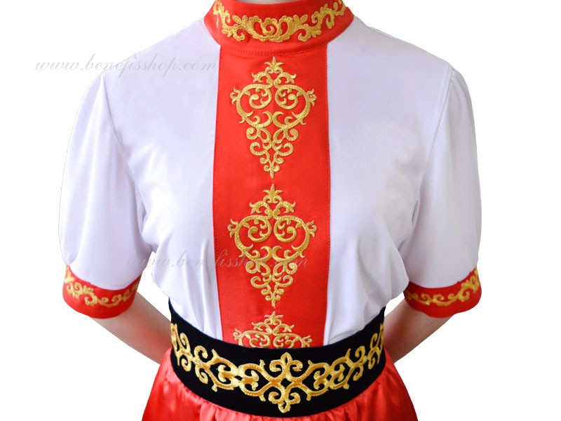 Bluza este confectionata din sifon creponat (vascoza). Cu inserții roșii decorative din aplicații de culoare aurie.