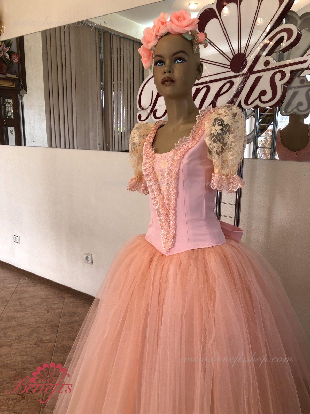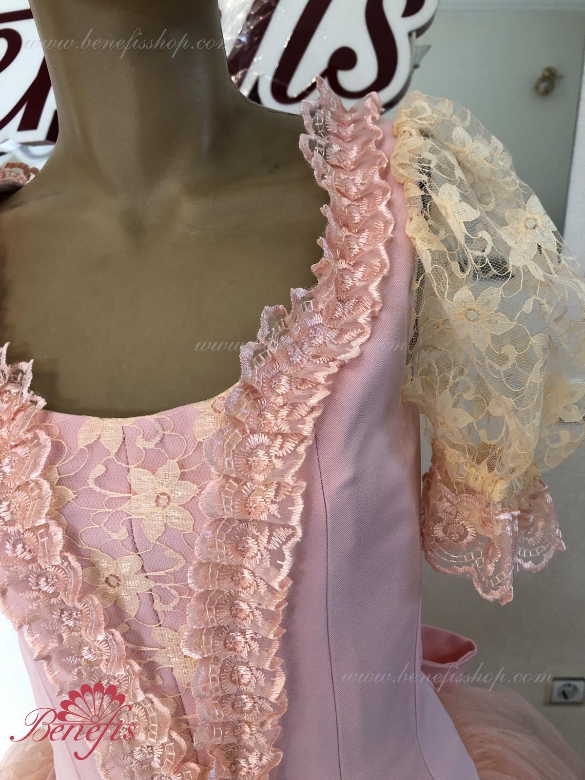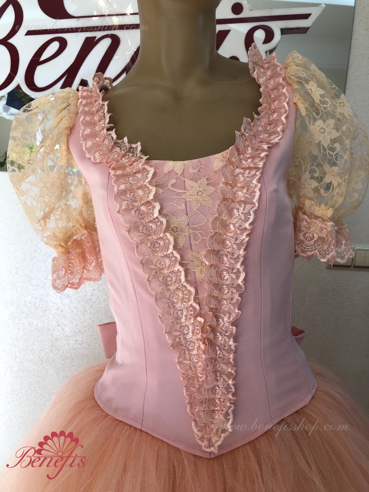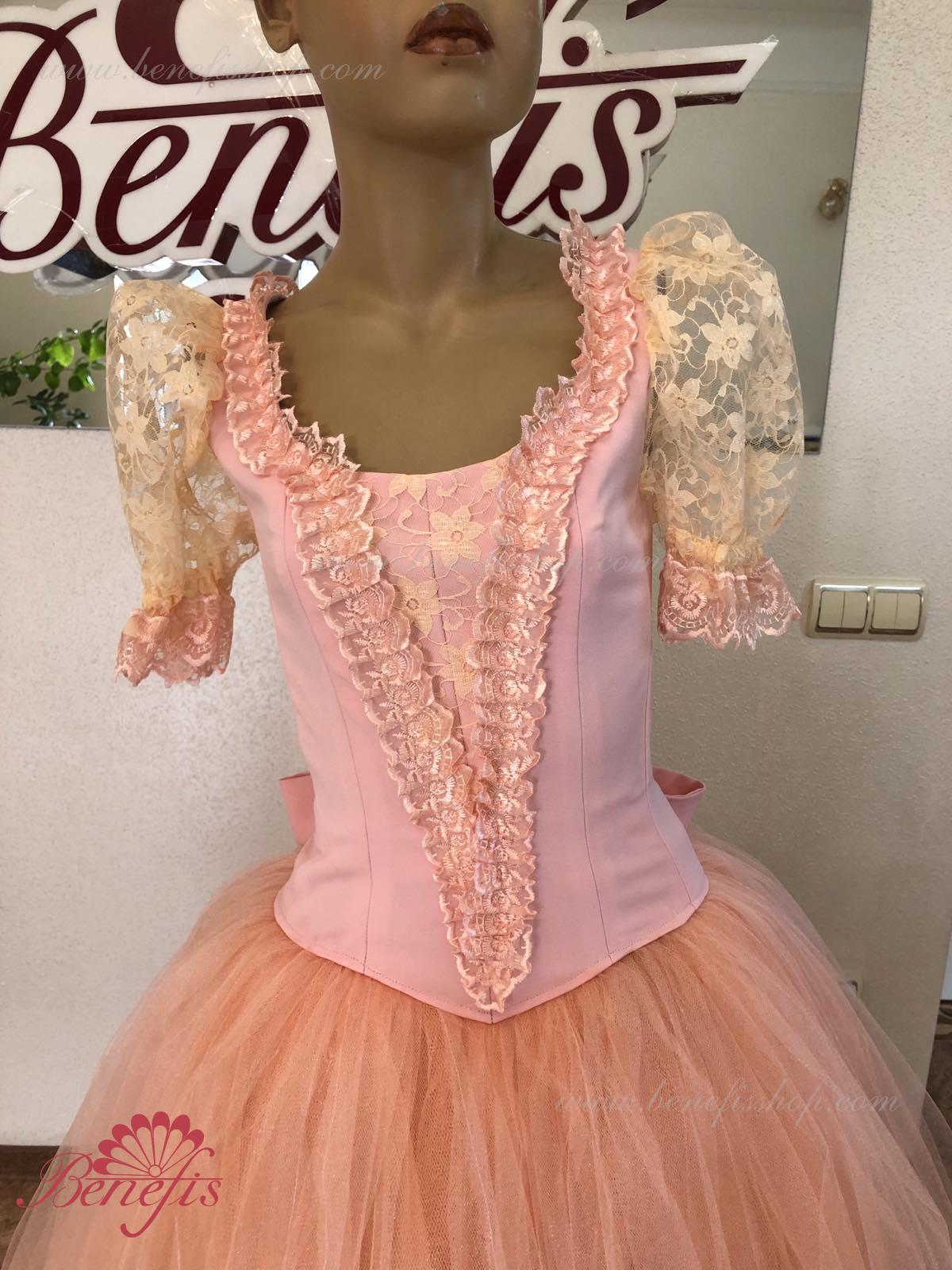 Acest costum profesional de scenă este realizat pe baza fustei romantice de bază T 0003. Corsetul din țesătură densă semi-elastică este fixat la spate cu două rânduri de cârlige și bucle. Pentru comoditate, corsetul este reglabil cu șireturi în zona pieptului. Mânecile și pelerina sunt realizate din guipure închis la culoare, împodobite cu dantelă. Un decolteu adânc pe spate și o fundă conferă costumului mai multă eleganță. Croitoresele profesionale lucrează la costum, și costumul pot fi realizat în orice culoare la cererea clientului.