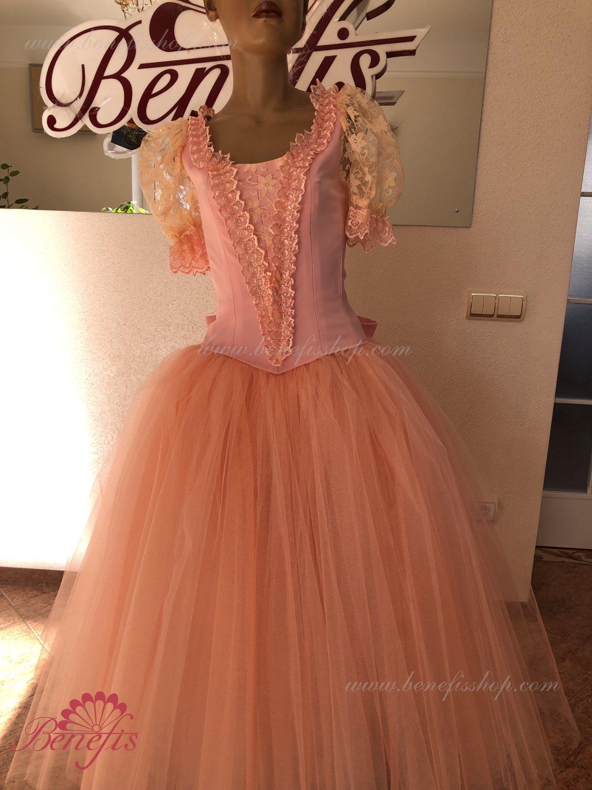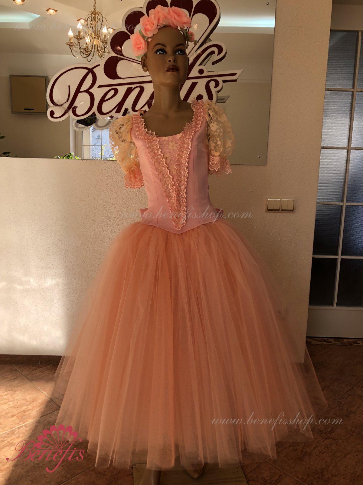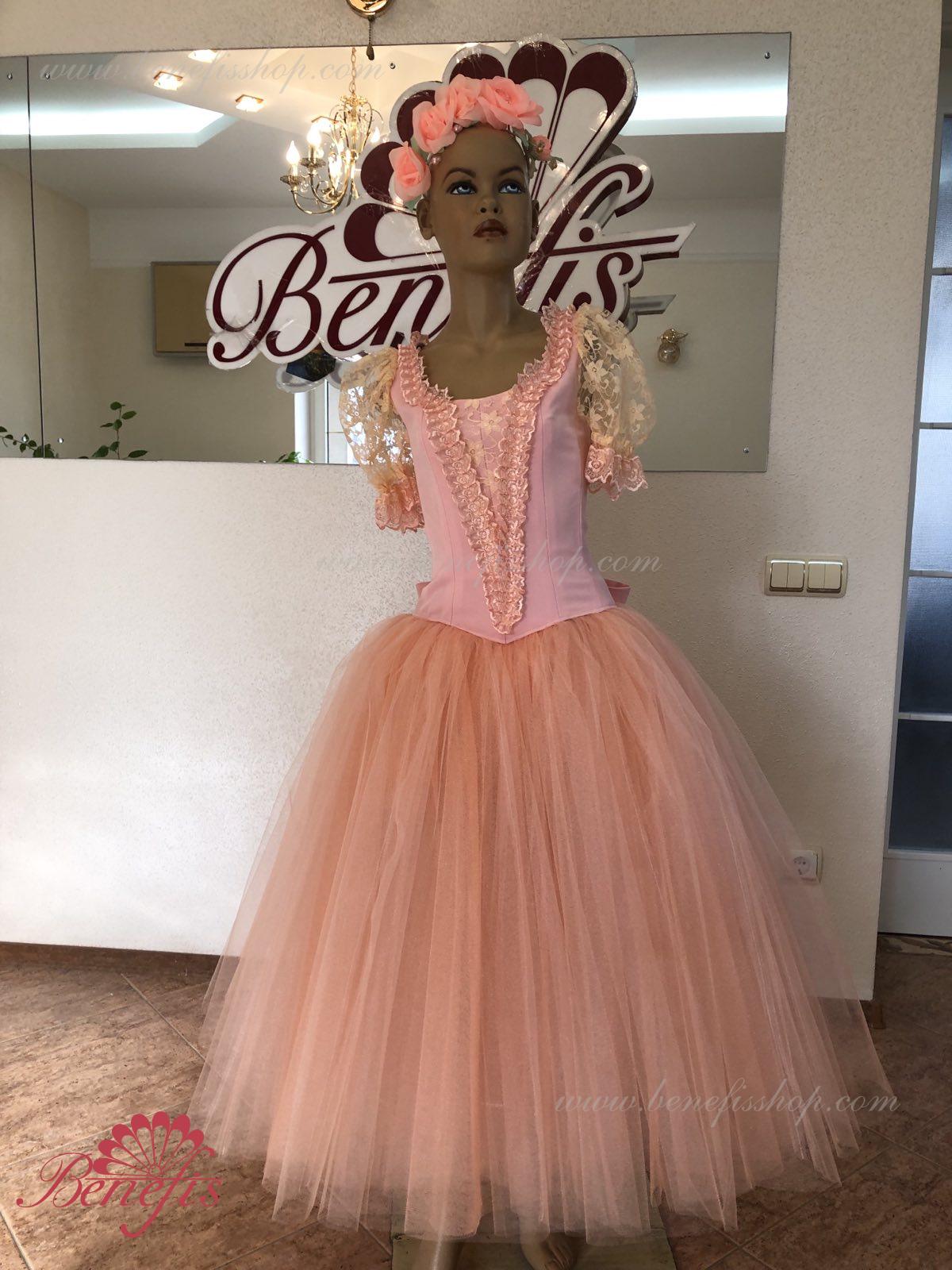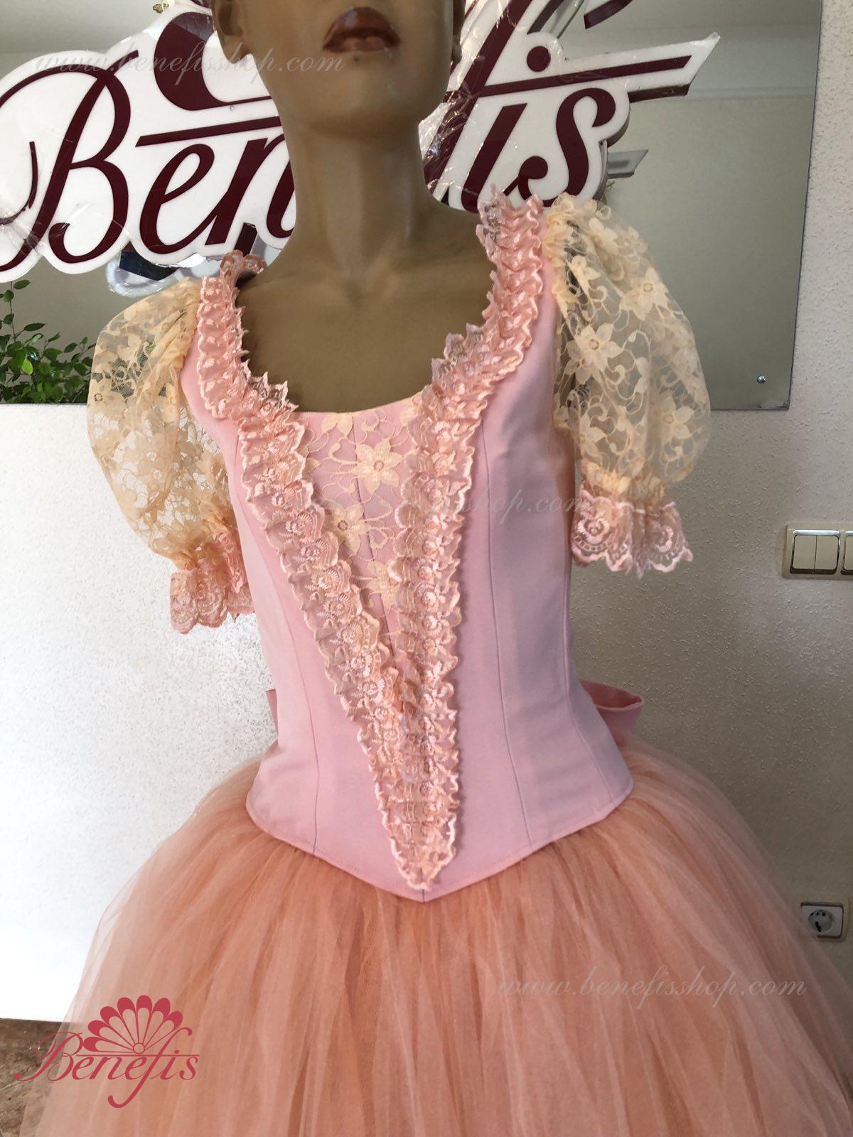 Acest costum profesional de scenă este realizat pe baza fustei romantice de bază T 0003. Corsetul din țesătură densă semi-elastică este fixat la spate cu două rânduri de cârlige și bucle. Pentru comoditate, corsetul este reglabil cu șireturi în zona pieptului. Mânecile și pelerina sunt realizate din guipure închis la culoare, împodobite cu dantelă. Un decolteu adânc pe spate și o fundă conferă costumului mai multă eleganță. Croitoresele profesionale lucrează la costum, și costumul pot fi realizat în orice culoare la cererea clientului.
