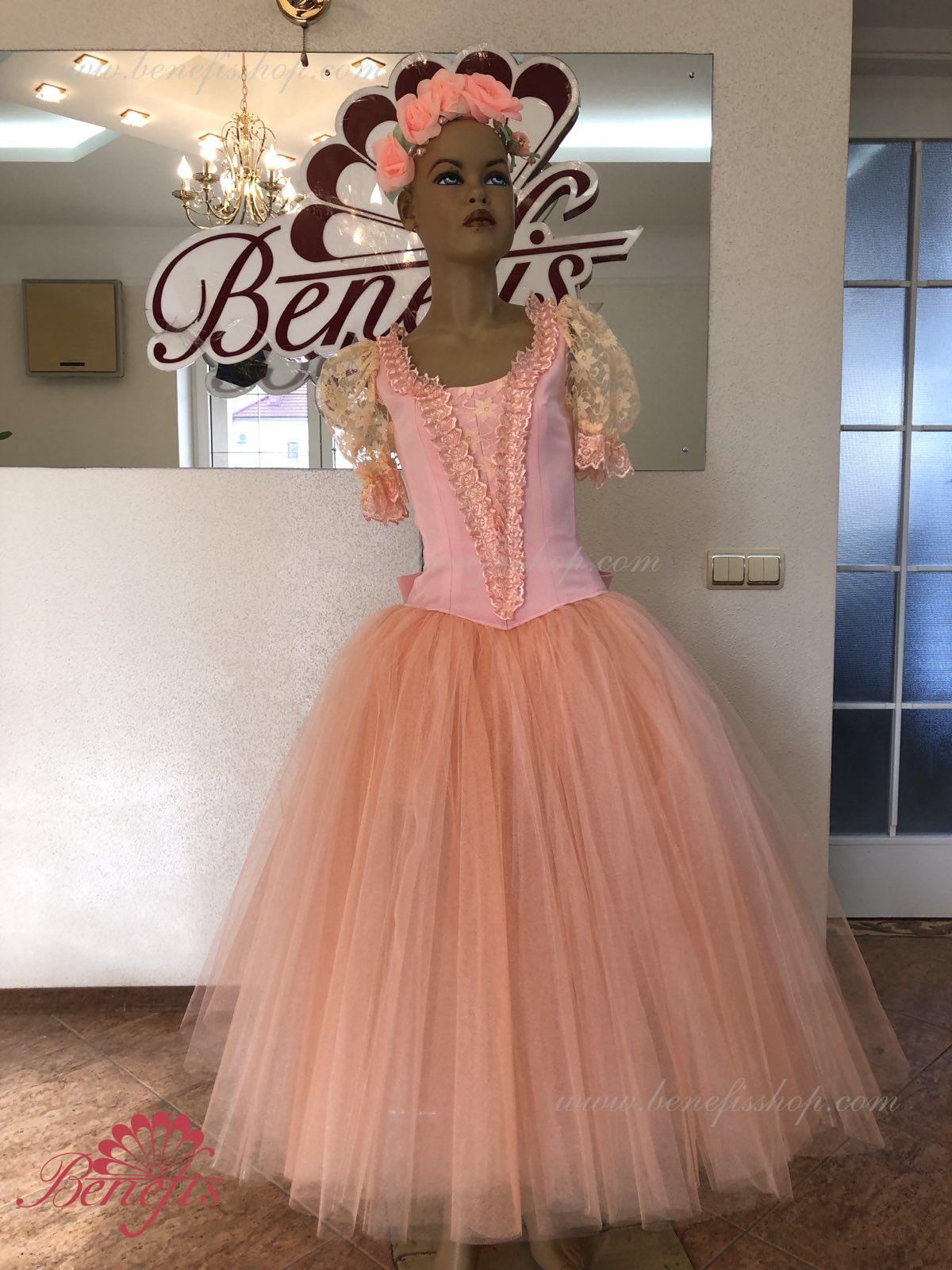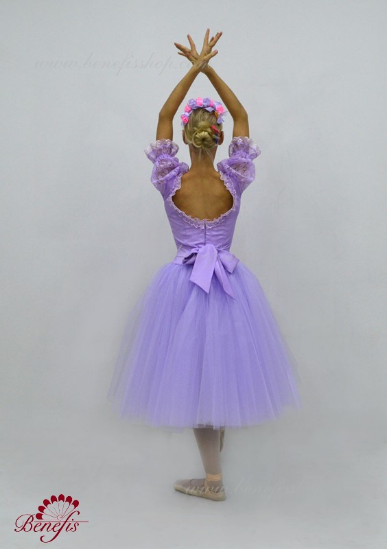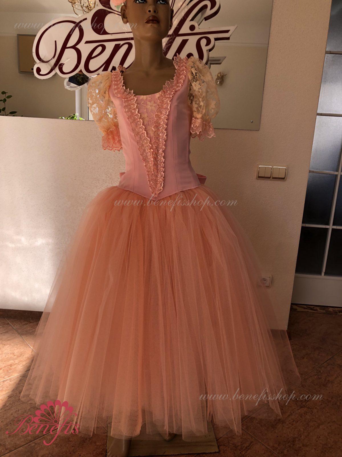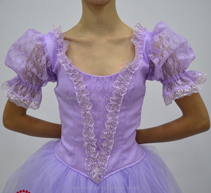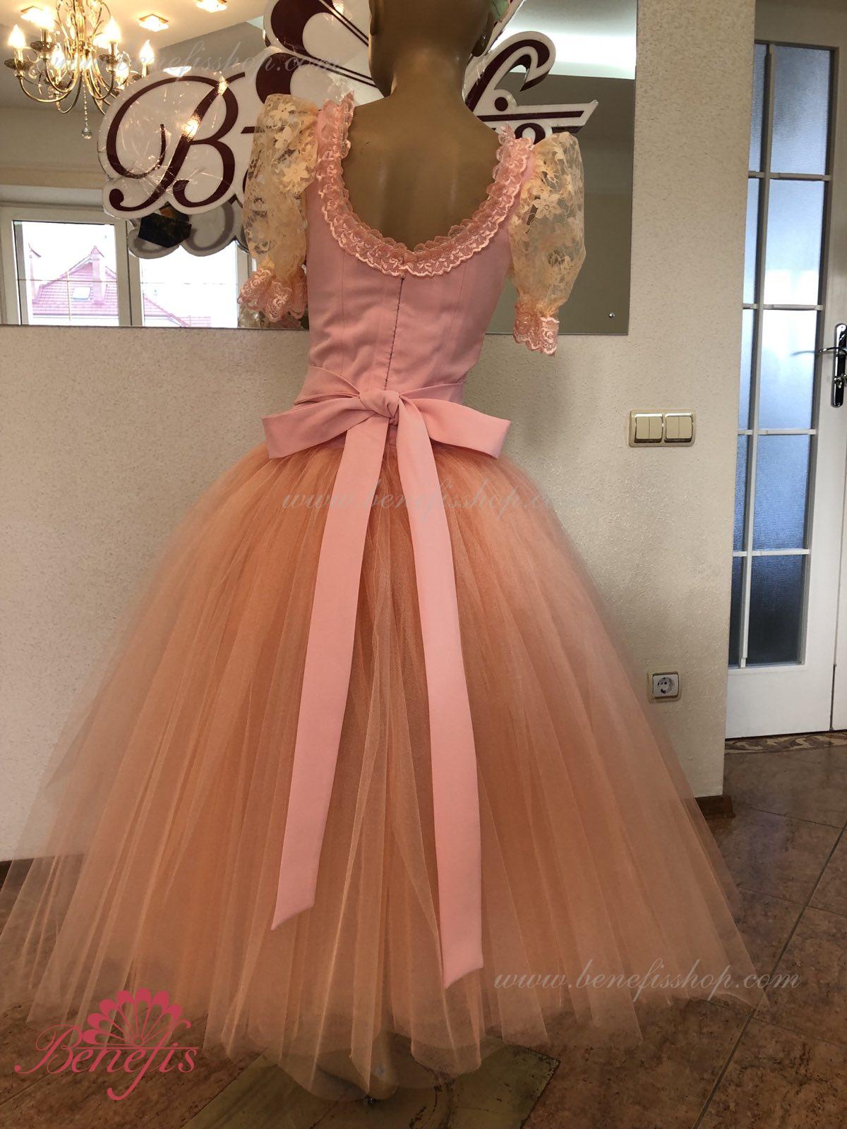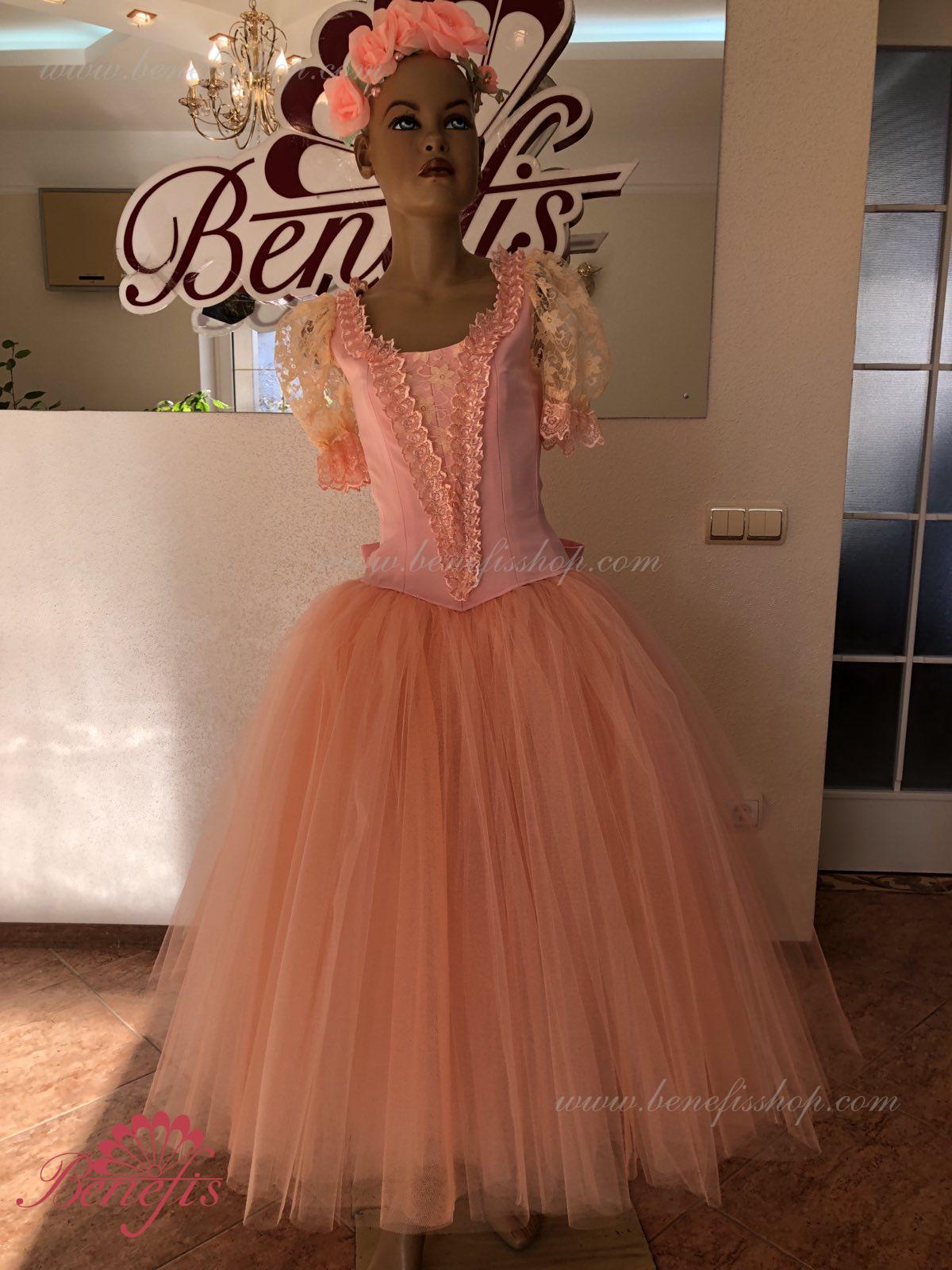 Acest costum profesional de scenă este realizat pe baza fustei romantice de bază T 0003. Corsetul din țesătură densă semi-elastică este fixat la spate cu două rânduri de cârlige și bucle. Pentru comoditate, corsetul este reglabil cu șireturi în zona pieptului. Mânecile și pelerina sunt realizate din guipure închis la culoare, împodobite cu dantelă. Un decolteu adânc pe spate și o fundă conferă costumului mai multă eleganță. Croitoresele profesionale lucrează la costum, și costumul pot fi realizat în orice culoare la cererea clientului.