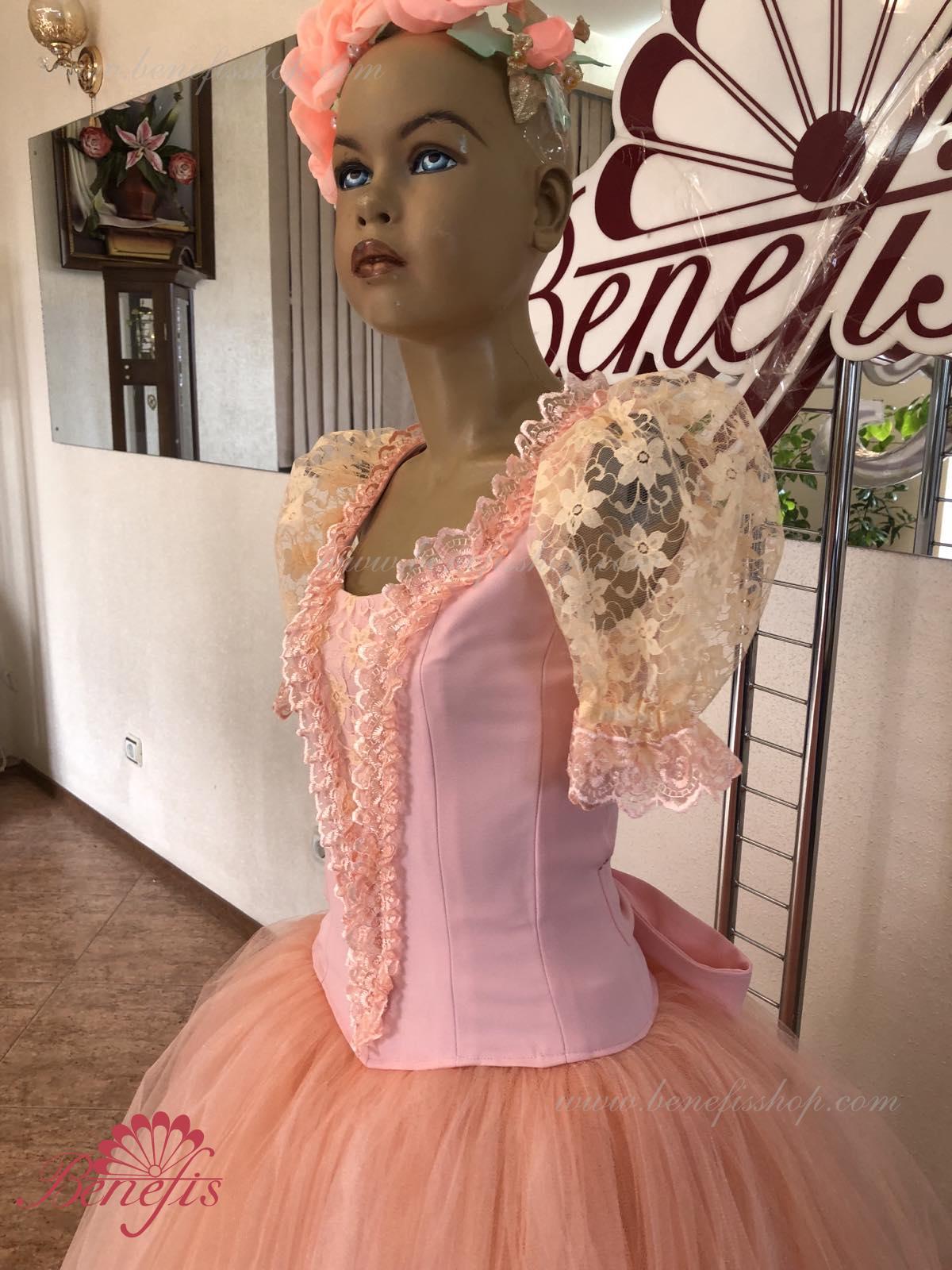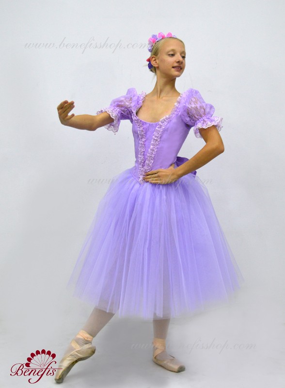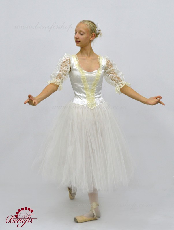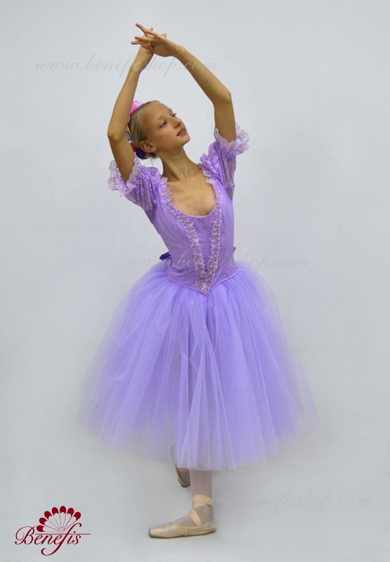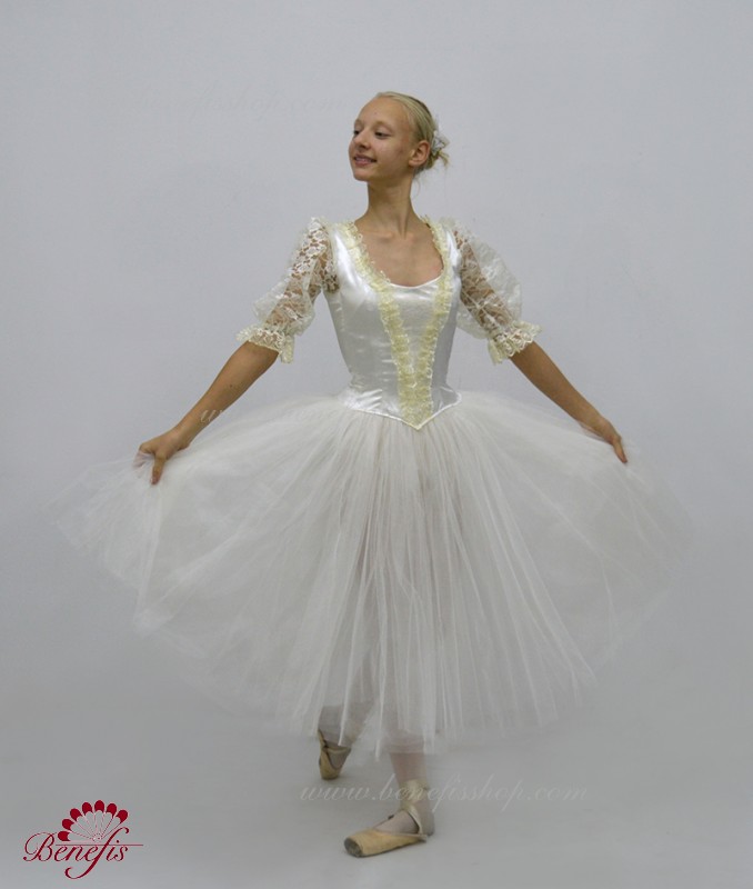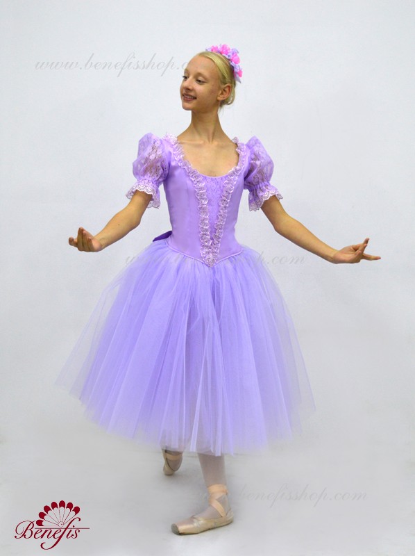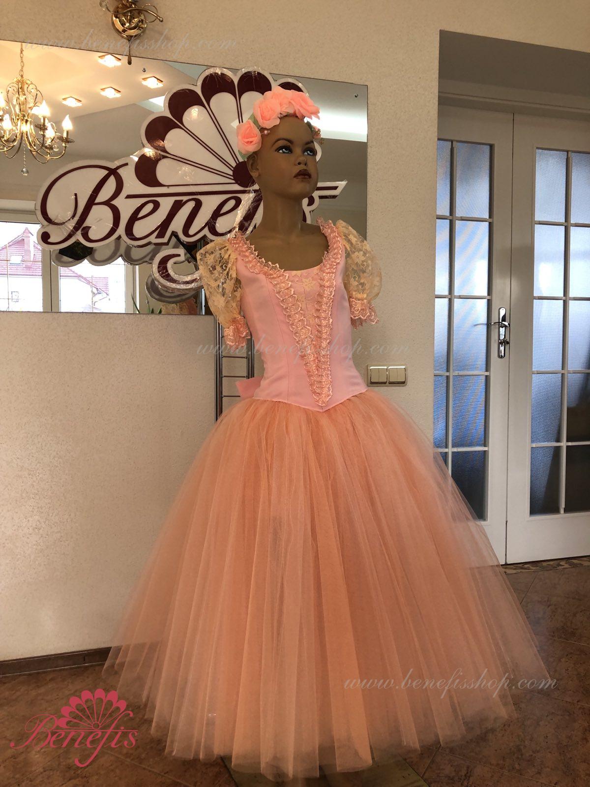 Acest costum profesional de scenă este realizat pe baza fustei romantice de bază T 0003. Corsetul din țesătură densă semi-elastică este fixat la spate cu două rânduri de cârlige și bucle. Pentru comoditate, corsetul este reglabil cu șireturi în zona pieptului. Mânecile și pelerina sunt realizate din guipure închis la culoare, împodobite cu dantelă. Un decolteu adânc pe spate și o fundă conferă costumului mai multă eleganță. Croitoresele profesionale lucrează la costum, și costumul pot fi realizat în orice culoare la cererea clientului.