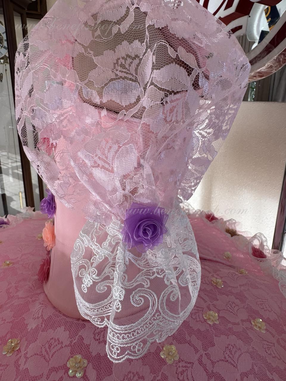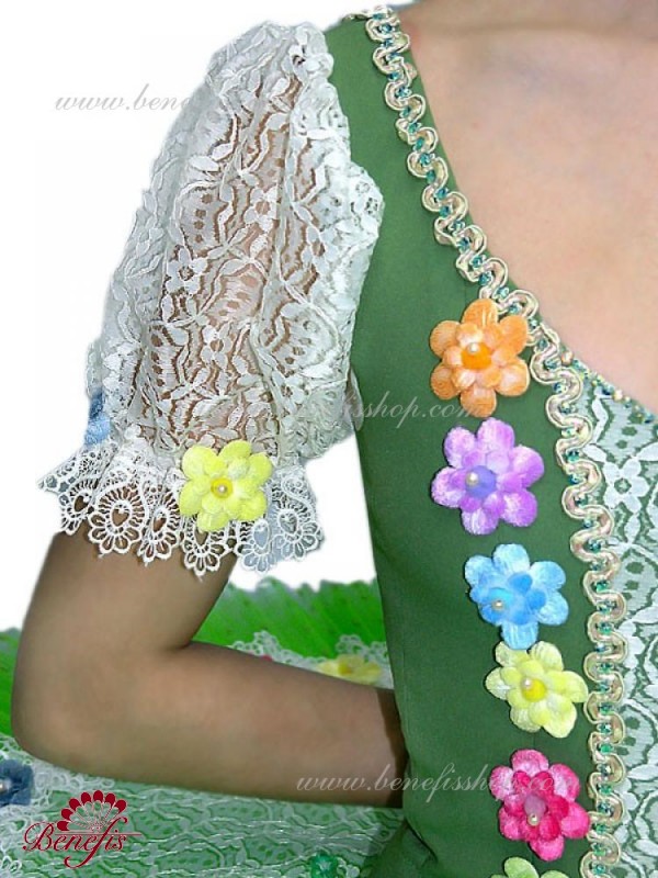 Anvelopa, inserția de pe partea din față a corsetului și mânecile sunt realizate din ghipură. Anvelopa și mânecile sunt împodobite cu dantelă.