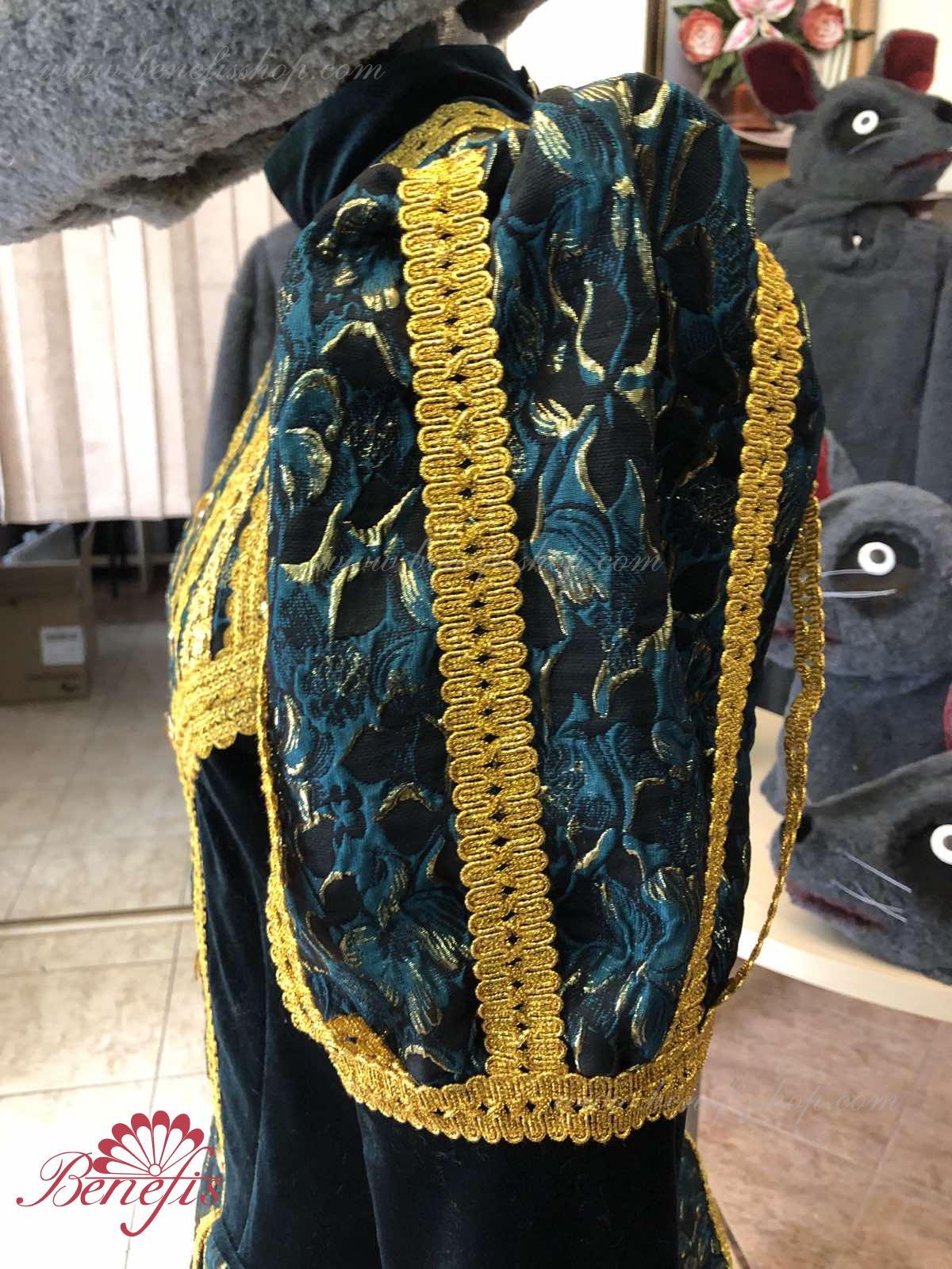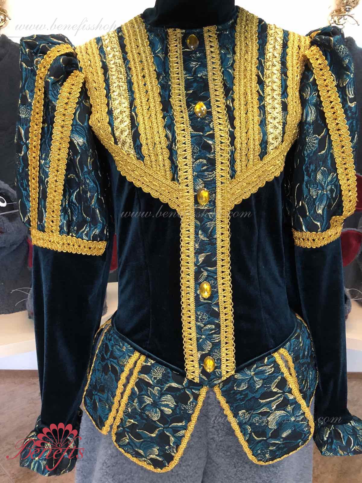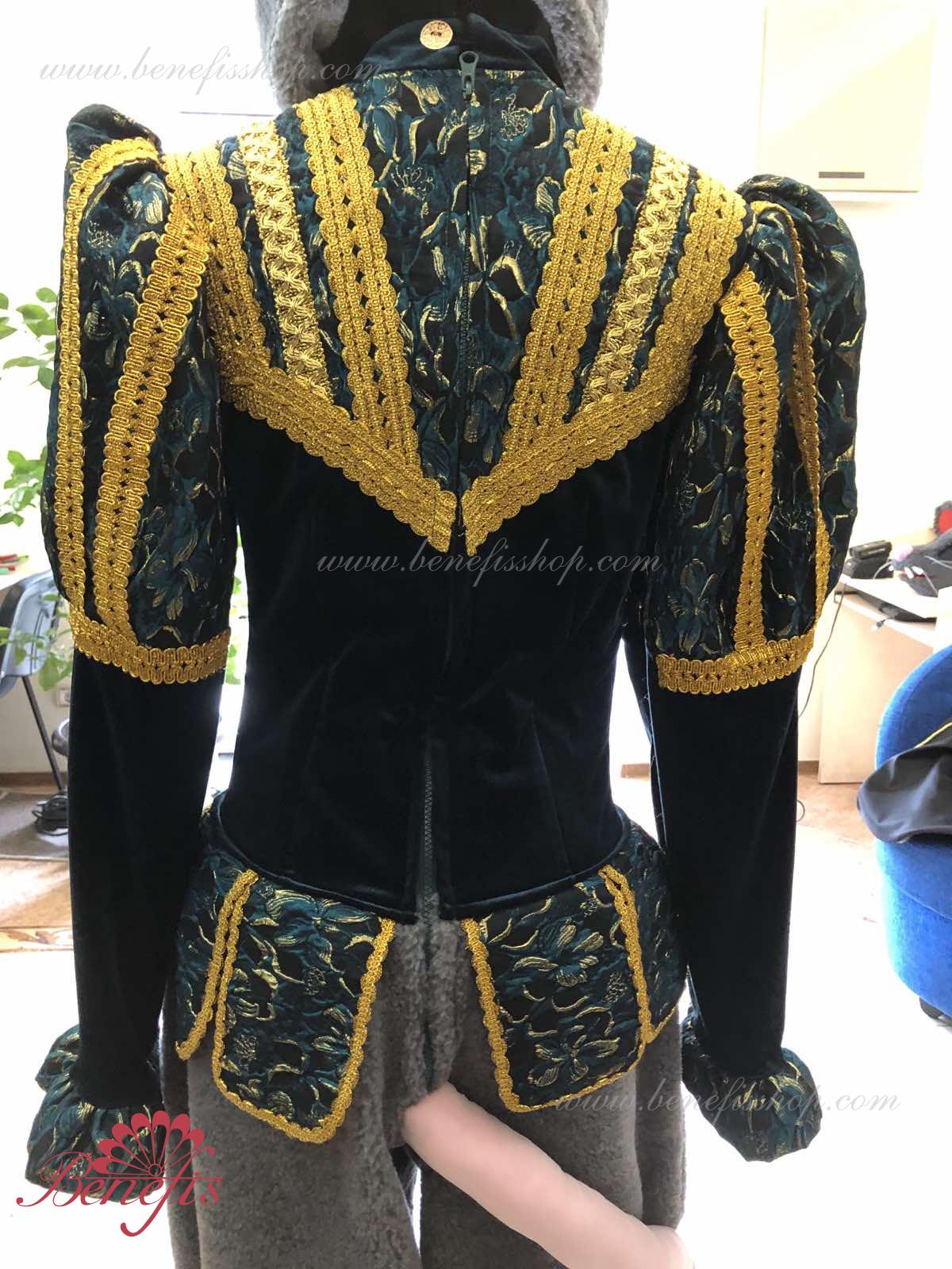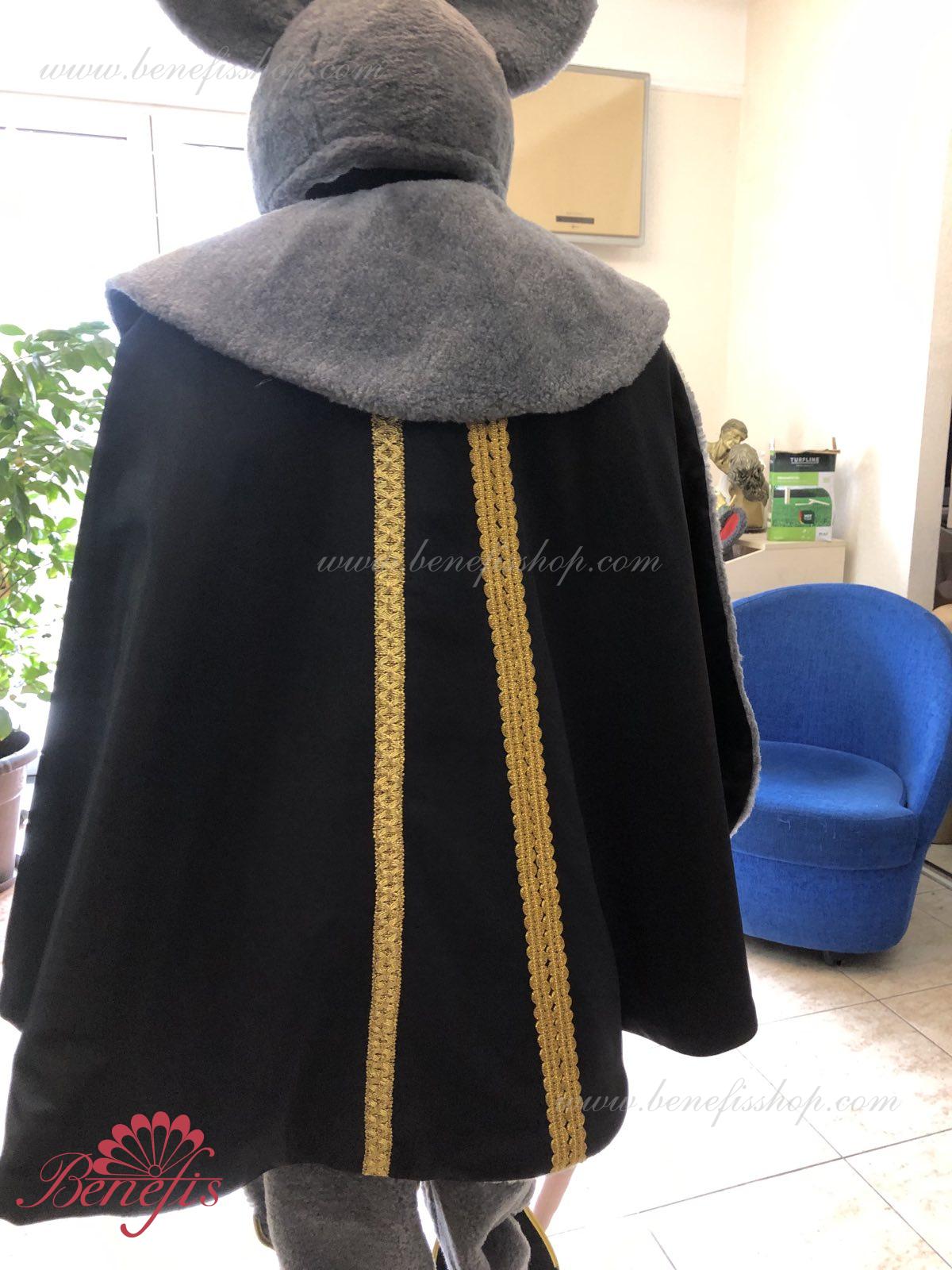 Detalii costum: guler, pelerină, pantaloni scurți, ghetre, Mască de blană cu coroană atașată cu pietre. Țesături precum brocart bogat imprimat și catifea semi-elastică sunt utilizate pentru colier. Jacheta este decorată cu panglică de aur și butoane, țesăturile de blană sunt de asemenea folosite în costum, care dau costumului o imagine de scenă a unui șobolan pentru balet, "Spărgătorul de nuci".