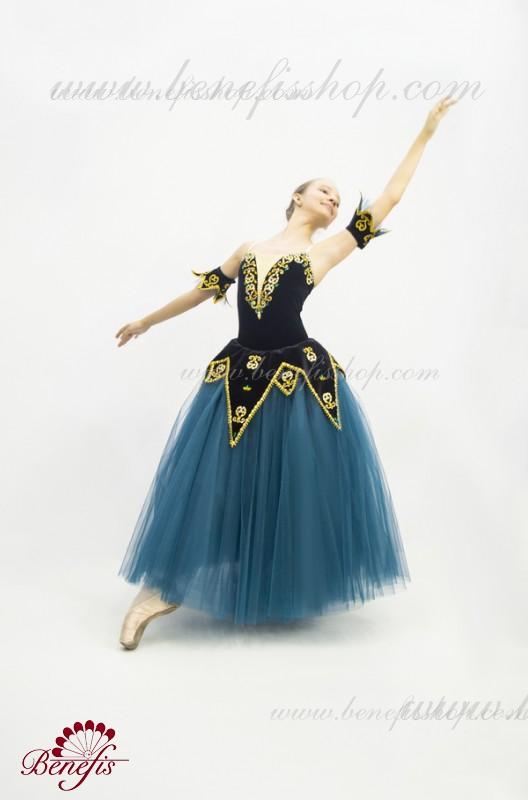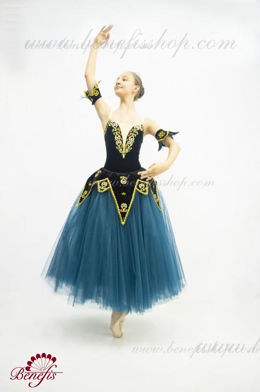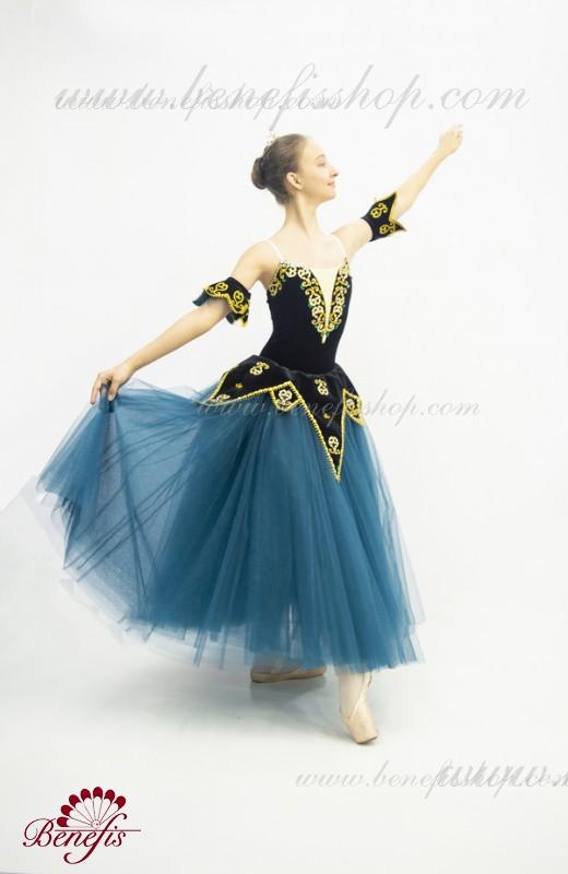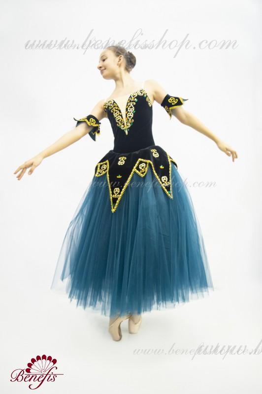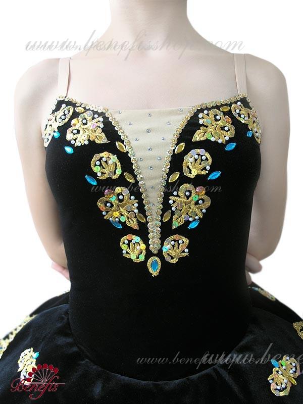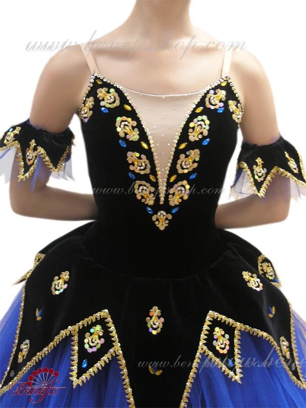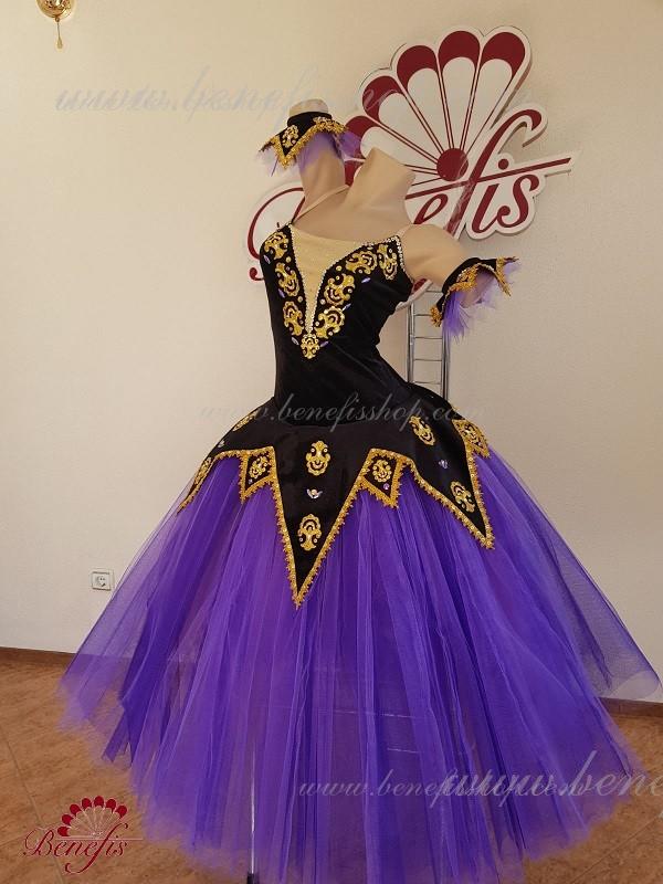 Acest costum de scenă profesional este realizat pe baza unui costum de baie din catifea elastică cu un peplum atașat sub formă de forme triunghiulare lungi și scurte.