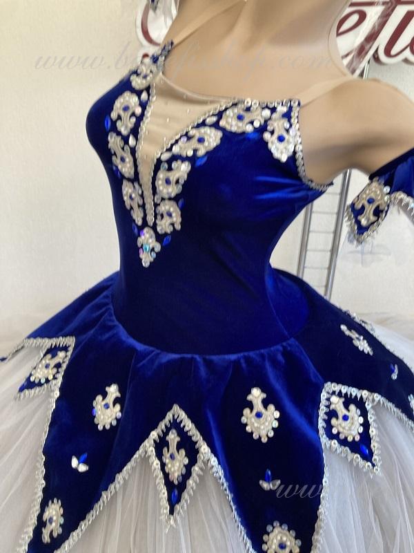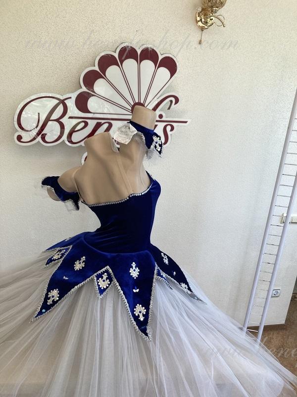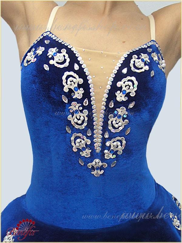 Ca decor al costumului, s-au folosit modele de aplicații, paiete, strasuri alungite de culoarea cristalului de rocă și s-au adăugat câteva perle, care se potrivesc perfect cu culoarea albastru intens, cu toate acestea, costumul poate fi de orice culoare.